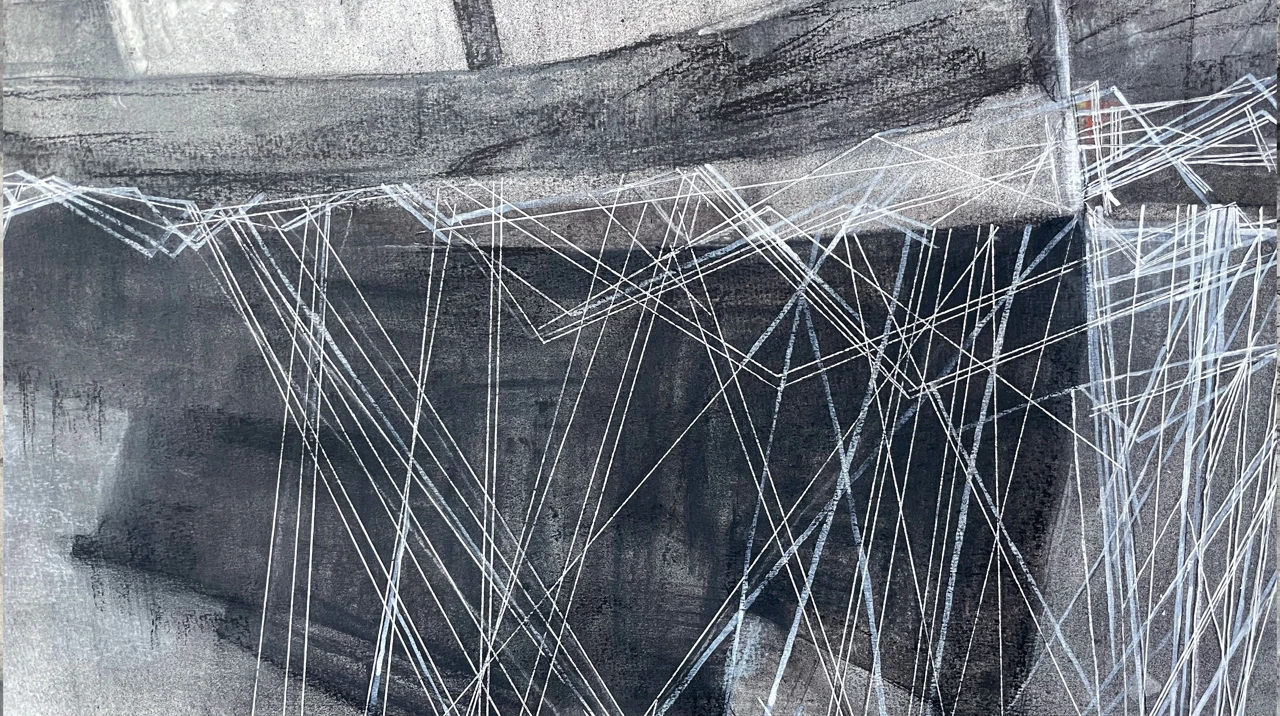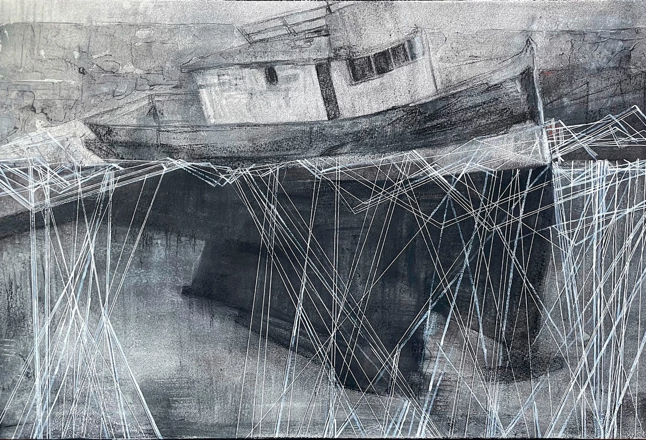 В серии «Заброшенные корабли» я обращаюсь к теме памяти, забвения и разрушения. Я работаю на стыке графики и живописи, используя уголь, акрил, темперу, сочетая их с фактурными слоями, создающими ощущение размытости и зыбкости воспоминаний. Линии в моих работах напоминают сети или трещины. Они символизируют следы прошлого и связи между пространством, историей и человеком.