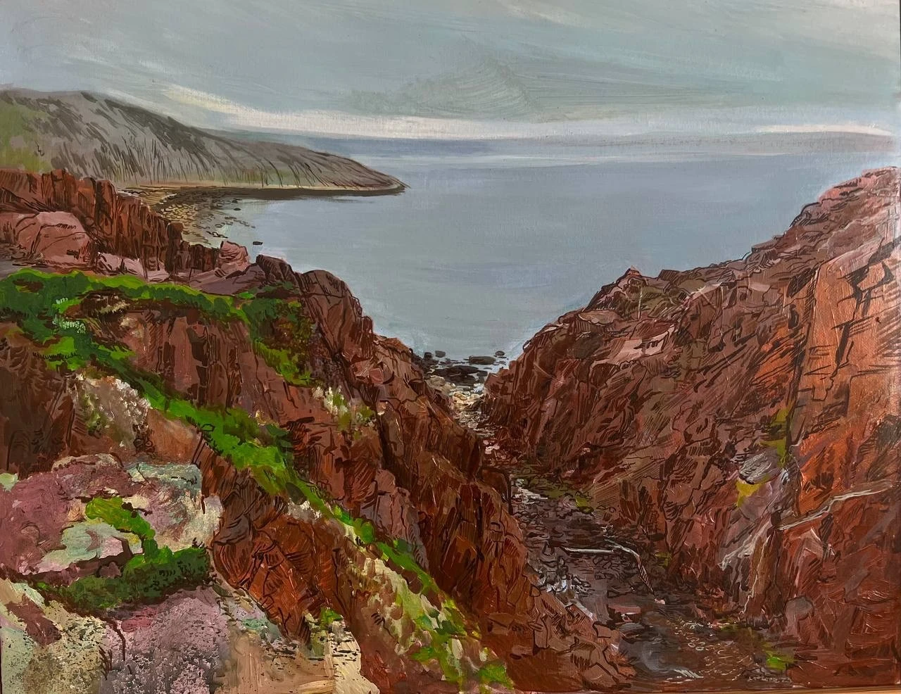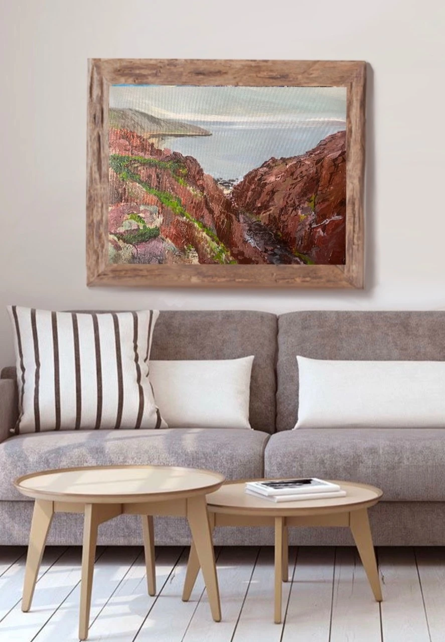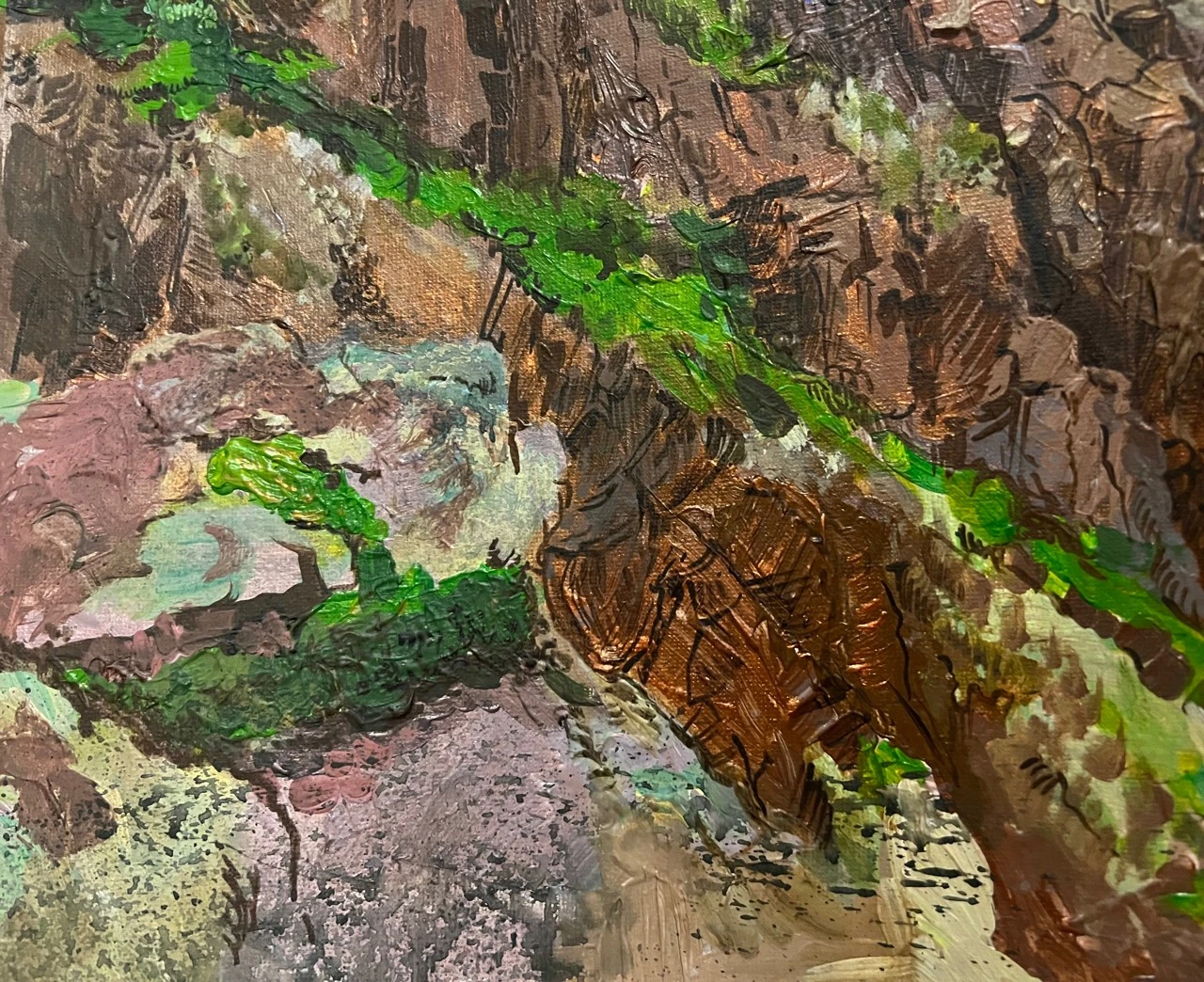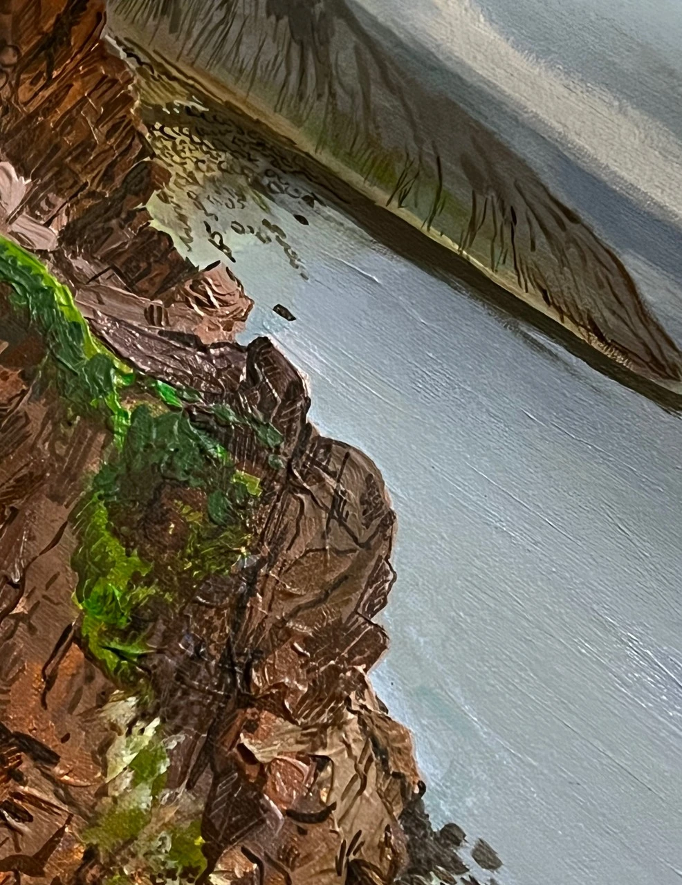 Работа передает атмосферу влажного прохладного дня там, где ущелье водопада соединяется с большой спокойной водой Баренцевого моря, резко контрастирующей с текстурой валунов. Использование медной краски для камней придает изображению металлический блеск, создавая эффект влажной поверхности и холодного мерцания. Акриловые маркеры добавляют графичности и подчёркивают текстурные детали камней.