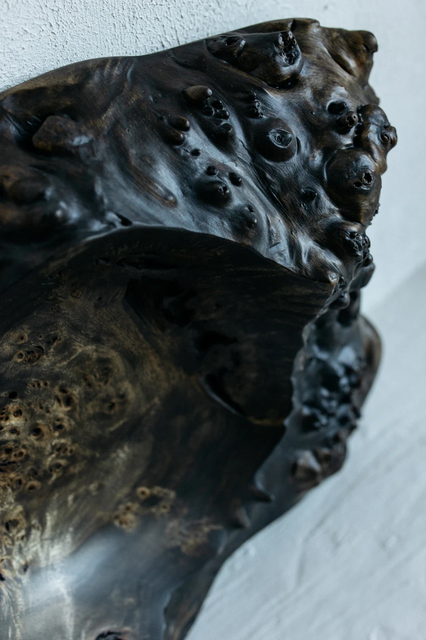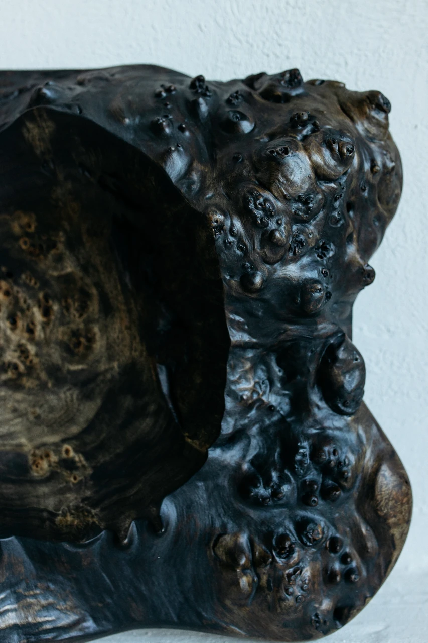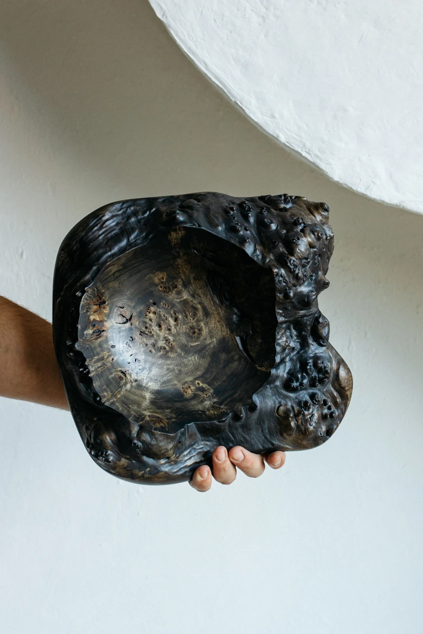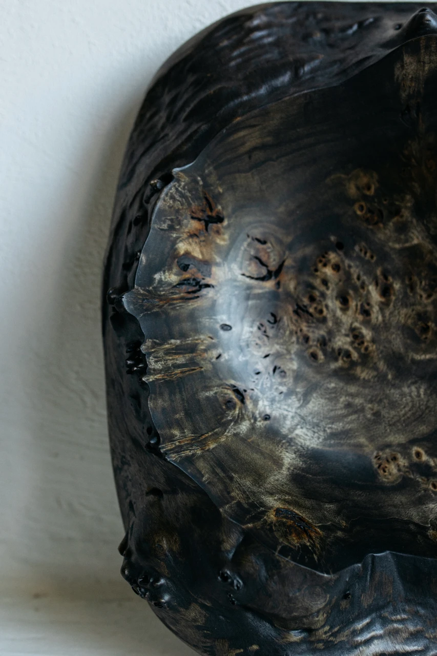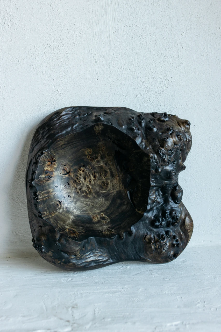Декоративное блюдо будто сделано из мрамора, в гладкой поверхности которого отражаются янтарным блеском переливы рельефа капа горного тополя.
