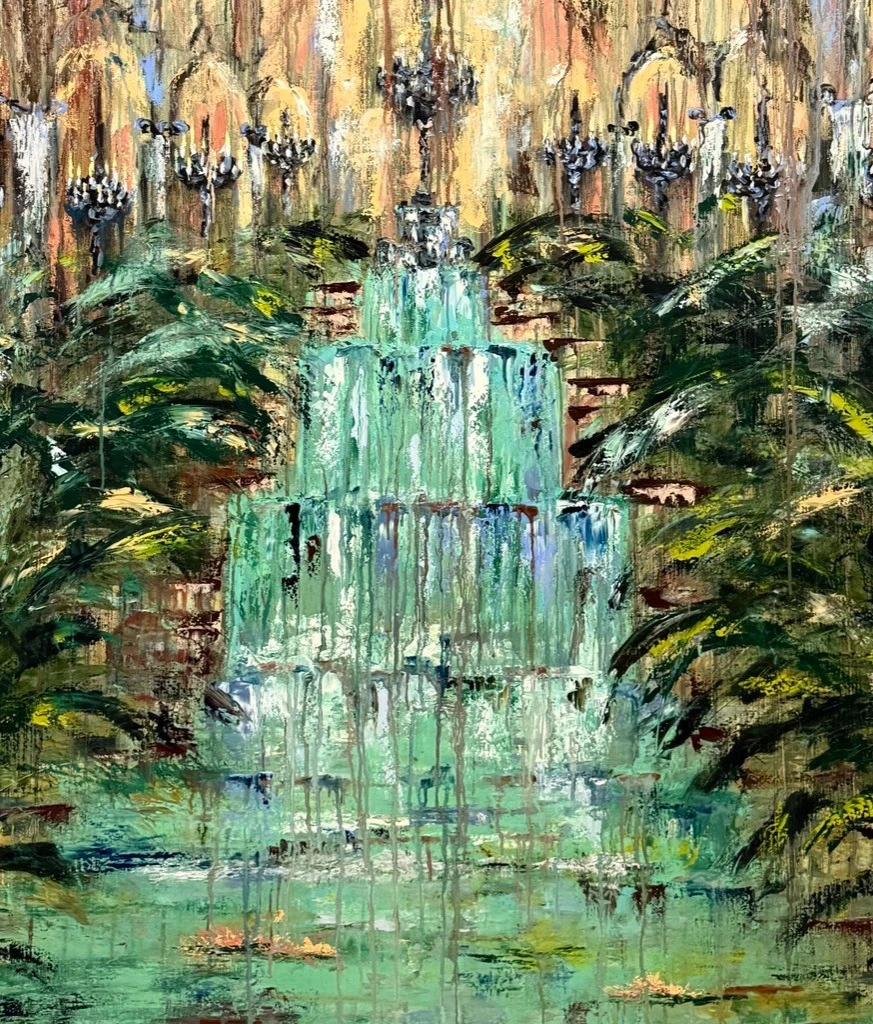 Растения обрамляют водопад, словно подчеркивая гармонию между стихиями — водой и землей. Это метафора поддержки, гармонии, внутренней силы. Люстры, висящие над водопадом, символизируют свет, «освещение» жизненного пути. Это и воспоминания, которые сопровождают нас, это духовные ориентиры, помогающие не потеряться в потоке жизни. Гулять вдоль водопада жизни — это осознанно проживать каждый момент, наблюдать за течением времени, не пытаясь его остановить, но и не теряя связи с собой.