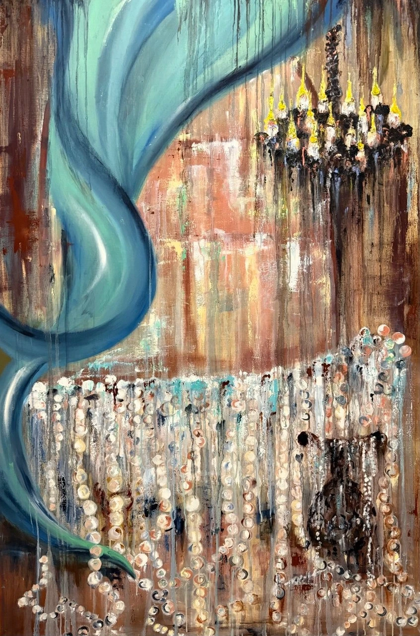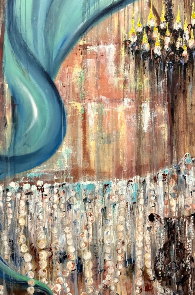 Картина наполнена символизмом и эмоциями, приглашает зрителя погрузиться в поток личных воспоминаний и чувств. Люстра с множеством огней — символ памяти, ярких моментов прошлого, которые продолжают светить в сознании, несмотря на течение времени. Россыпь жемчужин — это мгновения жизни, «россыпь воспоминаний» , которые складываются в единую картину прошлого. «Купаться» — значит полностью отдаваться потоку воспоминаний, позволять им «омывать» сознание, переживать заново эмоции прошлого, менять отношение к ним.