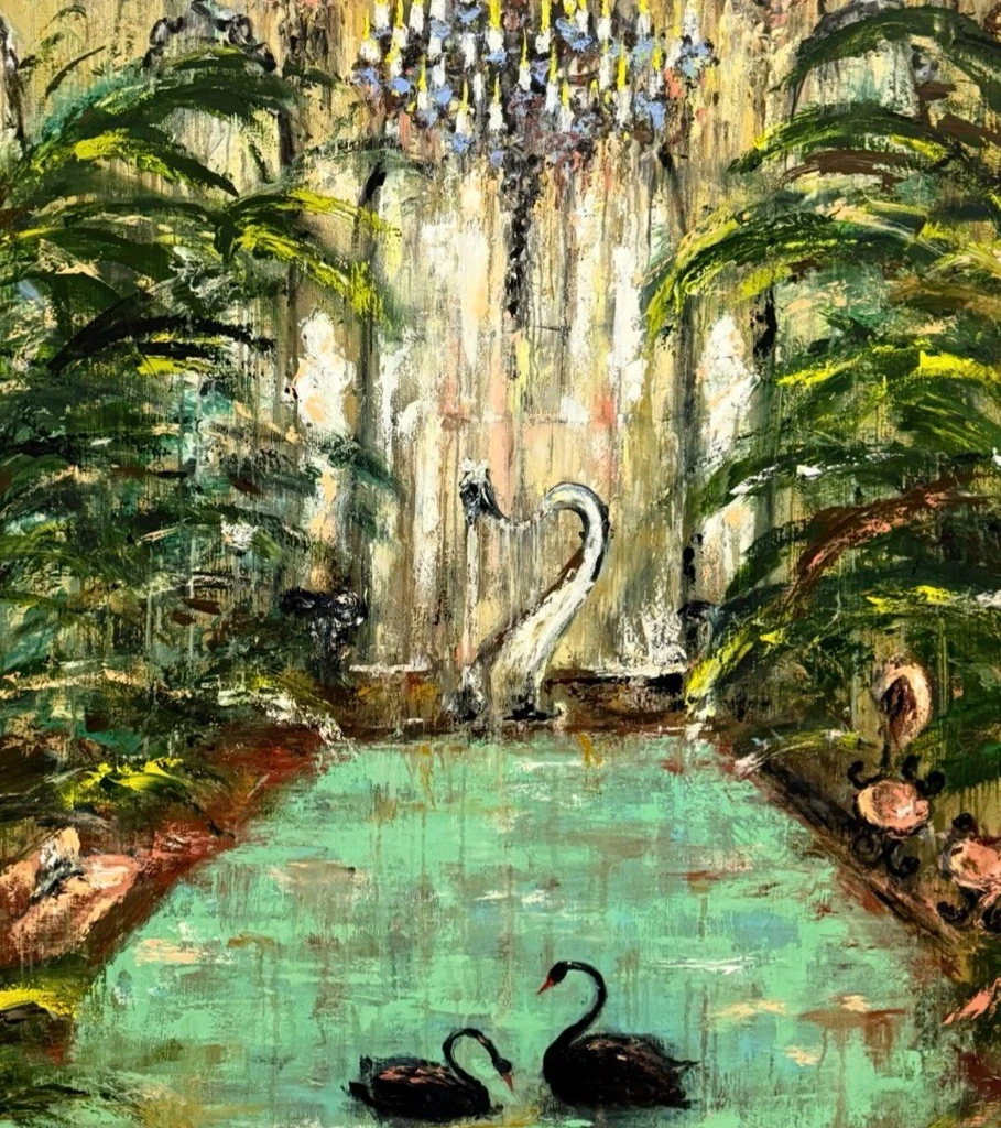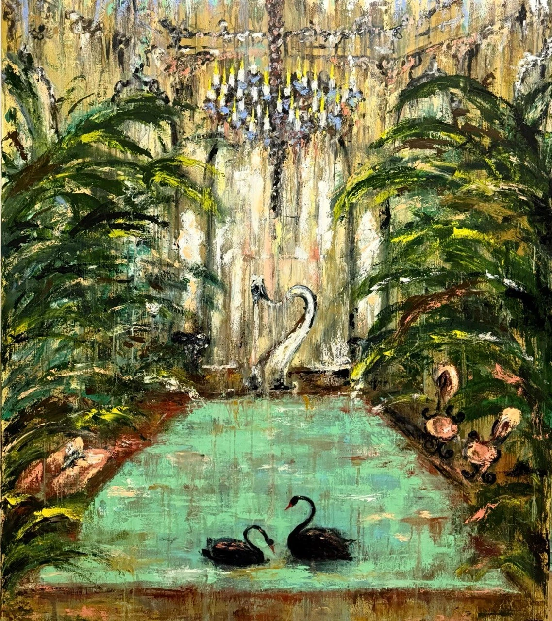 Лебеди символизируют любовь, верность и гармонию. Сад спрятан от посторонних глаз. В нем звучит музыка, слышен шелест листьев. Это укромный уголок, где можно остаться наедине с чувствами, забыть о суете, спрятаться от мира.