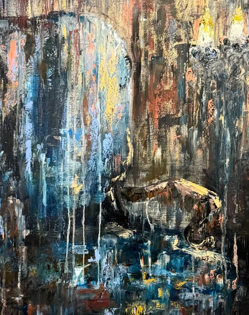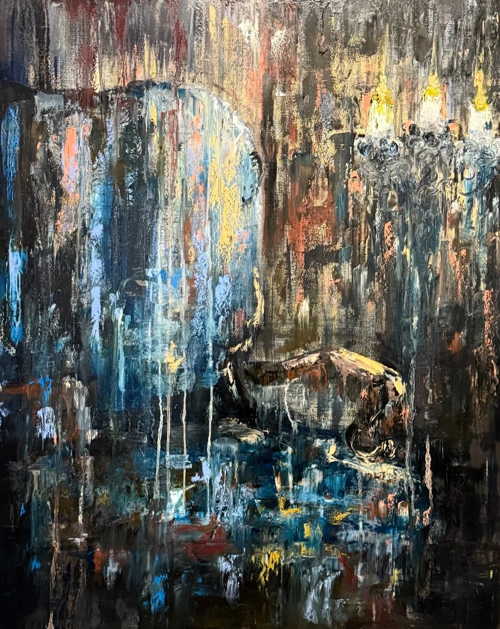 Работа о погружении в глубины собственного «я», о встрече лицом к лицу со своими мыслями, страхами, желаниями. Одиночество здесь — не изоляция, а ресурс. Возможность услышать себя. Тонкие линии и потеки краски подчеркивают, как легко нарушить гармонию с самом собой. Картина передает момент глубокой рефлексии, когда человек переосмысливает свою жизнь. Это пространство для искреннего диалога с самим собой.