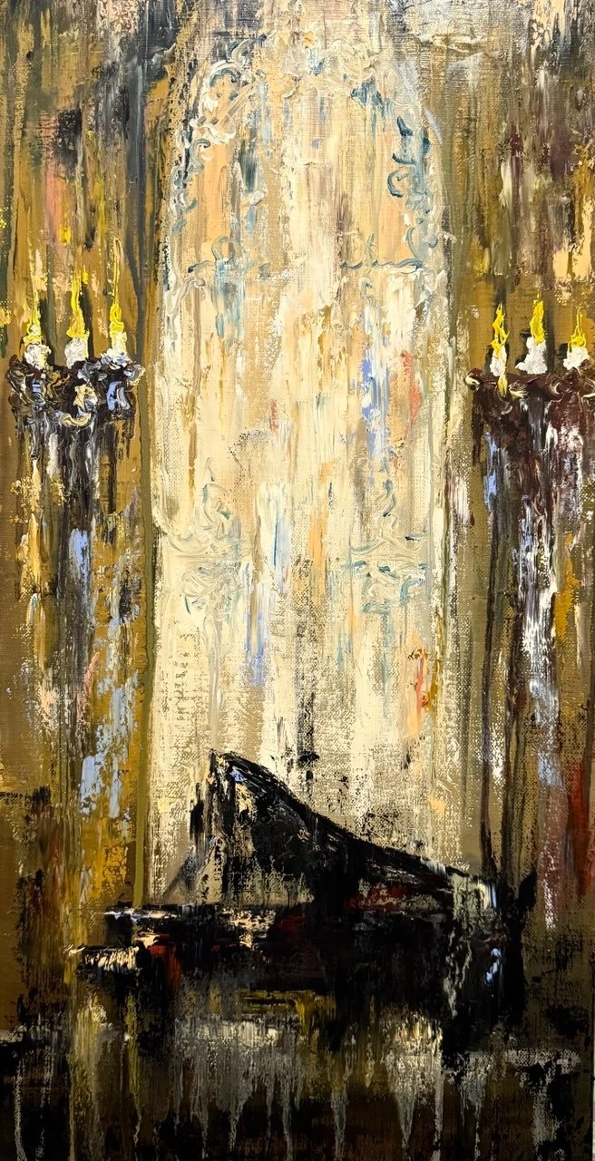 Пламя свечей подчеркивает хрупкость момента, его особую ценность. Размытые, текучие мазки передают эхо звуков, течение времени, эмоциональную глубину. Картина приглашает остановиться, прислушаться к внутренней мелодии, к эху теплых воспоминаний.