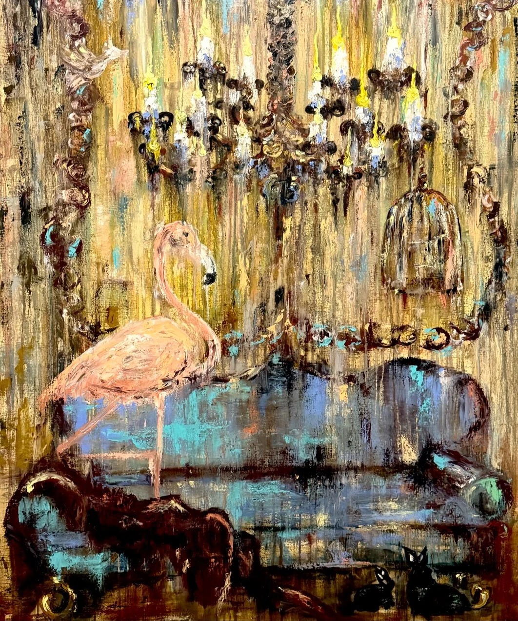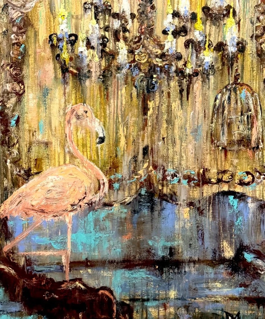 Фламинго традиционно ассоциируется с грацией, экзотикой, а так же с мечтами и свободой. Фламинго, стоящий на старинном диване, словно воплощает встречу реального (интерьер, мебель) с фантастическим. Это символ того, как мечты могут «поселиться» в обыденной жизни.