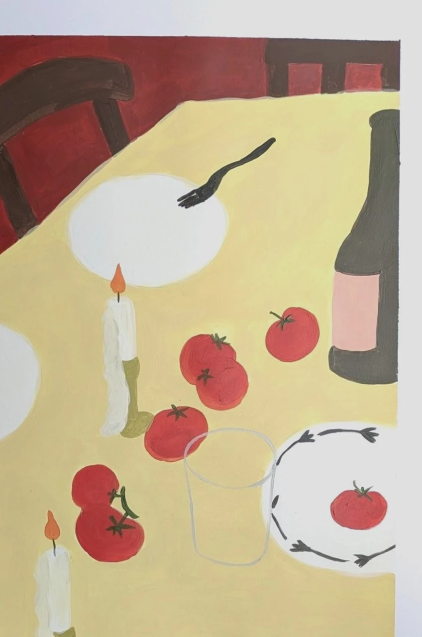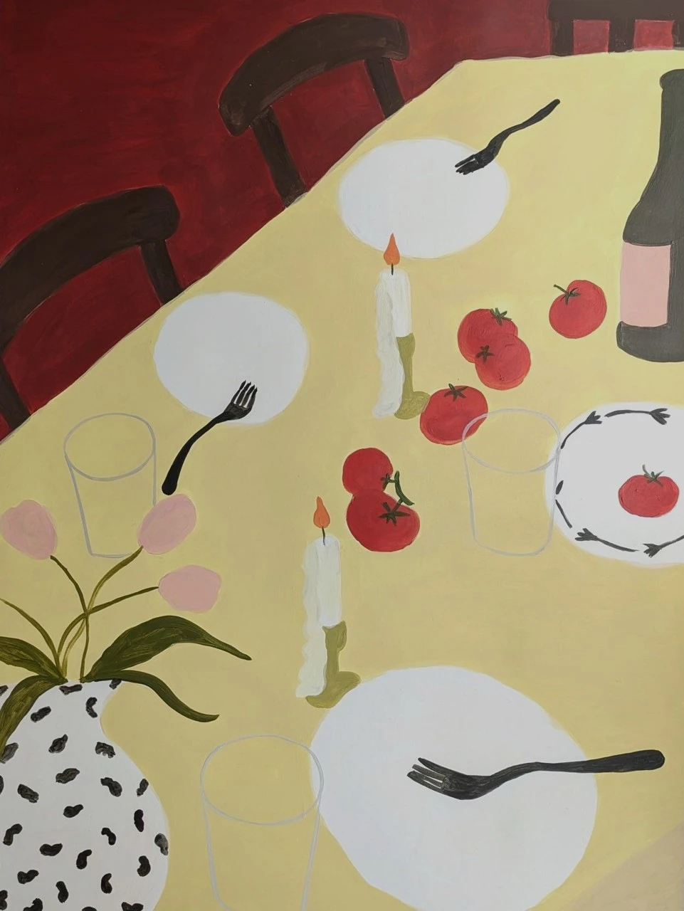 На этой яркой и красочной картине изображен уютный стол, накрытый желтой скатертью, на которой гармонично расположены белые тарелки, металлические вилки и современная ваза со свежими цветами. В центре стола располагается несколько насыщенно-красных томатов, которые привлекают внимание своим аппетитным видом и контрастируют с желтой скатертью. На столе горят свечи, мягкий свет которых создает теплую атмосферу. За столом стоят стулья, которые добавляют глубину сцене. Бордовый фон подчеркивает яркость и насыщенность цветов, создавая уютное настроение и атмосферу домашнего тепла. Эта работа вызывает желание собраться за столом в компании близких и насладиться общением за вкусным обедом.