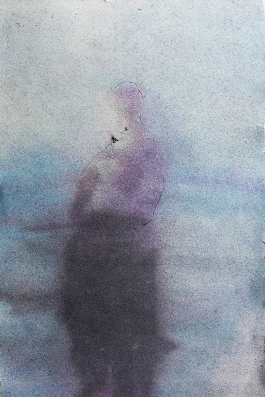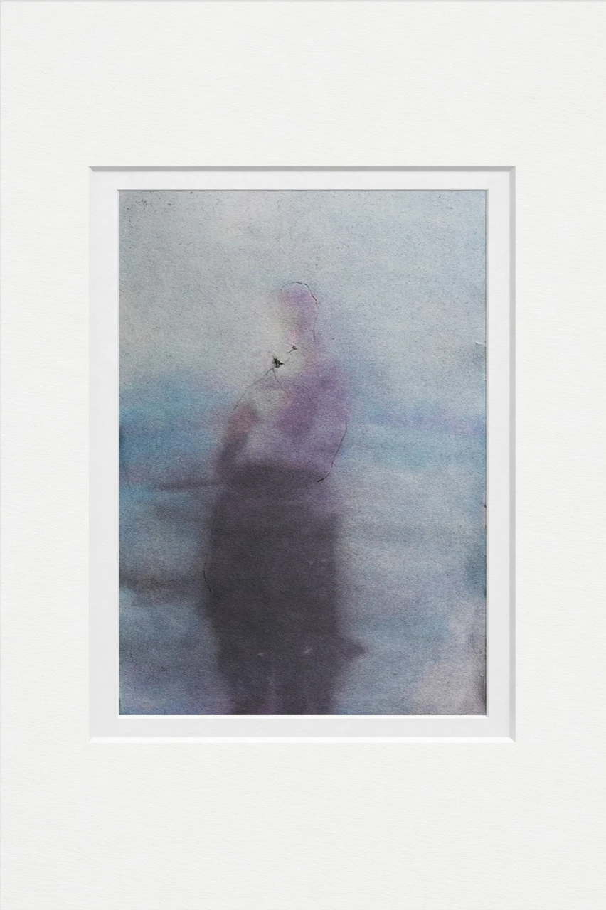 Одинокая фигура возникает из мягкого цветового поля, словно проявляясь из внутреннего пространства. Контур лишь намечает тело, позволяя акварельной среде частично растворять форму. Образ существует на границе присутствия и исчезновения. Холодные голубые и приглушённые фиолетовые оттенки создают состояние остановленного времени. Фигура не действует — она пребывает. Пространство вокруг становится продолжением внутреннего состояния, где человек воспринимается как сосредоточенная точка покоя. Работа фиксирует момент внутреннего молчания — состояние, в котором форма теряет внешнюю определённость и становится ощущением.