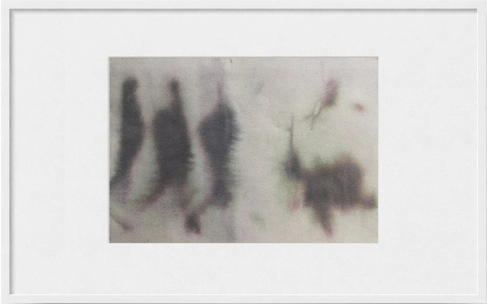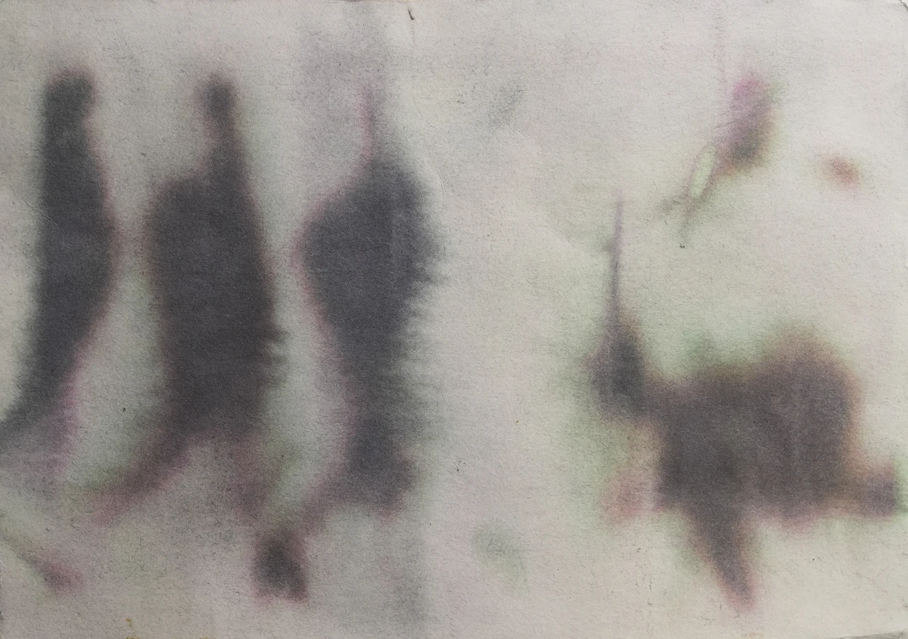 В работе движение утрачивает чёткую телесную границу и превращается в след присутствия. Фигуры существуют как размытые силуэты — не тела, а их остаточное состояние, словно зафиксированное после движения. Изображение строится на повторении вертикальных масс, создающих ритм, близкий к хореографии. Каждая форма воспринимается как фаза одного жеста, развёрнутого во времени. Контуры растворяются, позволяя телу перейти из материального состояния в вибрацию пространства. Размытый пигмент работает как память движения: фигуры не изображены, а проявлены через исчезновение. Танец становится процессом растворения формы, где тело теряет устойчивость и существует лишь как энергия перемещения.