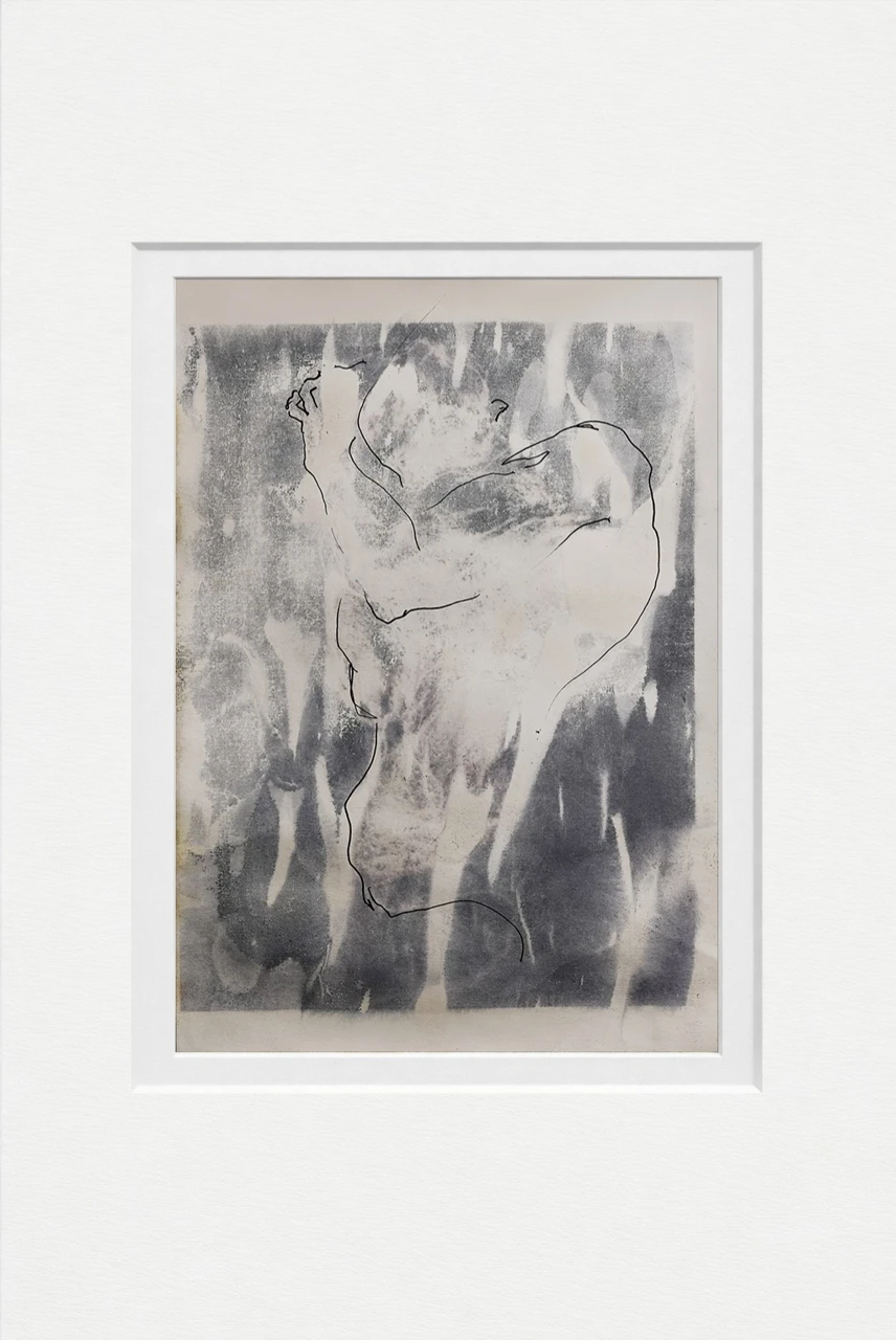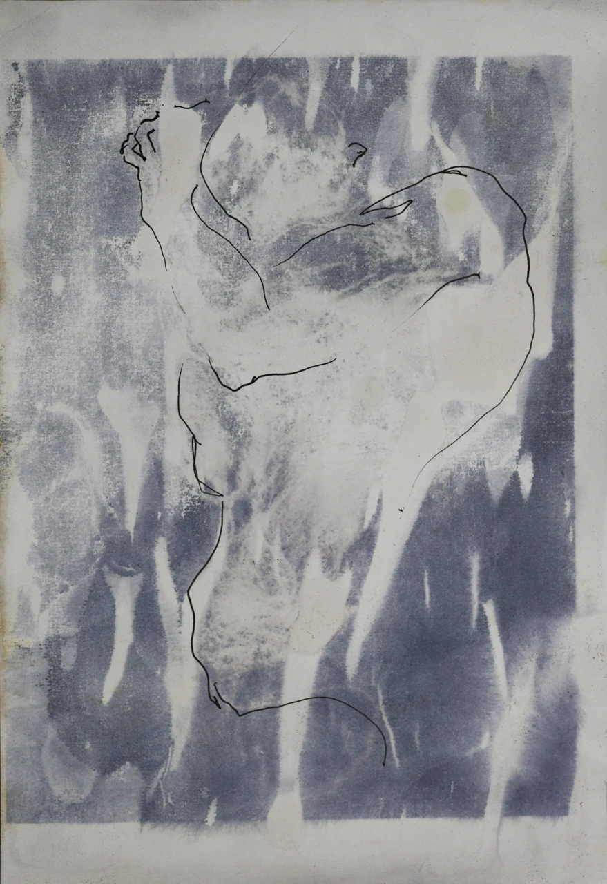 Работа построена на столкновении пятна и линии. Акварельное поле формирует среду — текучую, нестабильную, почти растворяющую фигуру. Контур, выполненный тушью, не фиксирует тело окончательно, а лишь обозначает момент его появления. Фигура возникает как след движения, как память о жесте. Линия действует не как граница формы, а как попытка удержать исчезающее состояние. Пространство проникает внутрь тела, размывая различие между фоном и присутствием. Изображение существует в переходе — между проявлением и исчезновением, материей и воздухом.