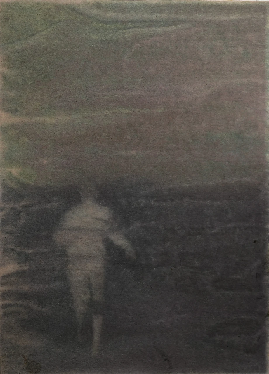 В глубине цветового пространства возникает едва различимая человеческая фигура. Тело не изображено напрямую — оно проявляется как световое пятно, словно движение, зафиксированное в момент исчезновения. Пространство поглощает форму, оставляя только след присутствия. Горизонтальные цветовые слои создают ощущение границы между состояниями — землёй и воздухом, памятью и настоящим, появлением и растворением. Фигура воспринимается как движение внутрь среды, как акт перехода из видимого мира в внутреннее пространство. Работа строится на ощущении дистанции: человек становится частью среды, теряя очертания и превращаясь в событие света.