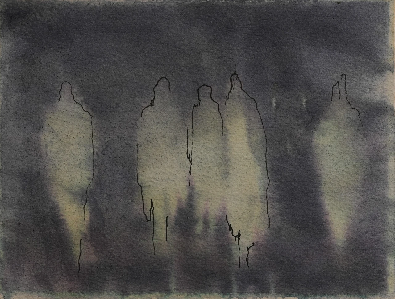 Работа строится как пространство присутствия, в котором фигуры возникают не как отдельные персонажи, а как состояния среды. Силуэты едва обозначены линией и словно проявляются из глубины живописного слоя, становясь частью единого пространства. Поле здесь понимается не как пейзаж, а как зона напряжения — место встречи тел, памяти и движения. Фигуры существуют на границе видимого: они появляются и растворяются, подобно следам, оставленным в пространстве временем или человеческим присутствием. Размытые световые массы создают ощущение дыхания среды, где человек перестаёт быть центром композиции и становится элементом общего пластического поля. Работа фиксирует момент совместного существования — состояние между одиночеством и общностью.