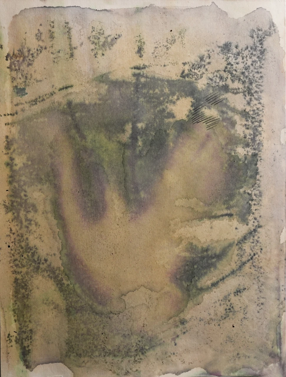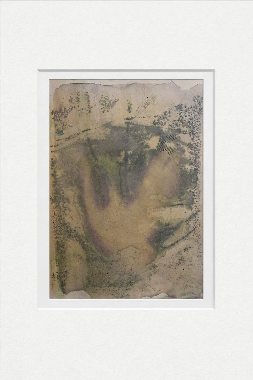 Форма возникает как остаточное движение — словно поверхность сохранила след прикосновения. Изображение не фиксирует сам жест, а его последствия: смещение цвета, нарушение равновесия, мягкое изменение структуры пространства. Акварель растекается, позволяя форме проявляться изнутри листа. Образ воспринимается как отпечаток присутствия, где тело уже отсутствует, но энергия контакта продолжает существовать. Работа обращается к моменту после взаимодействия — состоянию, когда прикосновение завершено, но память о нём остаётся в материале.