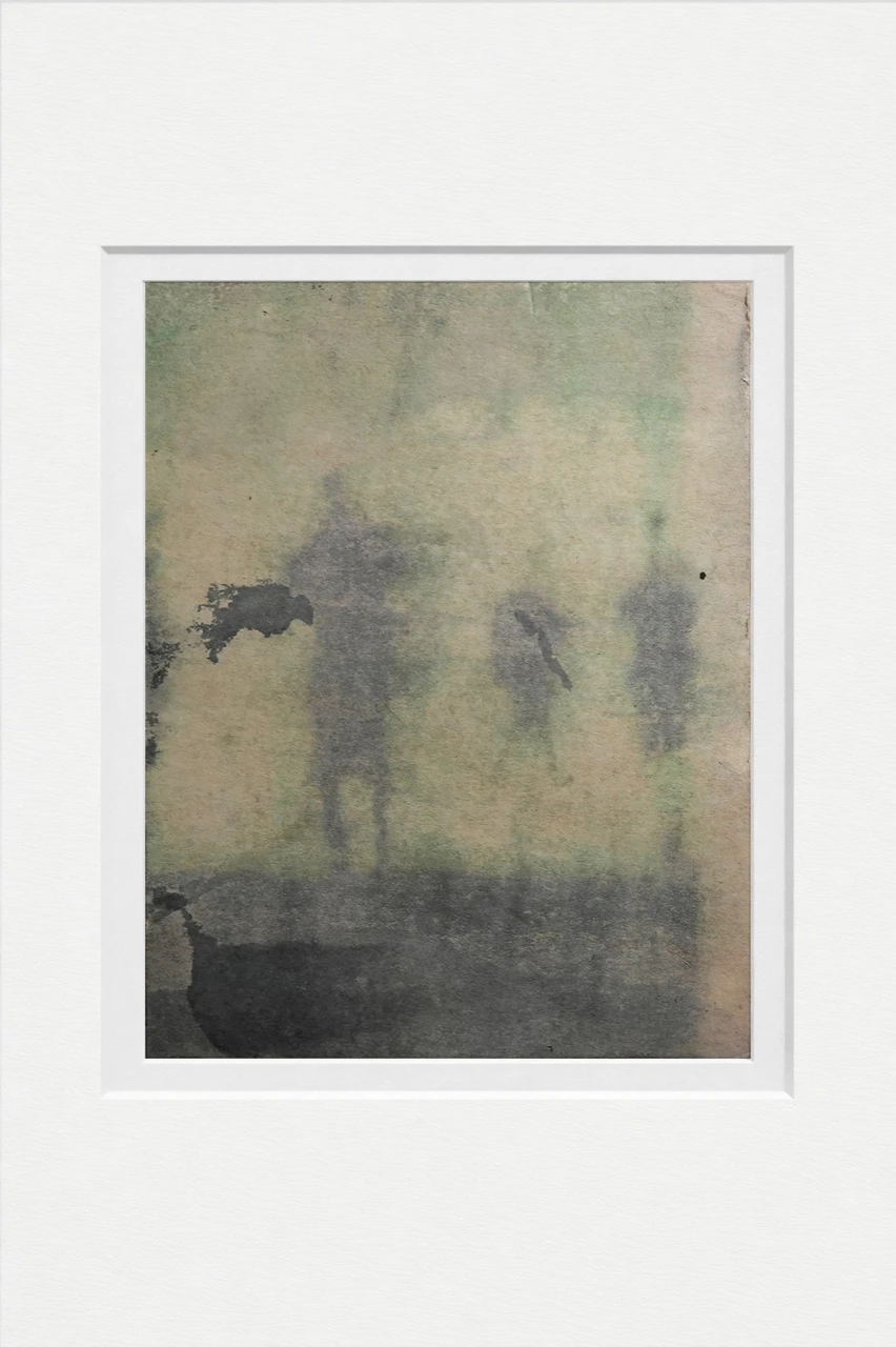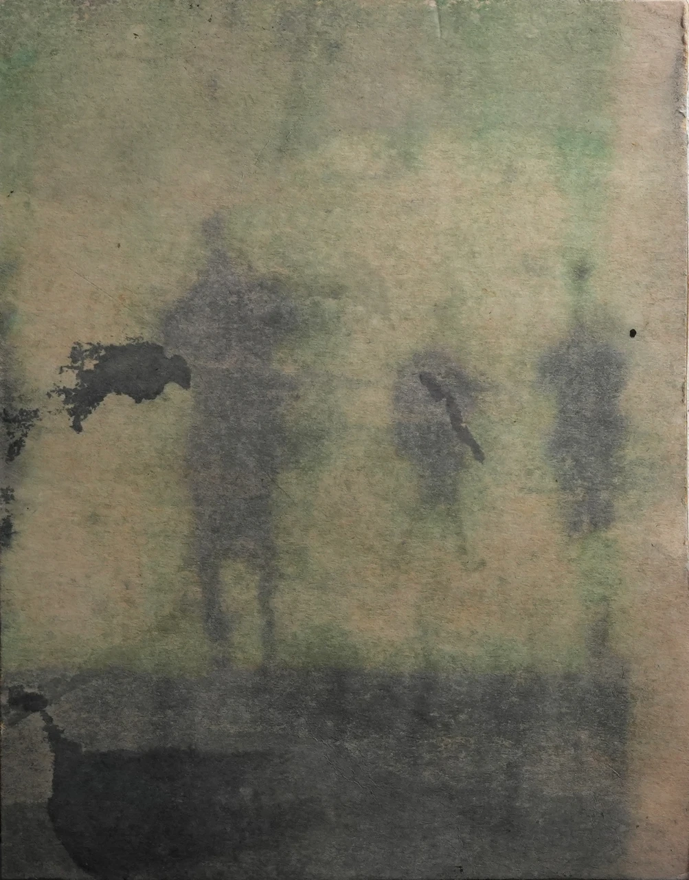 Фигуры возникают как тени, лишённые устойчивой формы. Они не занимают пространство, а постепенно растворяются в нём, становясь частью окружающей среды. Акварельные слои размывают границы тела, превращая человеческое присутствие в едва уловимый след. Композиция построена на процессе исчезновения: силуэты теряют плотность, распадаются на пятна и переходят в цветовое поле. Пространство действует активнее фигуры — оно поглощает её, рассеивая индивидуальность и оставляя лишь ощущение движения и времени. Работа фиксирует состояние утраты формы, момент, когда присутствие превращается в память.