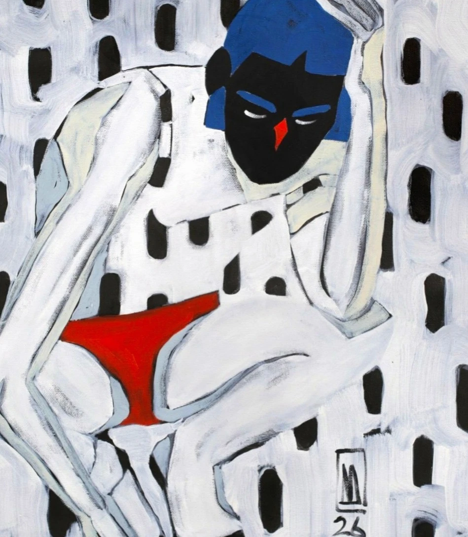 «Снеговик» — это встреча с фантомом, чёрным ликом на белом фоне, где нет ничего от привычной детской игрушки. Я отказываюсь от материального мира, оставляя лишь намёк на человеческие черты, чтобы показать, каким парадоксально ярким может быть наше истинное лицо, скрытое за оболочкой. Этот фантом — равноправная часть души, её зеркальная сторона, где живут подлинные чувства и намерения. Белый фон здесь — мир сновидений, в который я увожу своего героя, закрывая ему глаза на внешнее. Пустоту внутри чёрного лика заполняет каждый смотрящий своими сокровенными образами.