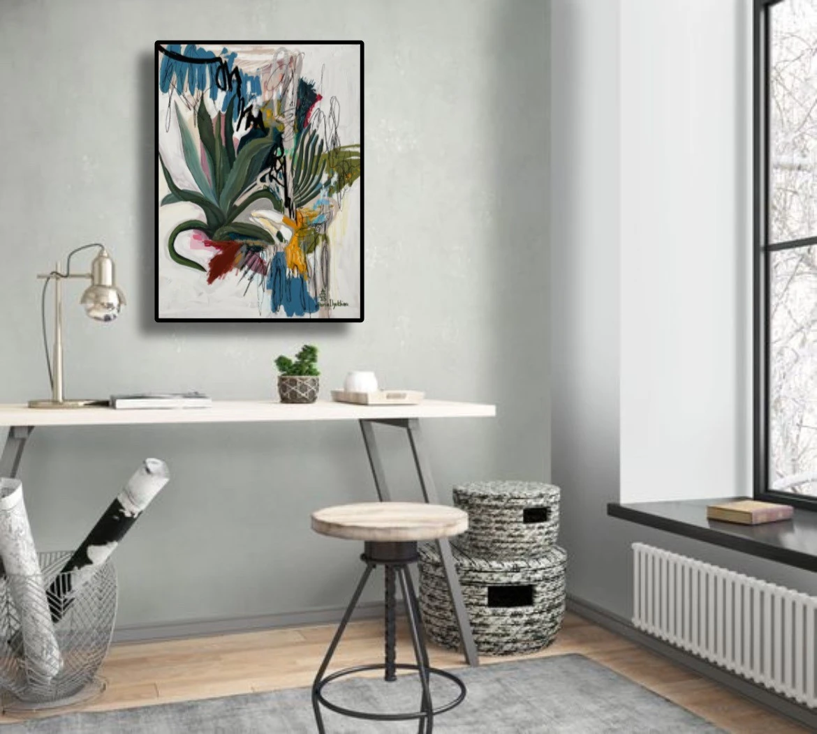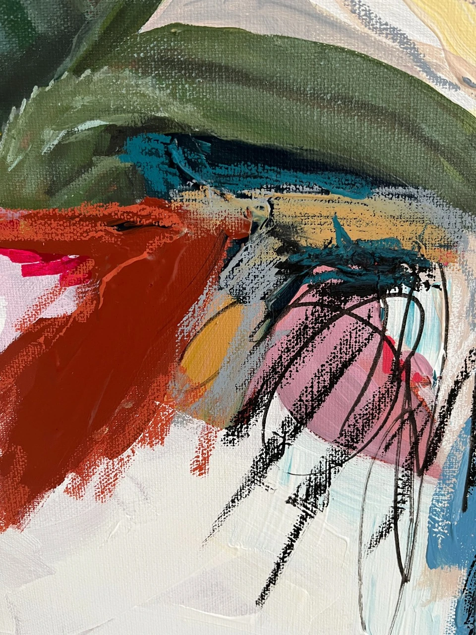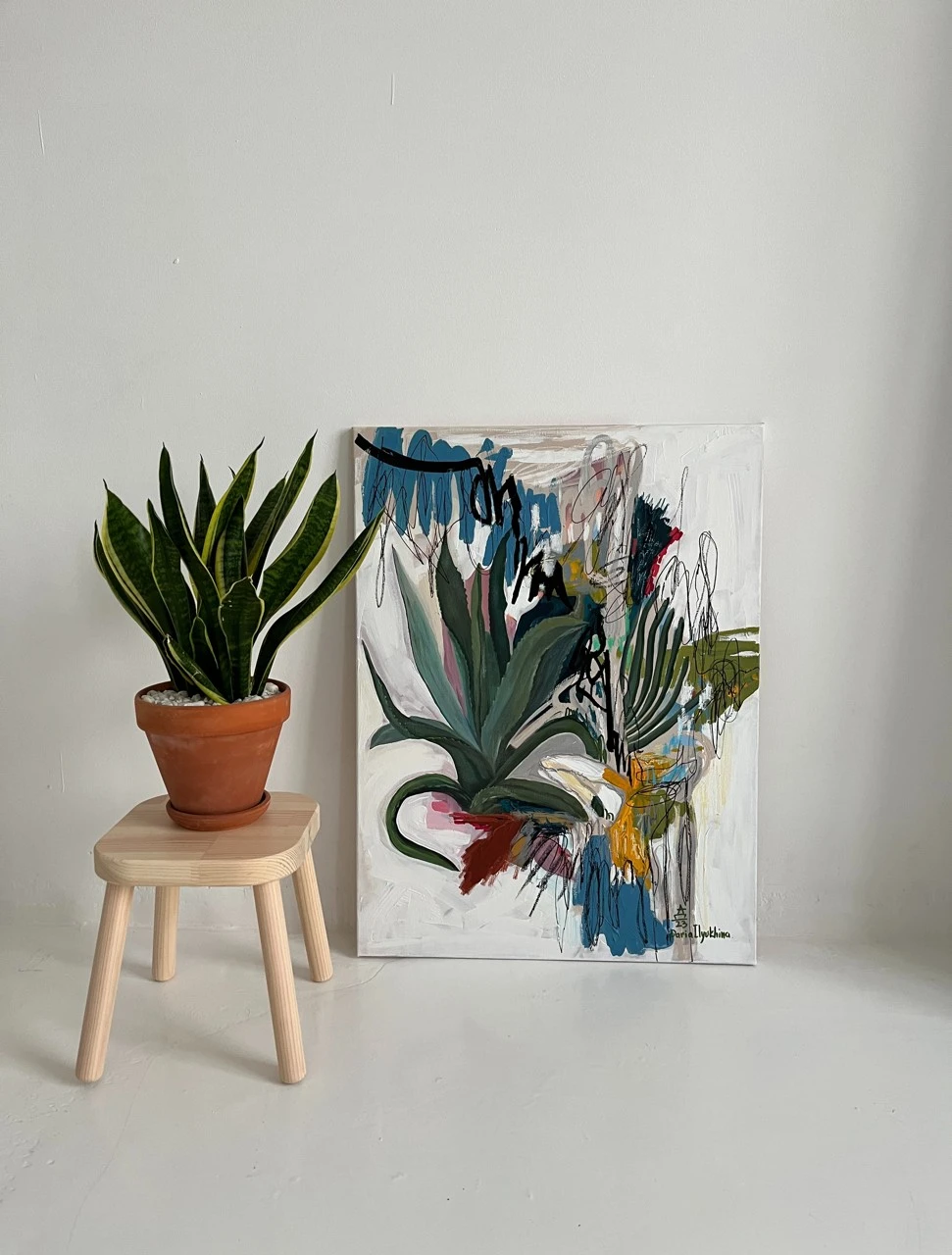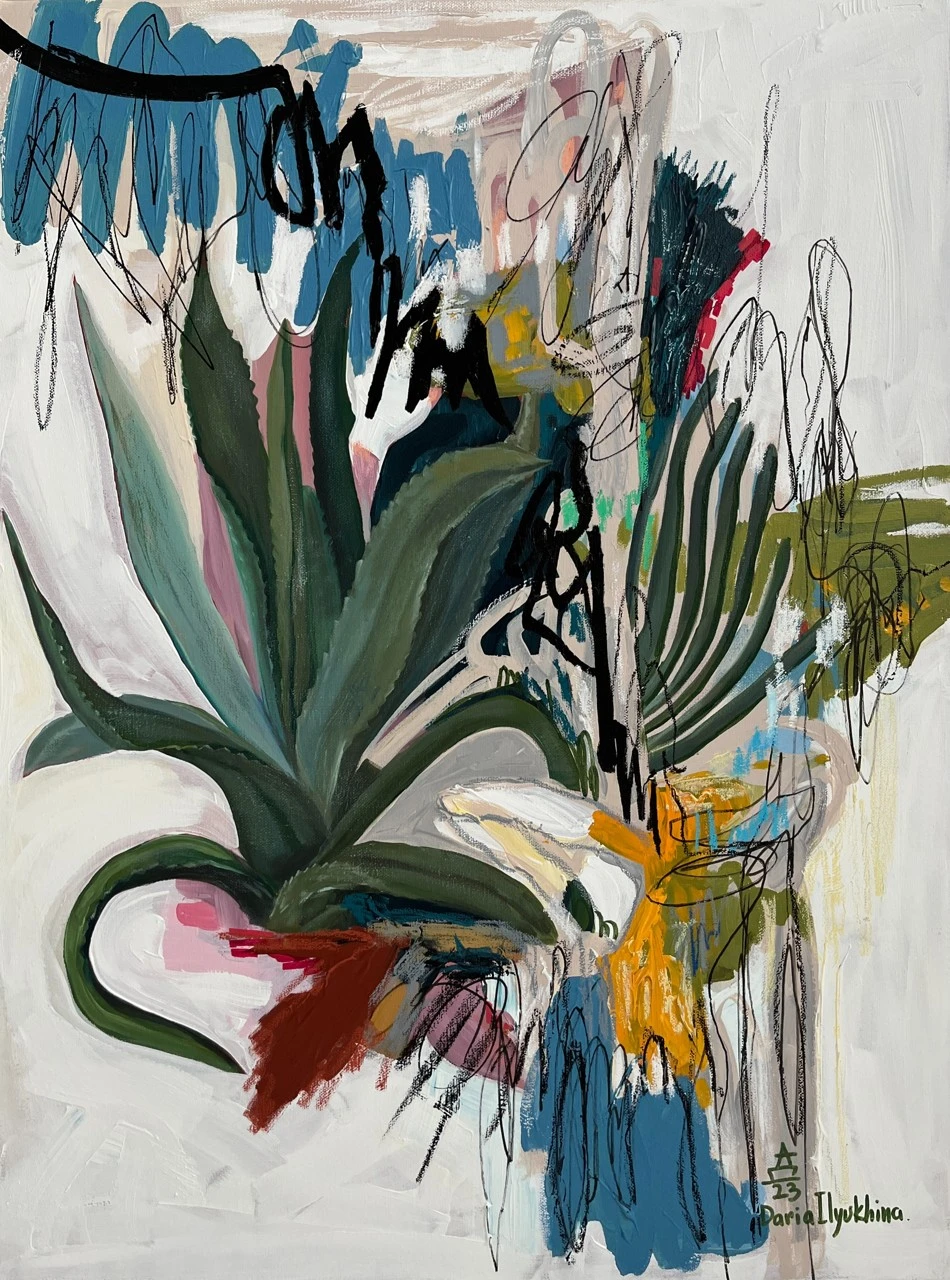 Картина входит в серию «Ботанические заметки» — это одна из серий работ, которые я пишу с 2023 года. Над ней я работаю в технике коллажа, который собираю из случайных фрагментов — кусочков фотографий, текстов — и превращаю их в цельное эмоциональное высказывание. Я не даю чёткого ответа, что именно нужно увидеть. Кто-то находит в этих работах символику любви, кто-то — человеческие образы, а кто-то просто разглядывает визуальный гербарий. В центре каждой композиции — цветок. Он задаёт не только цвет, но и настроение. Это может быть мамин физалис, бабушкин алоэ или лотос, который когда-то сфотографировала моя подруга. Сначала я собираю коллаж, а потом перевожу его в живопись. И в этом для меня что-то очень личное — обрывки памяти, впечатлений, эмоций собираются в единое, цельное изображение. Это моя попытка сохранить то, что ускользает — через образ, через цвет, через жест.