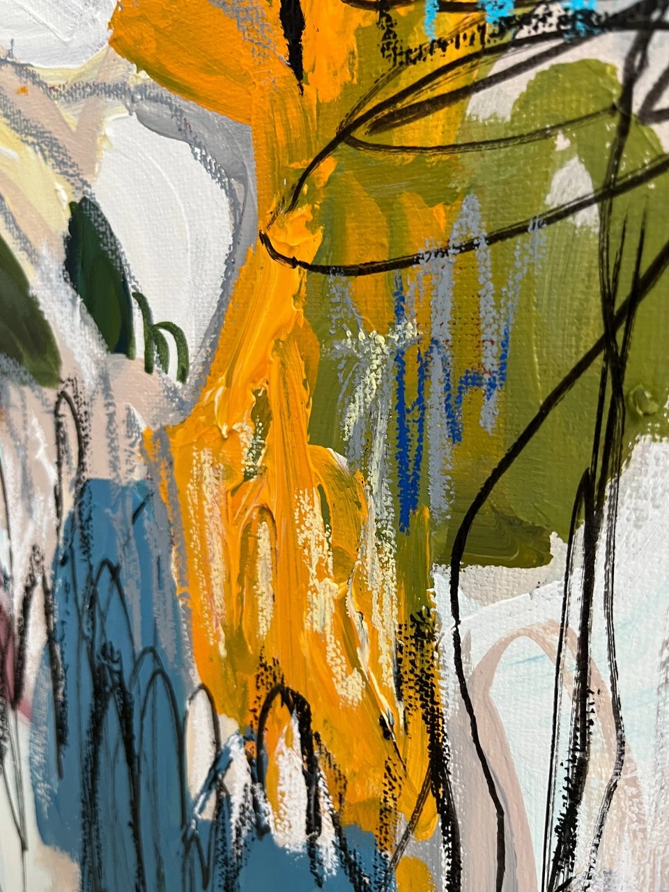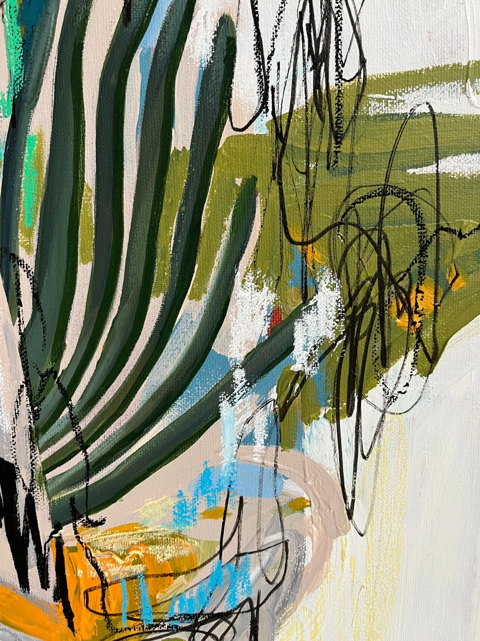 Холст на подрамнике, акрил, масляная пастель, маркеры, лак. Торец картины прокрашен.
