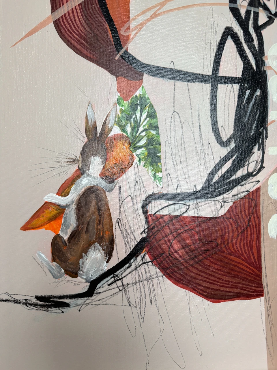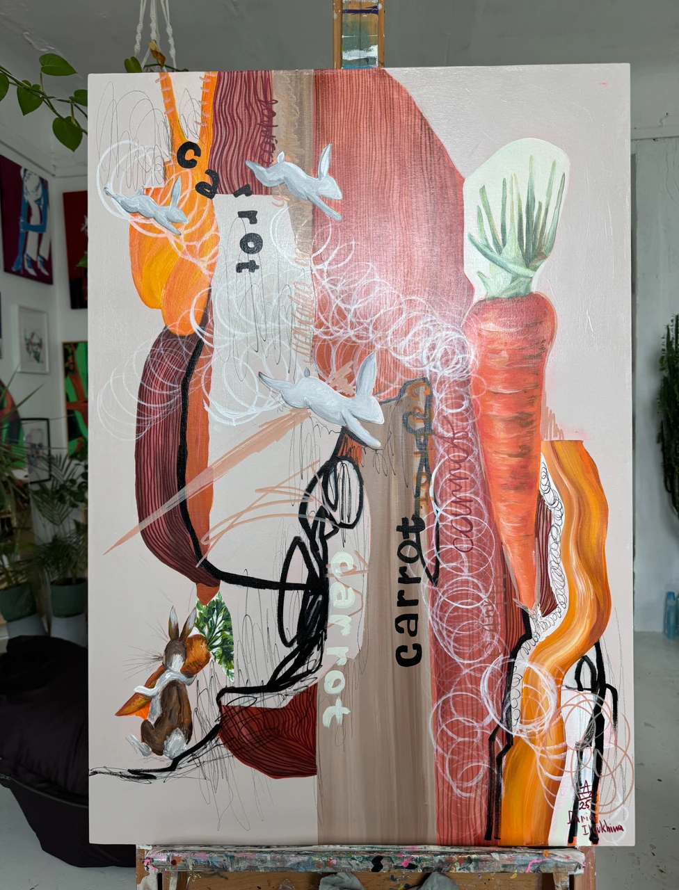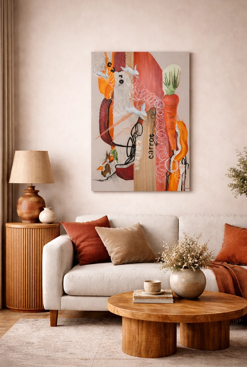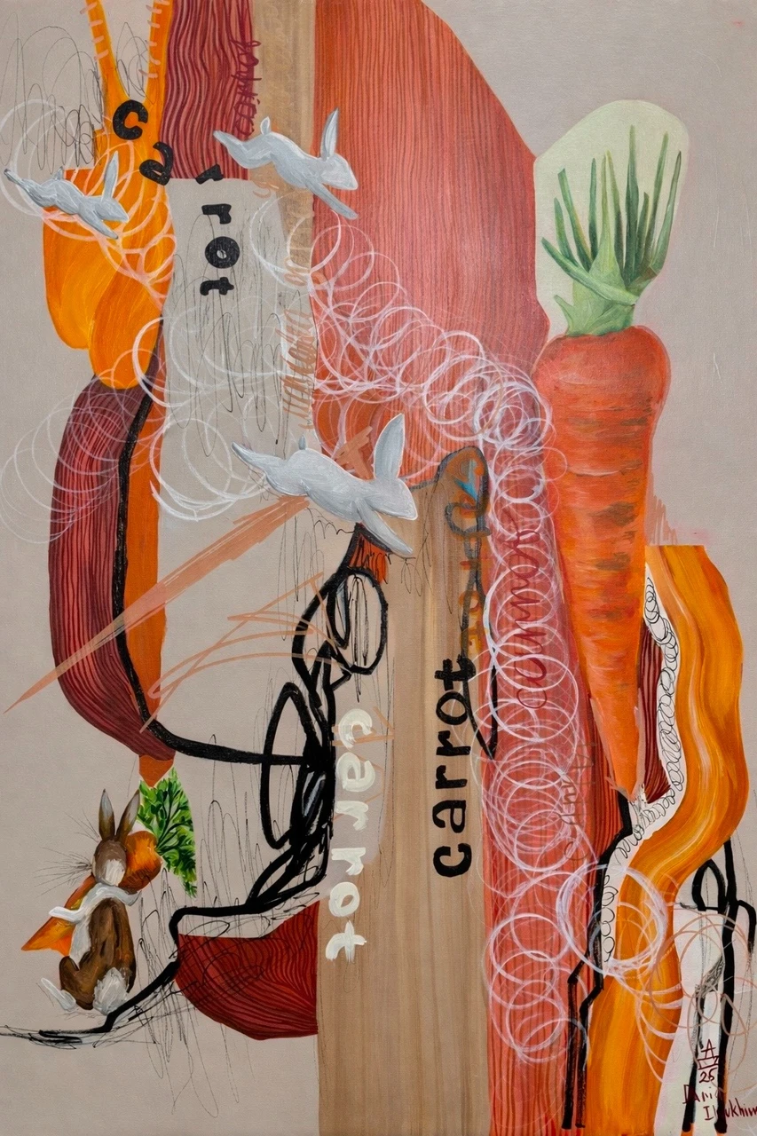 Картина из серии «Ботанические заметки». Работа исследует движение как внутреннее состояние — путь, в котором цель не фиксирована, а переживается как импульс. Фигура кролика становится метафорой уязвимой решимости: он мал, но направлен вперёд. Морковь здесь — не объект желания, а знак притяжения, визуальный ориентир, вокруг которого выстраивается пространство напряжения и выбора.