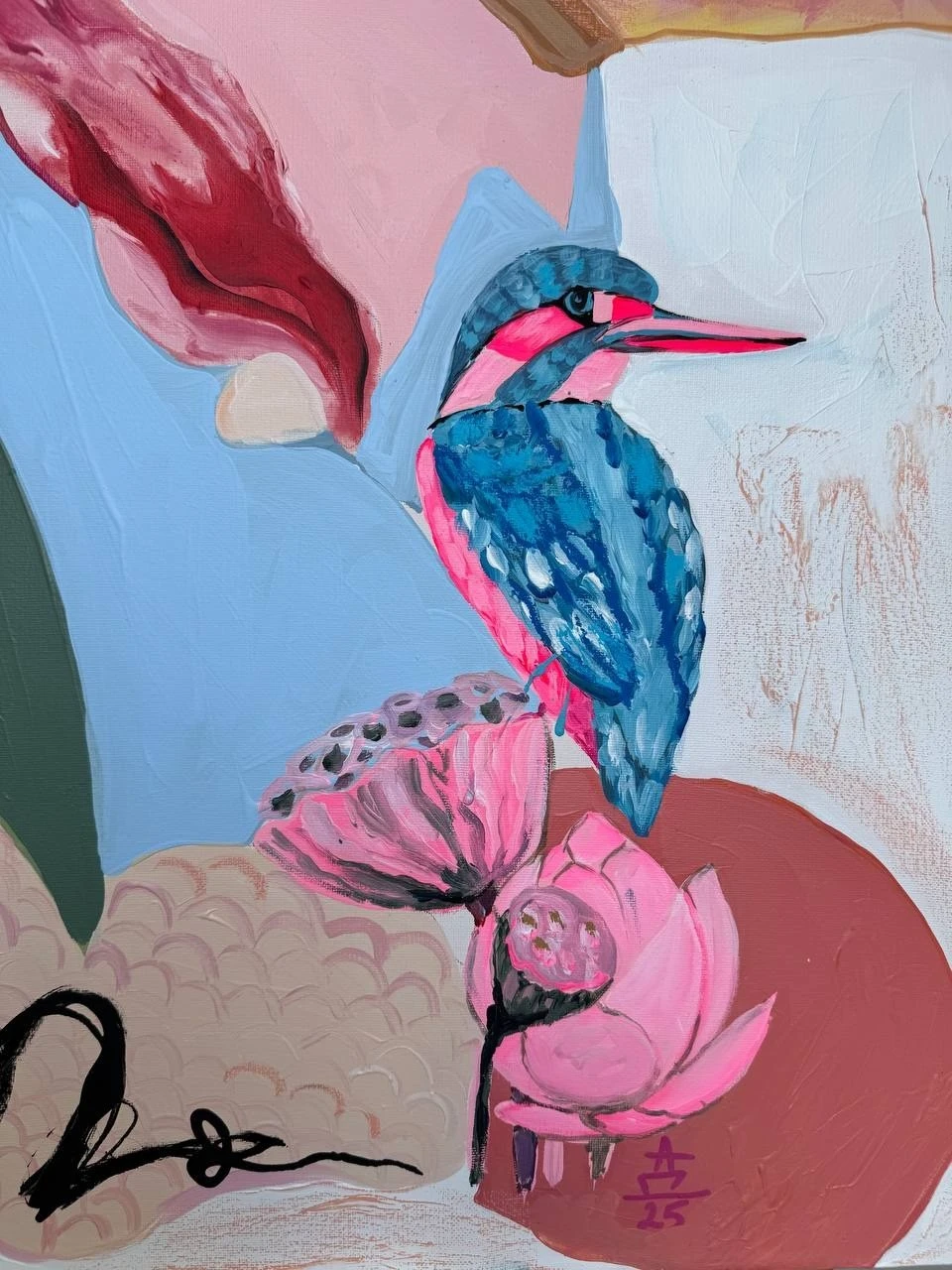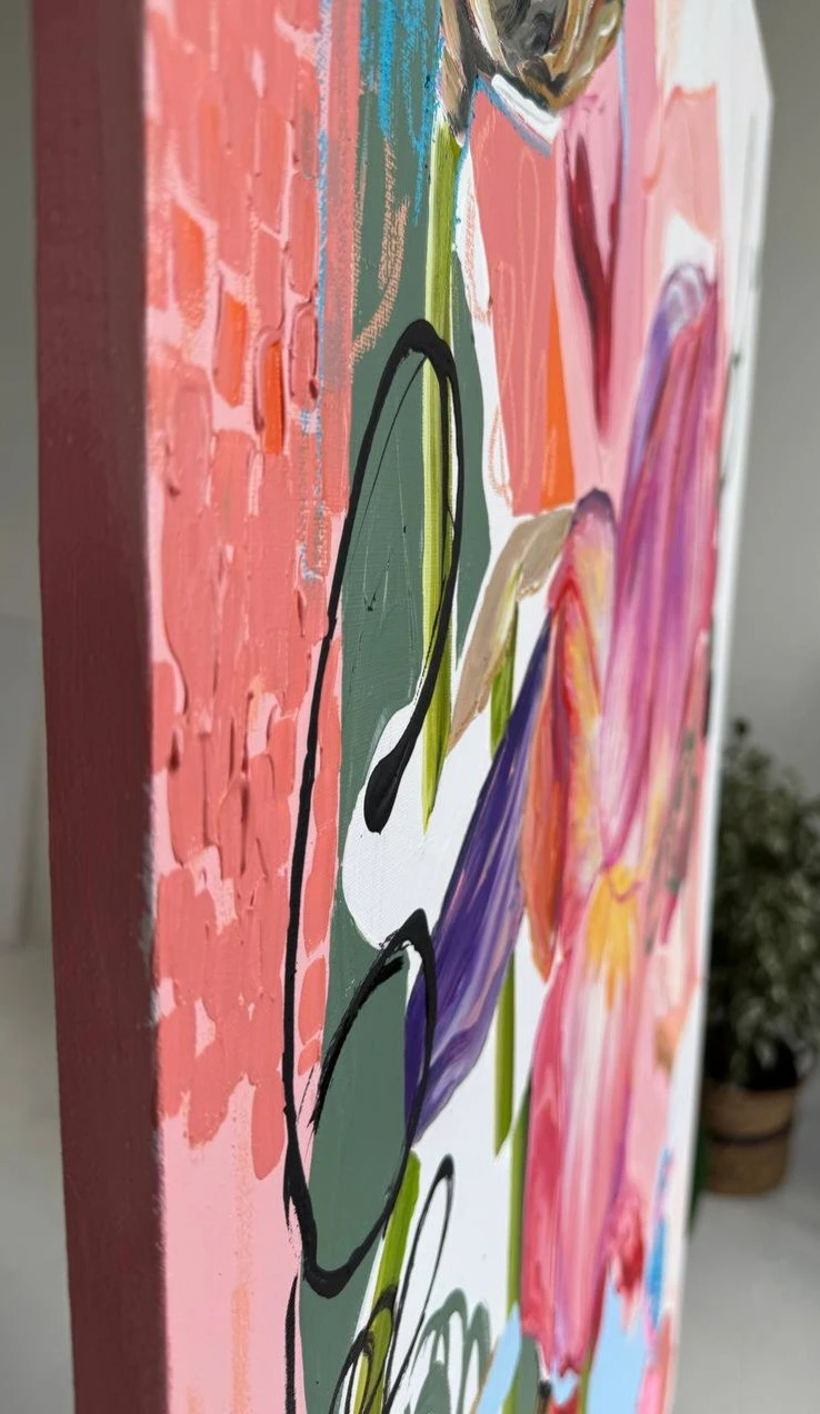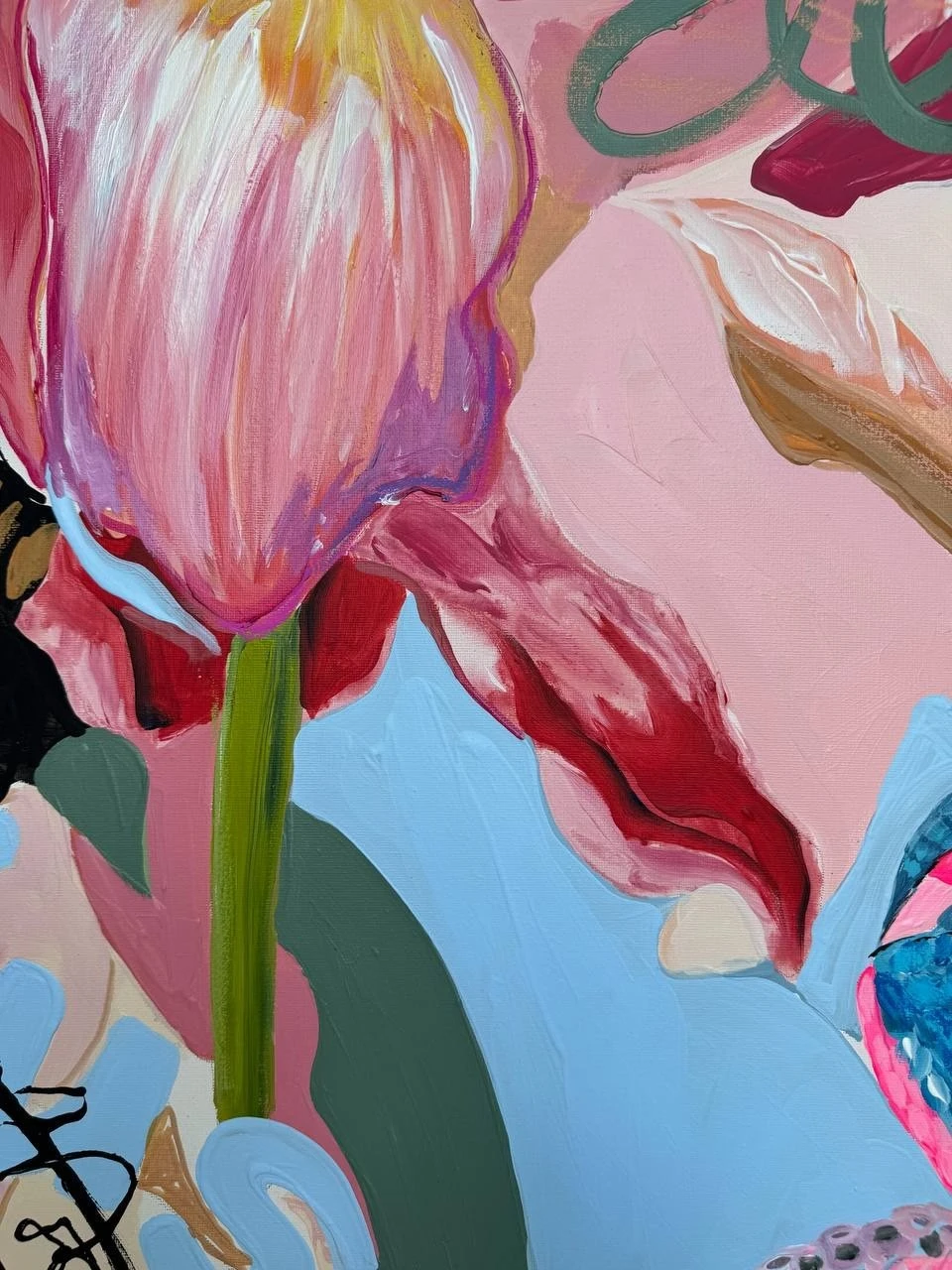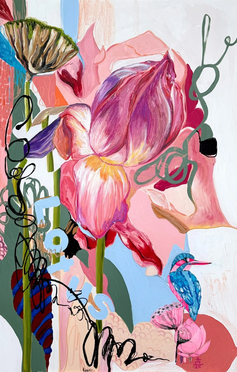 Картина входит в серию «Ботанические заметки» — это одна из моих серий работ, которые я пишу с 2023 года. Над ней я работаю в технике коллажа, который собираю из случайных фрагментов — кусочков фотографий, текстов — и превращаю их в цельное эмоциональное высказывание. Я не даю чёткого ответа, что именно нужно увидеть. Кто-то находит в этих работах символику любви, кто-то — человеческие образы, а кто-то просто разглядывает визуальный гербарий. В центре каждой композиции — цветок. Он задаёт не только цвет, но и настроение. Это может быть мамин физалис, бабушкин алоэ или лотос, который когда-то сфотографировала моя подруга. Сначала я собираю коллаж, а потом перевожу его в живопись. И в этом для меня что-то очень личное — обрывки памяти, впечатлений, эмоций собираются в единое, цельное изображение. Это моя попытка сохранить то, что ускользает — через образ, через цвет, через жест.