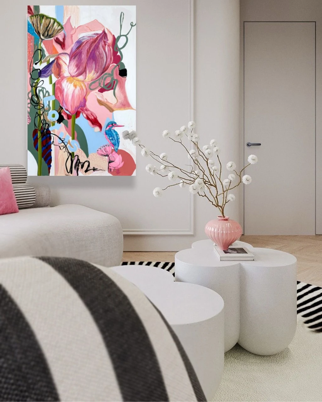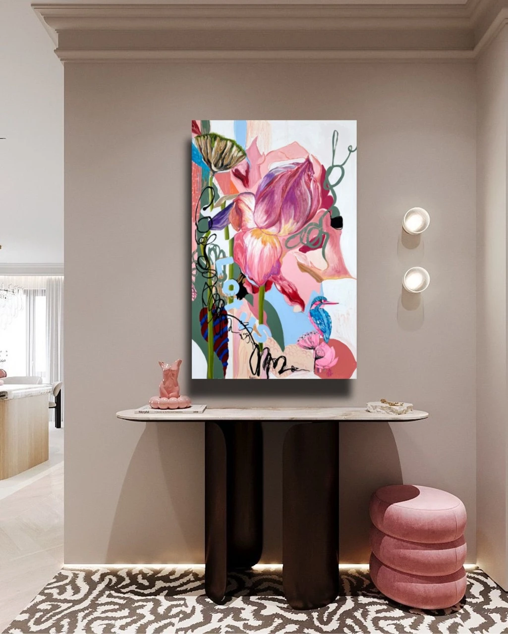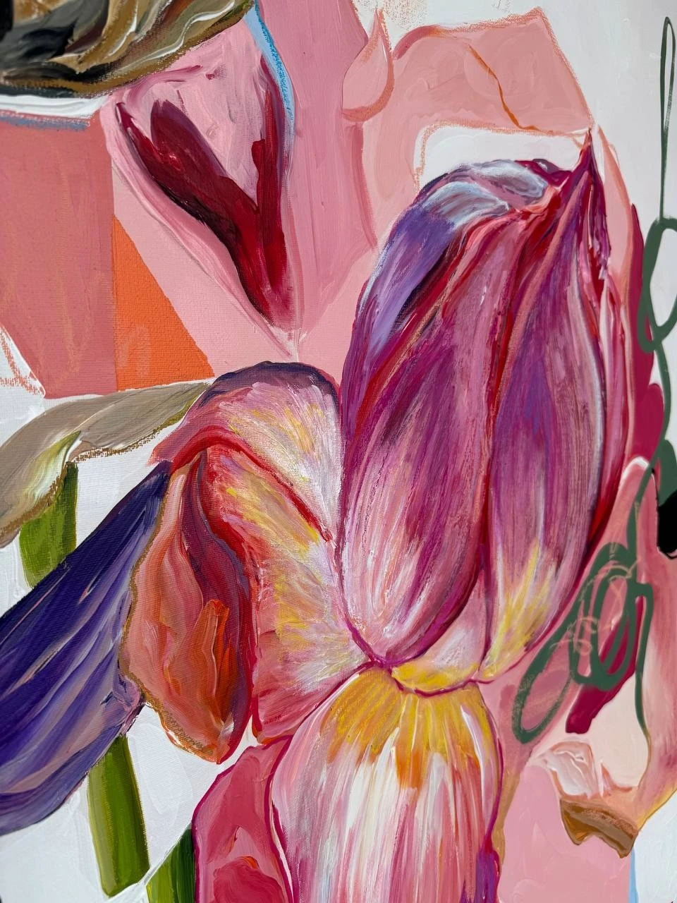 Картина входит в серию «Ботанические заметки» — это одна из моих серий работ, которые я пишу с 2023 года. Над ней я работаю в технике коллажа, который собираю из случайных фрагментов — кусочков фотографий, текстов — и превращаю их в цельное эмоциональное высказывание. Я не даю чёткого ответа, что именно нужно увидеть. Кто-то находит в этих работах символику любви, кто-то — человеческие образы, а кто-то просто разглядывает визуальный гербарий. В центре каждой композиции — цветок. Он задаёт не только цвет, но и настроение. Это может быть мамин физалис, бабушкин алоэ или лотос, который когда-то сфотографировала моя подруга. Сначала я собираю коллаж, а потом перевожу его в живопись. И в этом для меня что-то очень личное — обрывки памяти, впечатлений, эмоций собираются в единое, цельное изображение. Это моя попытка сохранить то, что ускользает — через образ, через цвет, через жест.