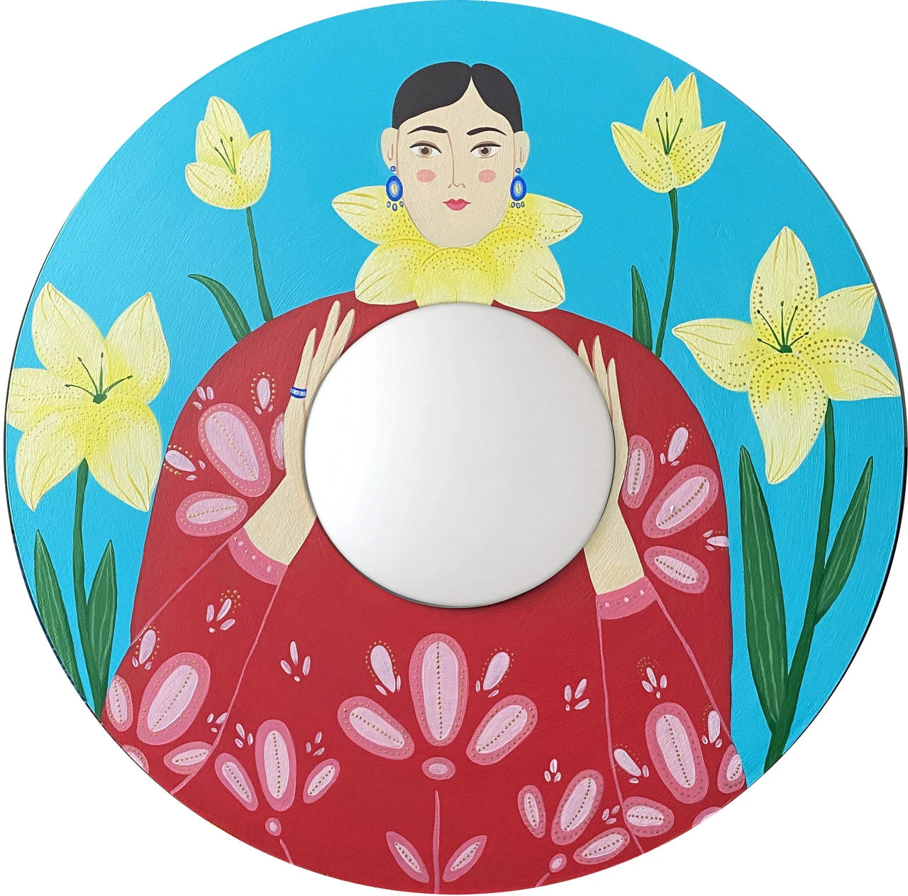 Ширма двухсторонняя ,с одной стороны имеет "активный"рисунок ,с другой -выкрашена в однотон и состарена. Ширма имеет круглые элементы ,которые вращаются вокруг оси и с одной стороны представляют собой зеркальные поверхности ,а с другой на них нанесена роспись.