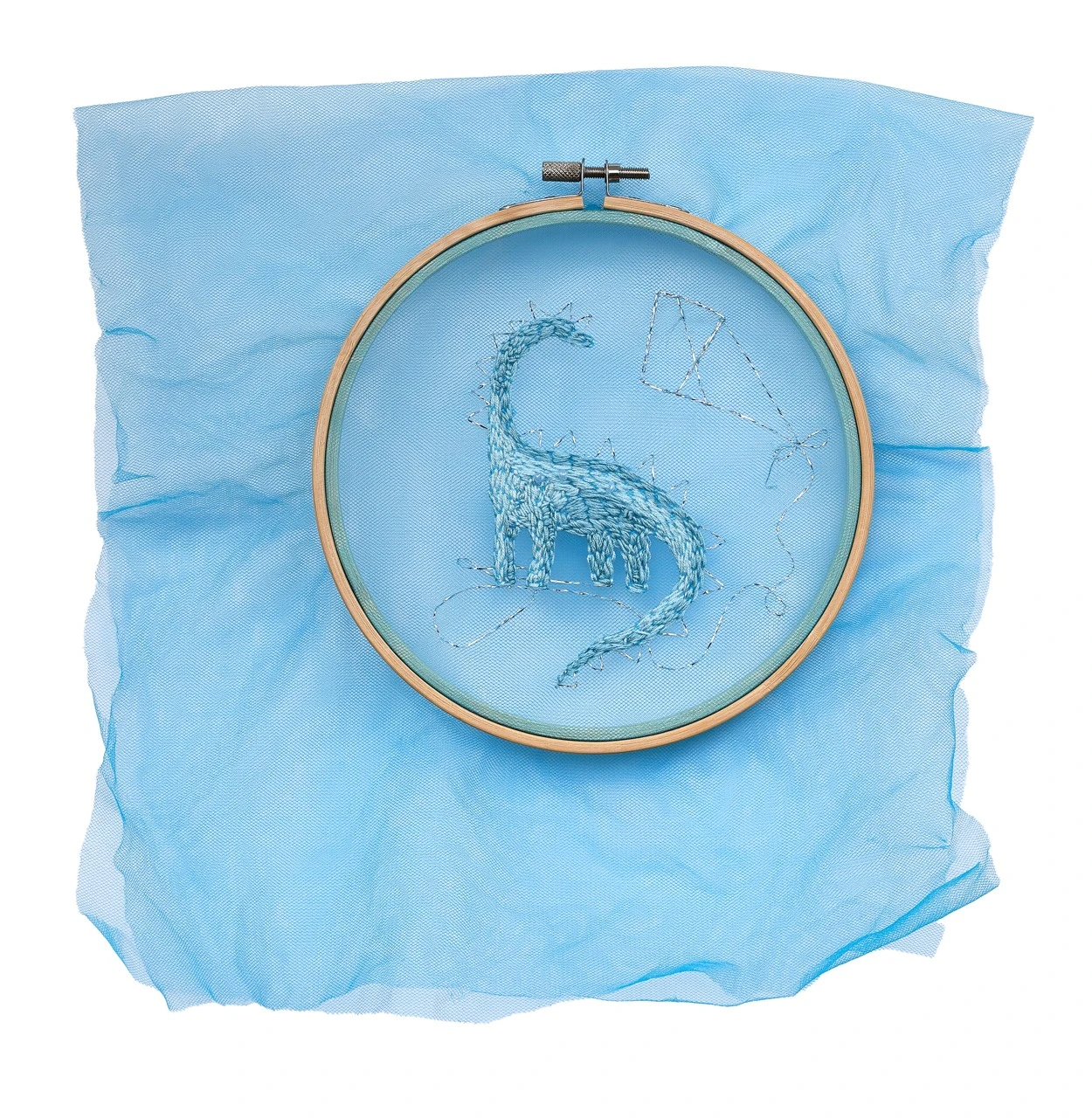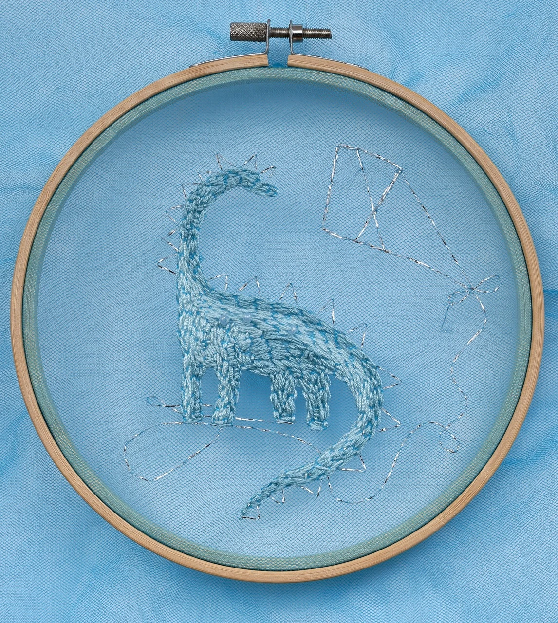 Прозрачный фатин — как ткань сна. Синие оттенки — как сумерки памяти. А вышивка — способ зацепиться за эти образы, прежде чем они исчезнут.