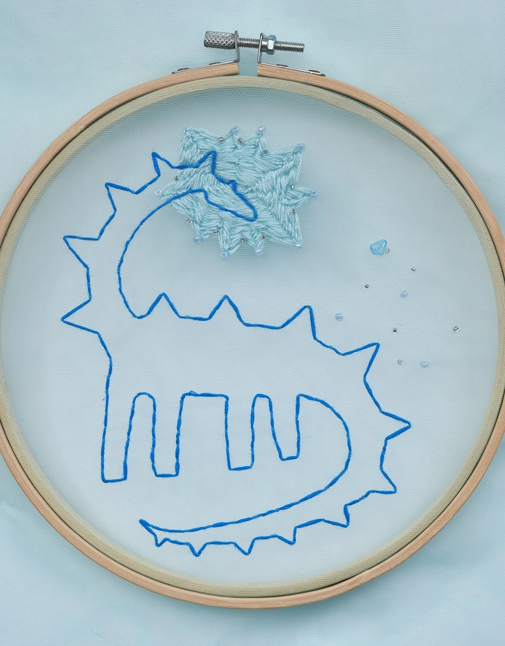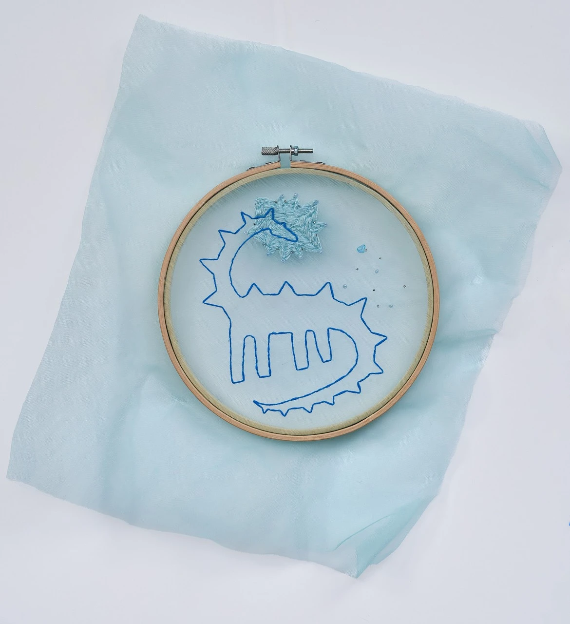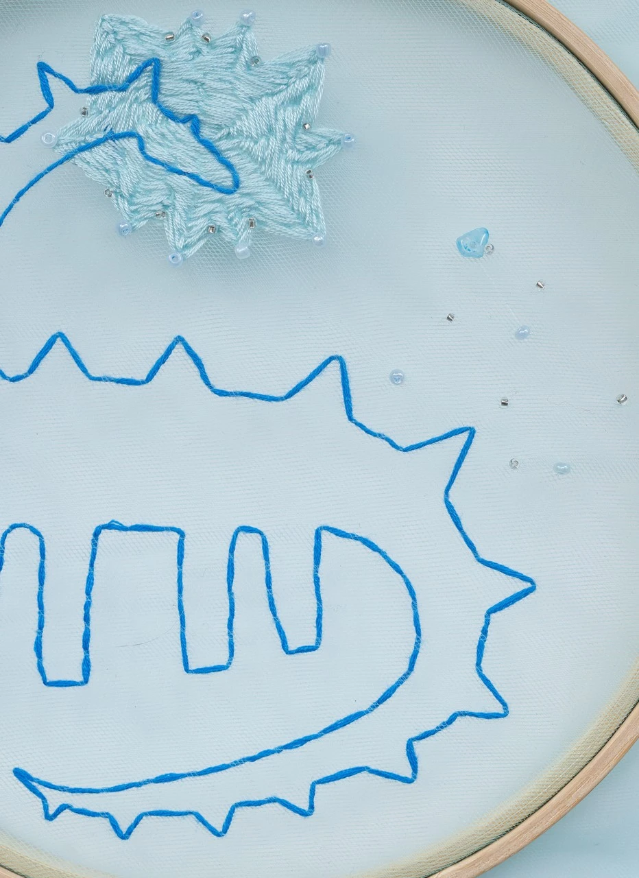 Прозрачный фатин — как ткань сна. Синие оттенки — как сумерки памяти. А вышивка — способ зацепиться за эти образы, прежде чем они исчезнут.