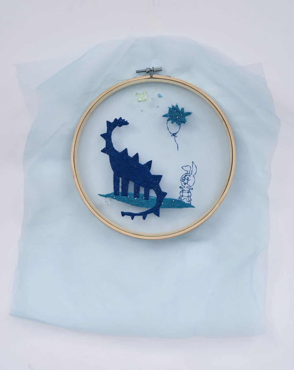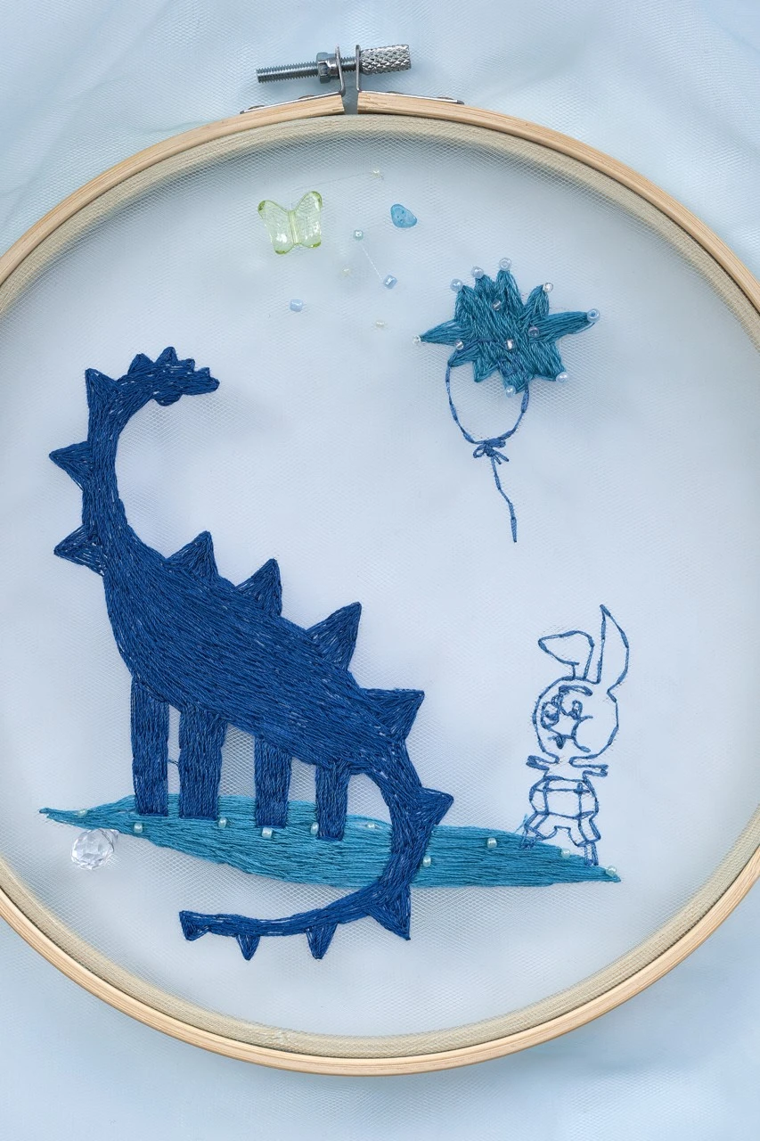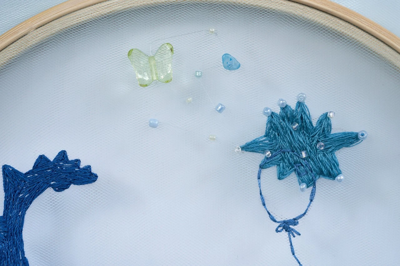 Прозрачный фатин — как ткань сна. Синие оттенки — как сумерки памяти. А вышивка — способ зацепиться за эти образы, прежде чем они исчезнут.