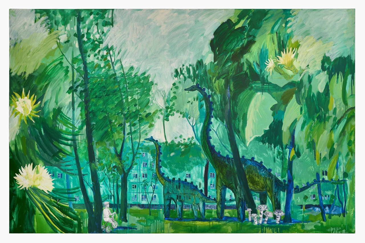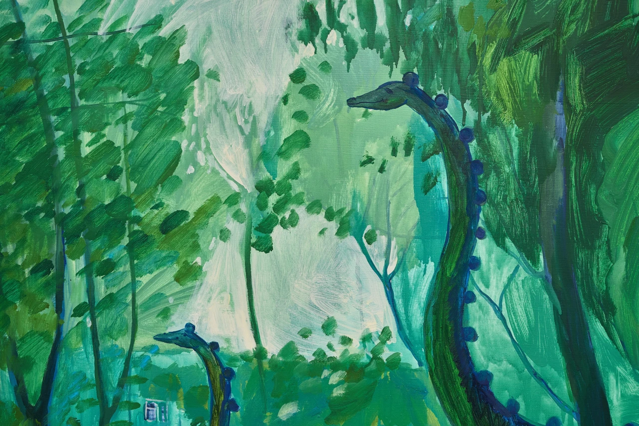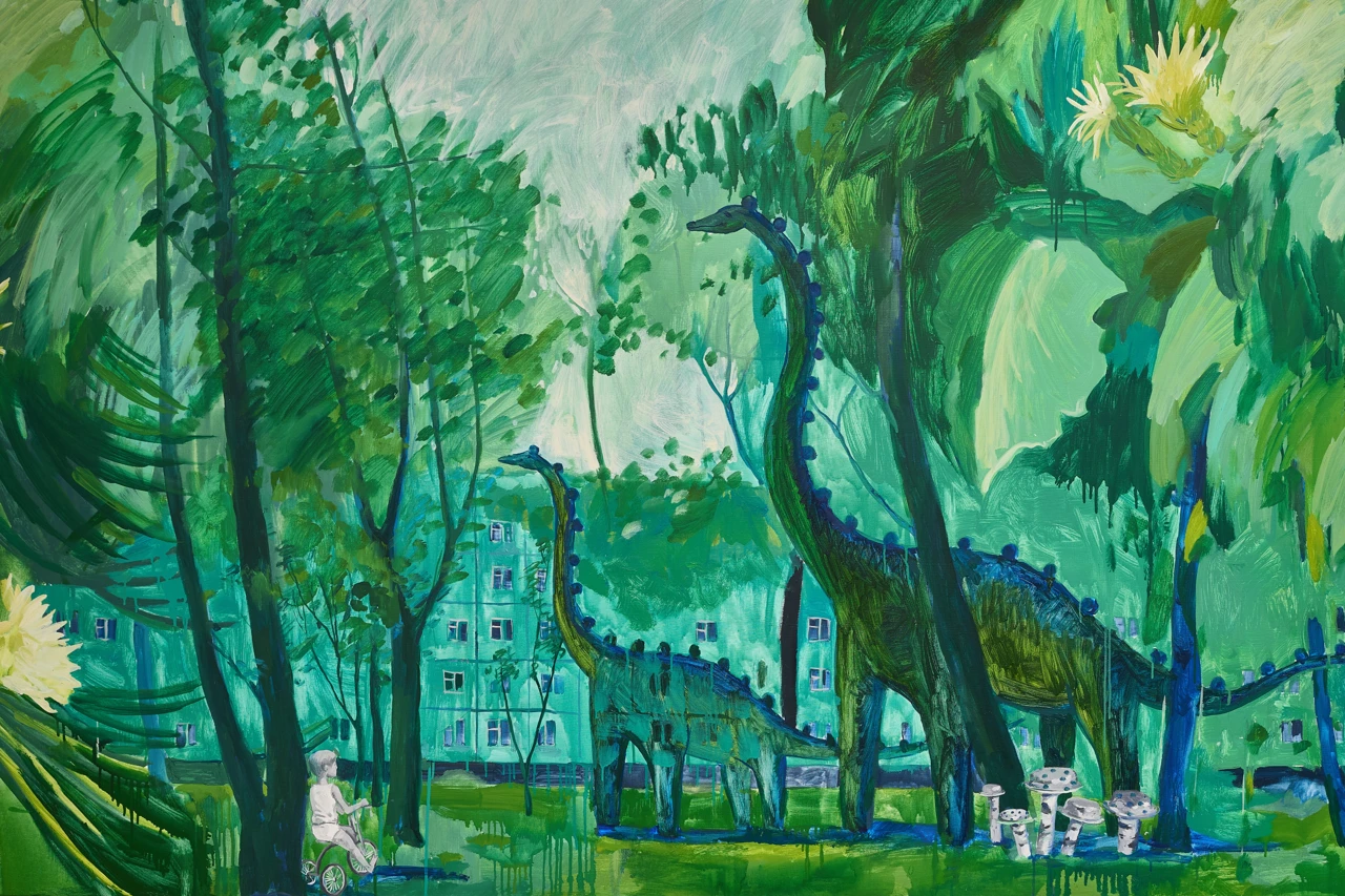«Джунгли, детство и любовь» обращается к пространству личной памяти и её способности преобразовывать повседневную среду. Отталкиваясь от образов собственного детства, художница превращает привычный двор хрущёвки в фантазийный ландшафт, где реальное и воображаемое сосуществуют на равных. В композиции бытовые мотивы переплетаются с элементами внутреннего мифа: знакомое пространство превращается в джунгли, а детские страхи и увлечения обретают форму доброжелательных динозавров. Здесь дом детства, мечты о лете посреди зимы и исчезнувшие архитектурные фрагменты сосредоточены в одном визуальном поле, продолжая существовать и развиваться уже вне физических координат города.