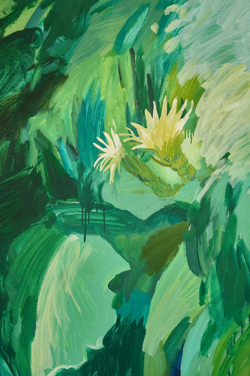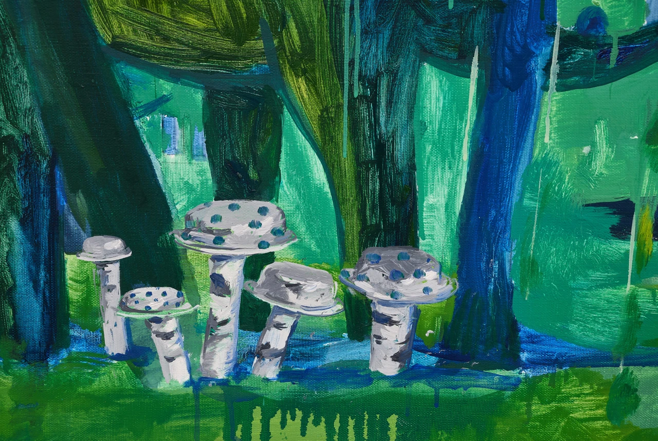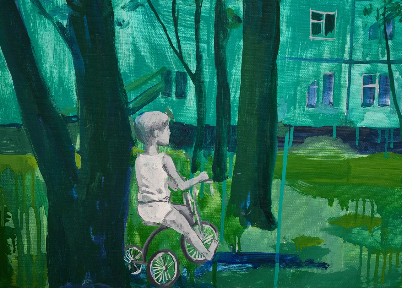 «Джунгли, детство и любовь» обращается к пространству личной памяти и её способности преобразовывать повседневную среду. Отталкиваясь от образов собственного детства, художница превращает привычный двор хрущёвки в фантазийный ландшафт, где реальное и воображаемое сосуществуют на равных. В композиции бытовые мотивы переплетаются с элементами внутреннего мифа: знакомое пространство превращается в джунгли, а детские страхи и увлечения обретают форму доброжелательных динозавров. Здесь дом детства, мечты о лете посреди зимы и исчезнувшие архитектурные фрагменты сосредоточены в одном визуальном поле, продолжая существовать и развиваться уже вне физических координат города.