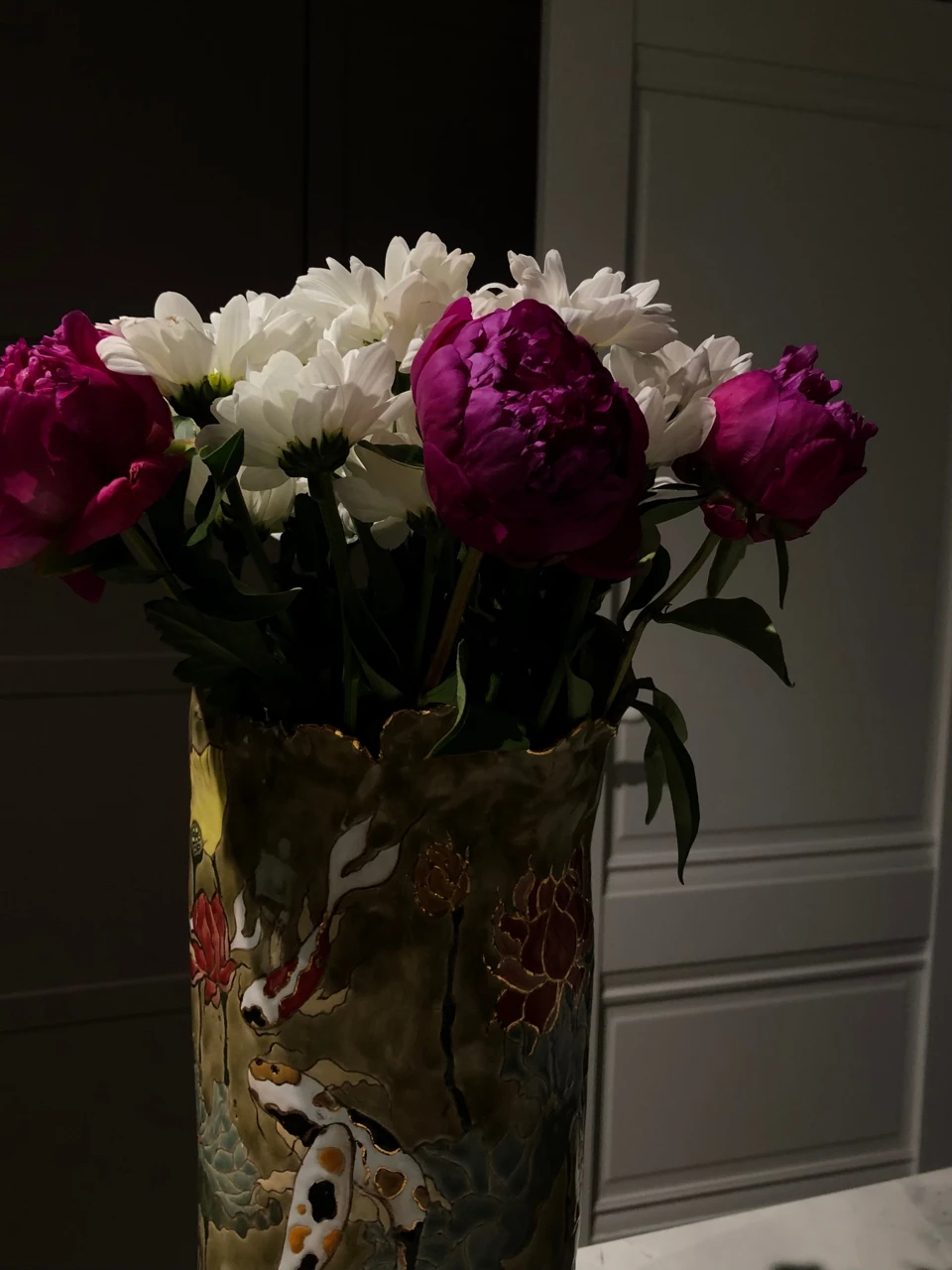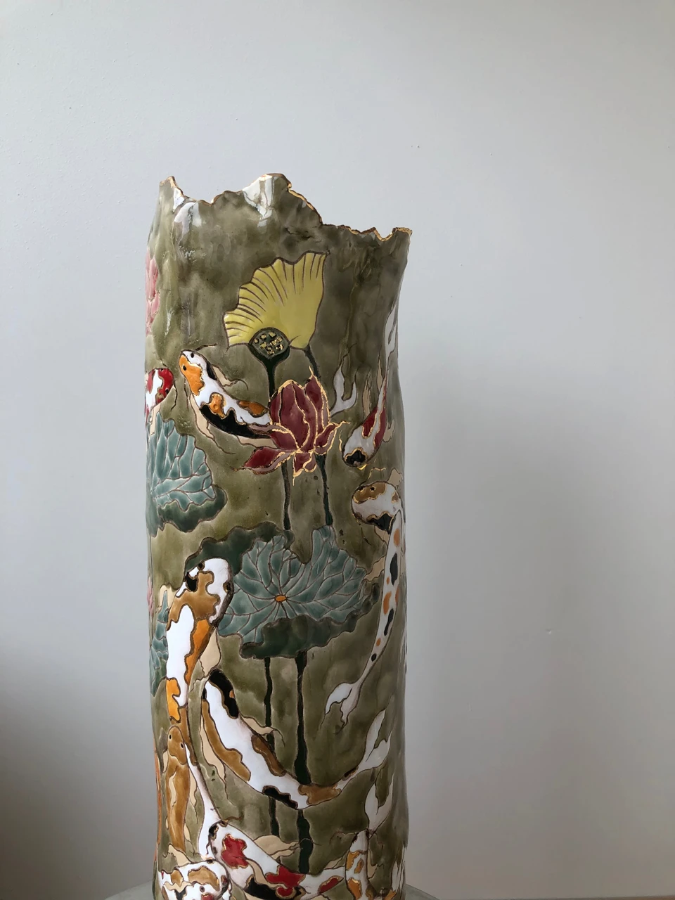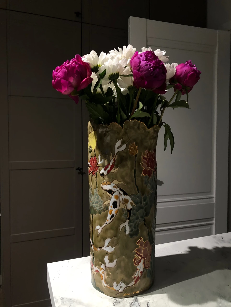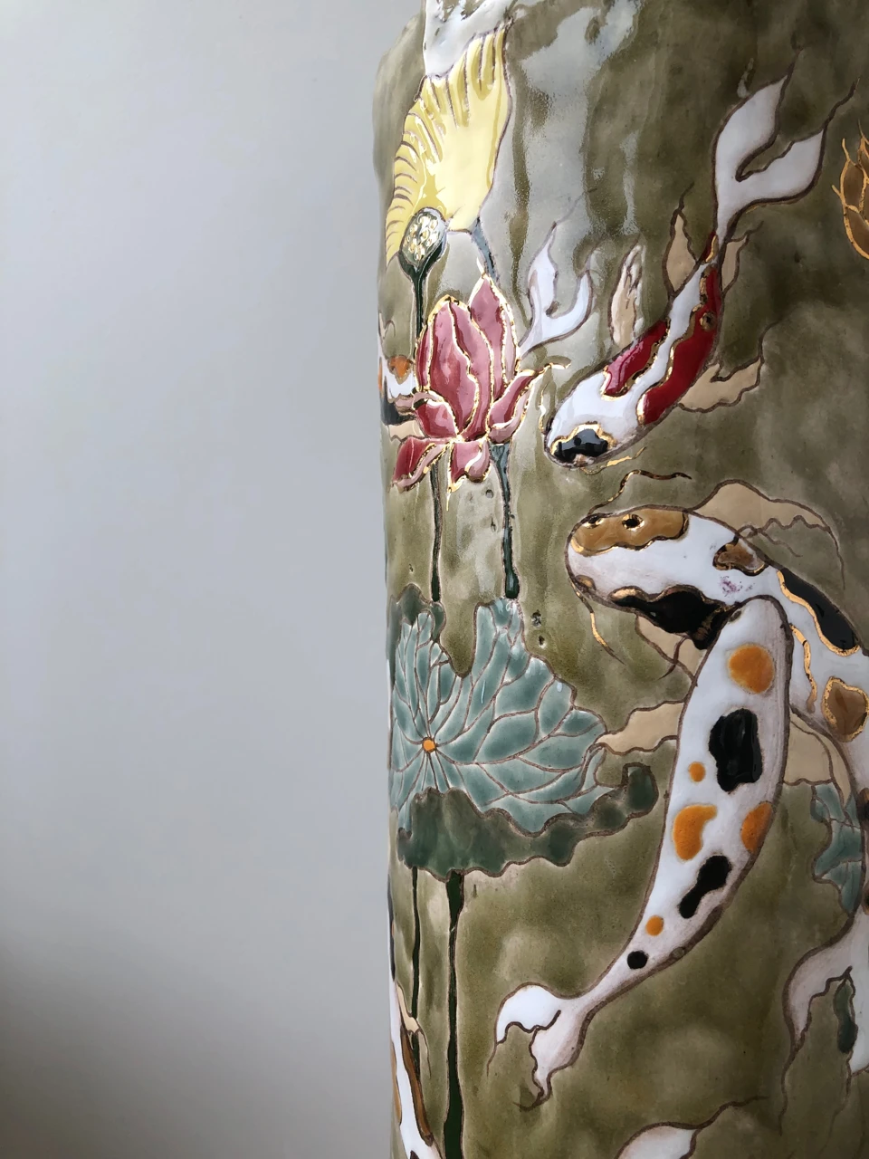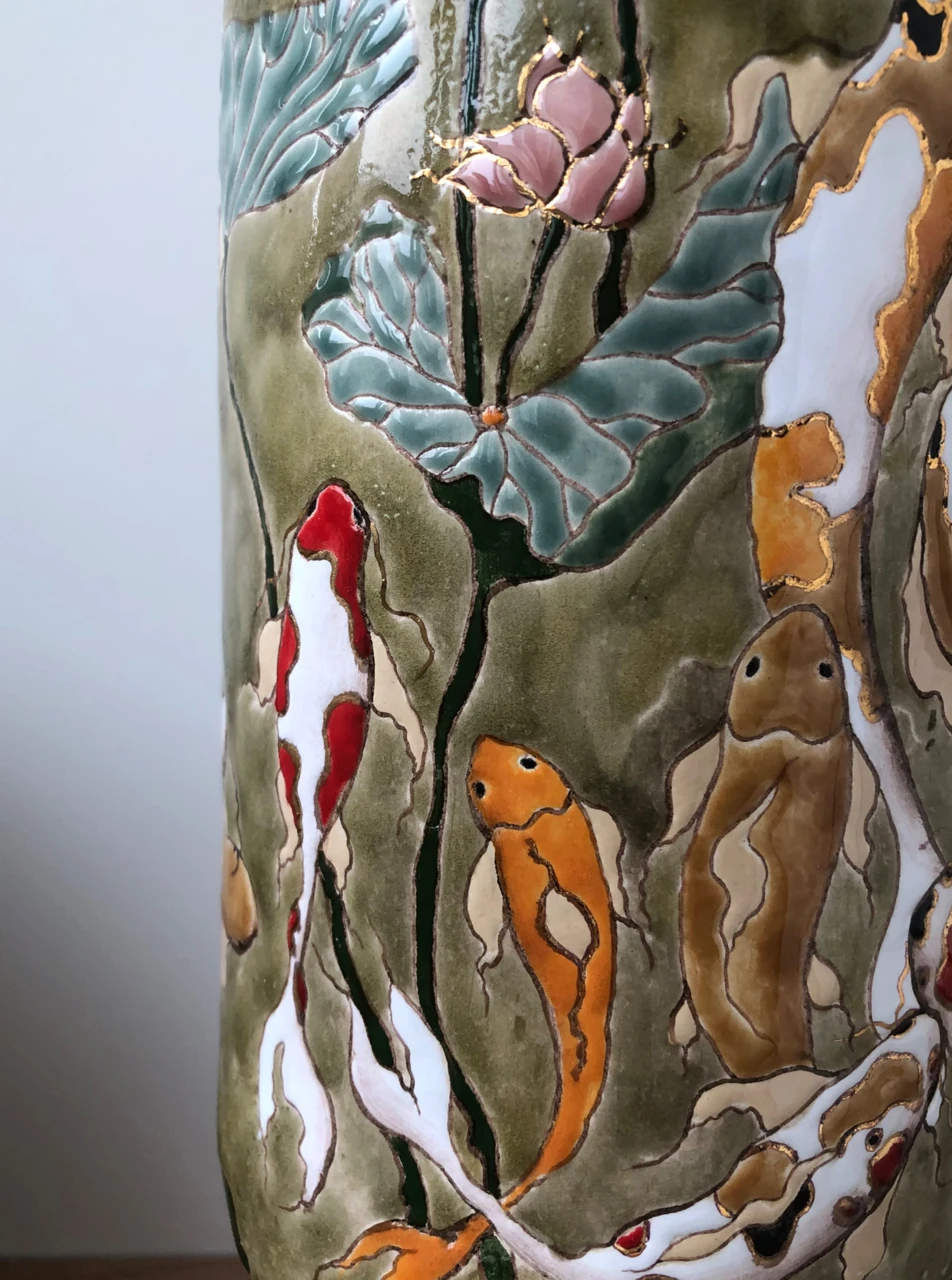 Ваза с рыбками кои — сестра-двойняшка. В данной серии создано две вазы с разным фоном (речной и морской) и разным дизайном.