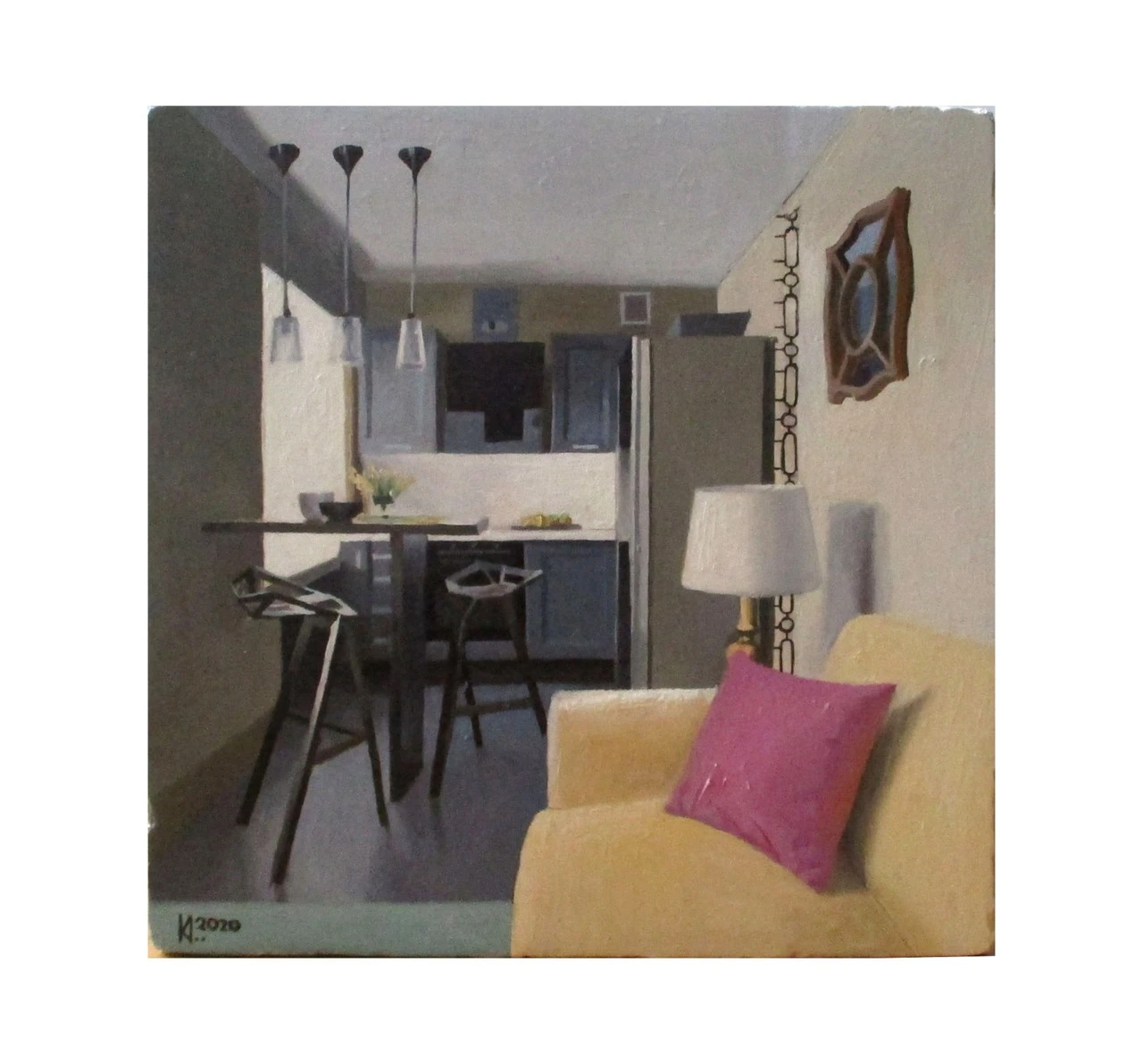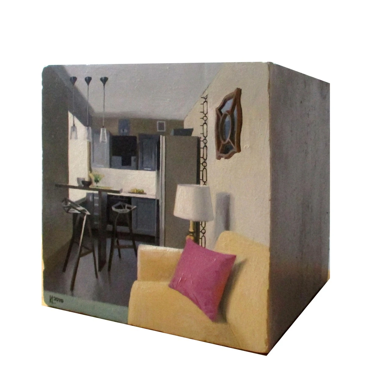 Обратной стороной живописной серии работ «Не жизнь, а сказка» стала мысль реализовать в художественной форме идеи архитекторов XX-XXI веков о необходимом, а значит минимальном, пространстве для жизни человека. «Ячейка» понимается мной как абсолютный минимум, она решена в форме куба и сделана из бетона, как наиболее распространённого и недорогого материала для жилого строительства. На одной из граней каждого куба изображена комната, а зачастую и все жилье целиком, с одним окном, спальным местом и пр.