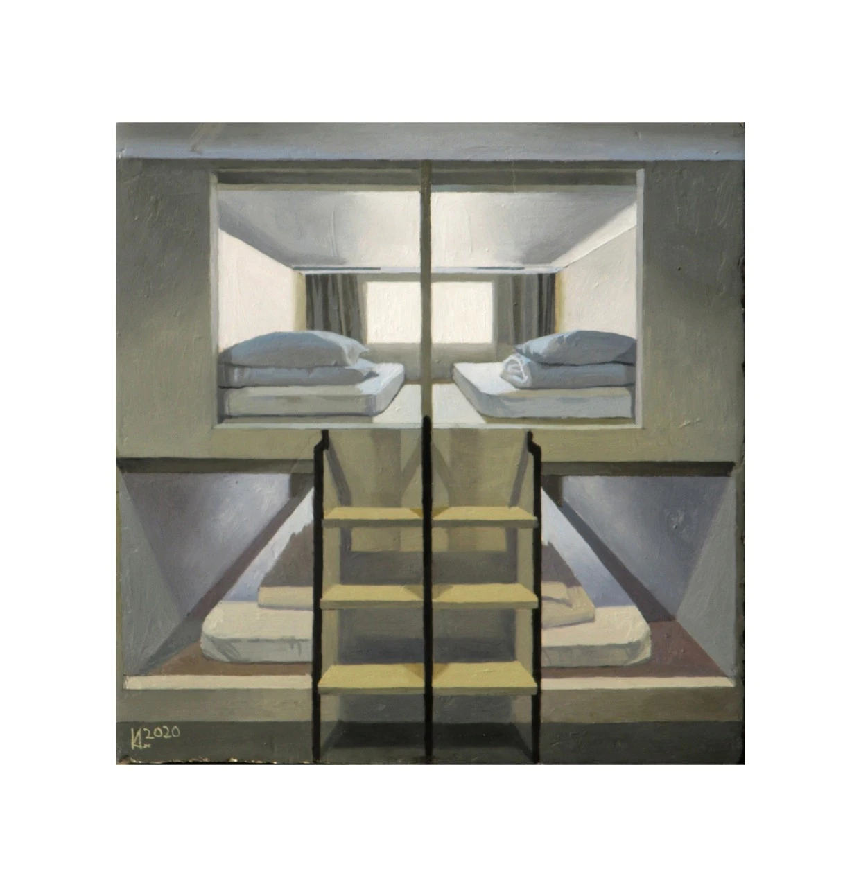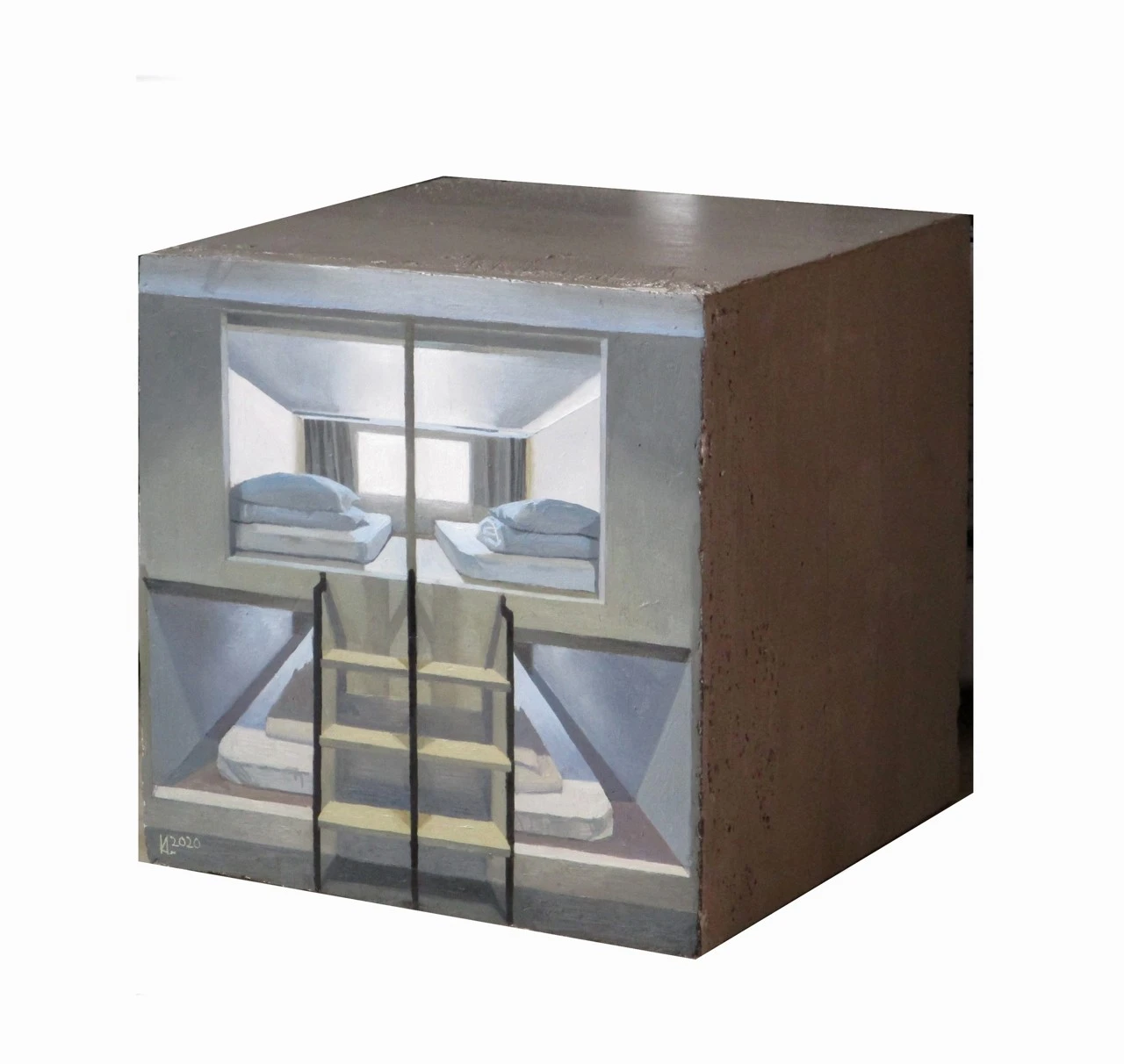 Обратной стороной живописной серии работ «Не жизнь, а сказка» стала мысль реализовать в художественной форме идеи архитекторов XX-XXI веков о необходимом, а значит минимальном, пространстве для жизни человека. «Ячейка» понимается мной как абсолютный минимум, она решена в форме куба и сделана из бетона, как наиболее распространённого и недорогого материала для жилого строительства. На одной из граней каждого куба изображена комната, а зачастую и все жилье целиком, с одним окном, спальным местом и пр.