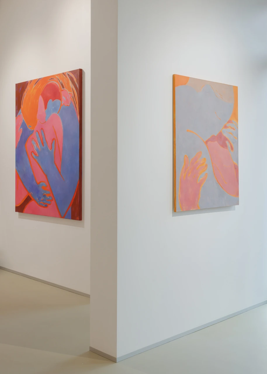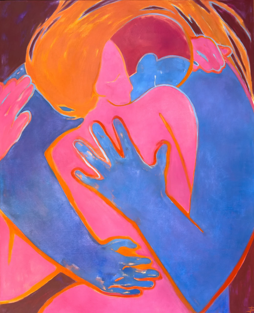 Работа «Вдвоем. Синий, розовый, оранжевый» — это авторская живописная композиция, выполненная маслом на холсте. На картине изображены две фигуры, объятые друг другом, что передает ощущение близости и интимности. Основные цвета — насыщенный синий, яркий розовый и теплый оранжевый — создают мощный визуальный контраст и подчеркивают эмоциональную напряженность сцены. Линии контуров добавляют динамики и выделяют силуэты на фоне более темного, глубокого пространства.