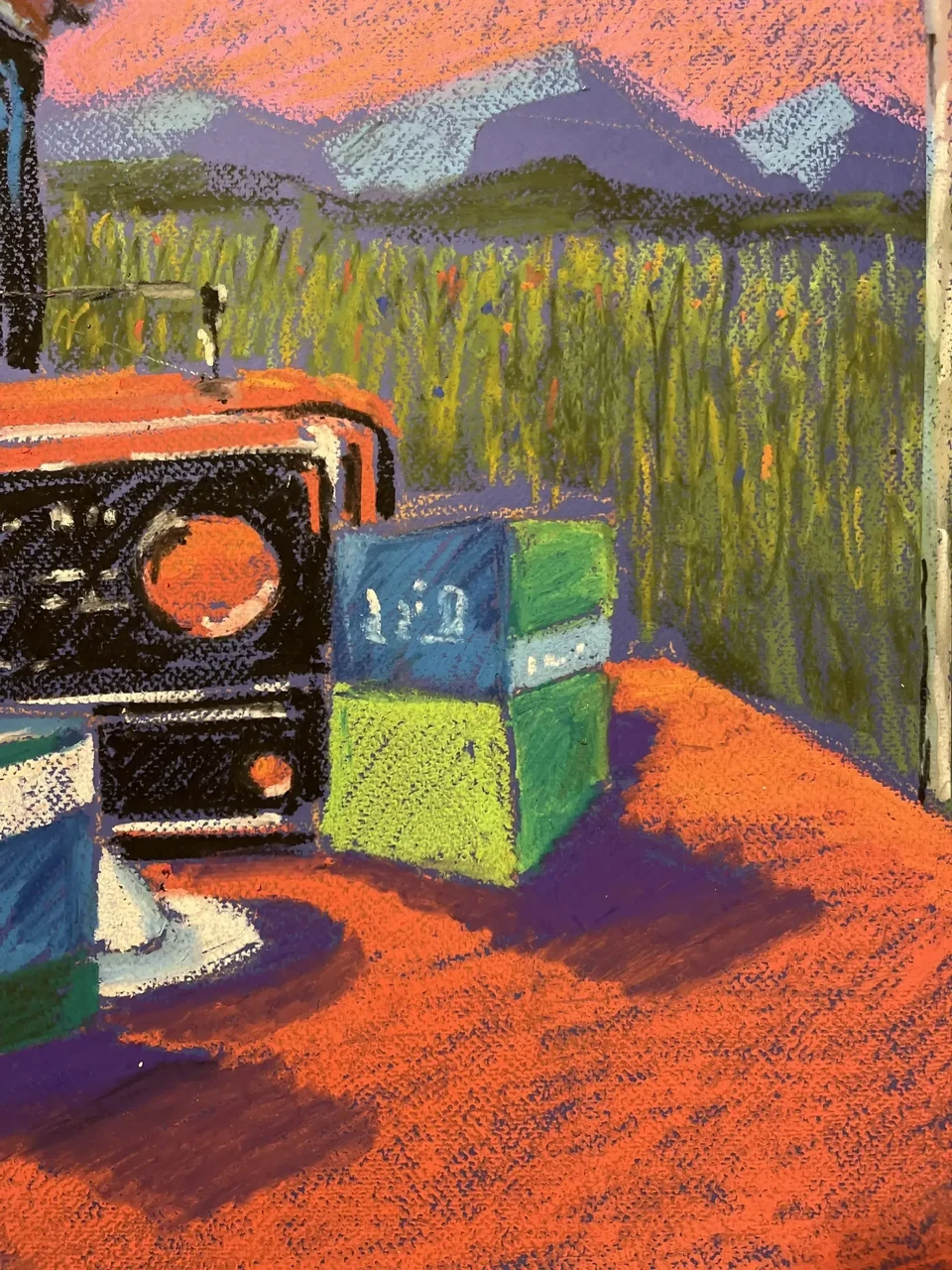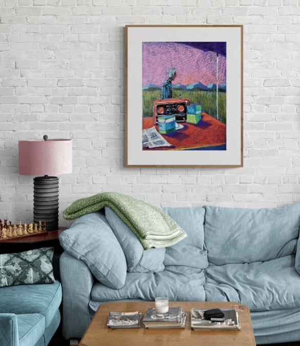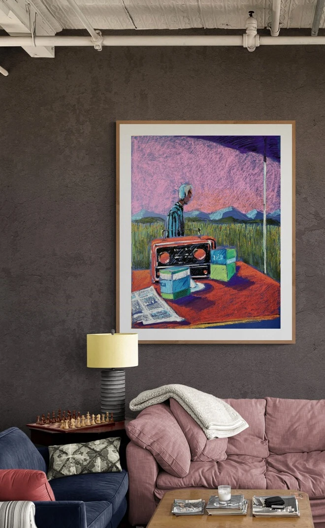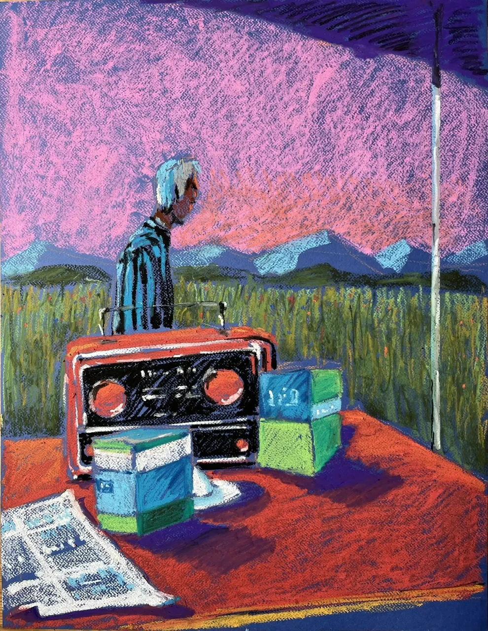 Момент полнейшего спокойствия — стакан, газета и радиоприёмник на столе в бескрайних полях под нежно-розовым небом.