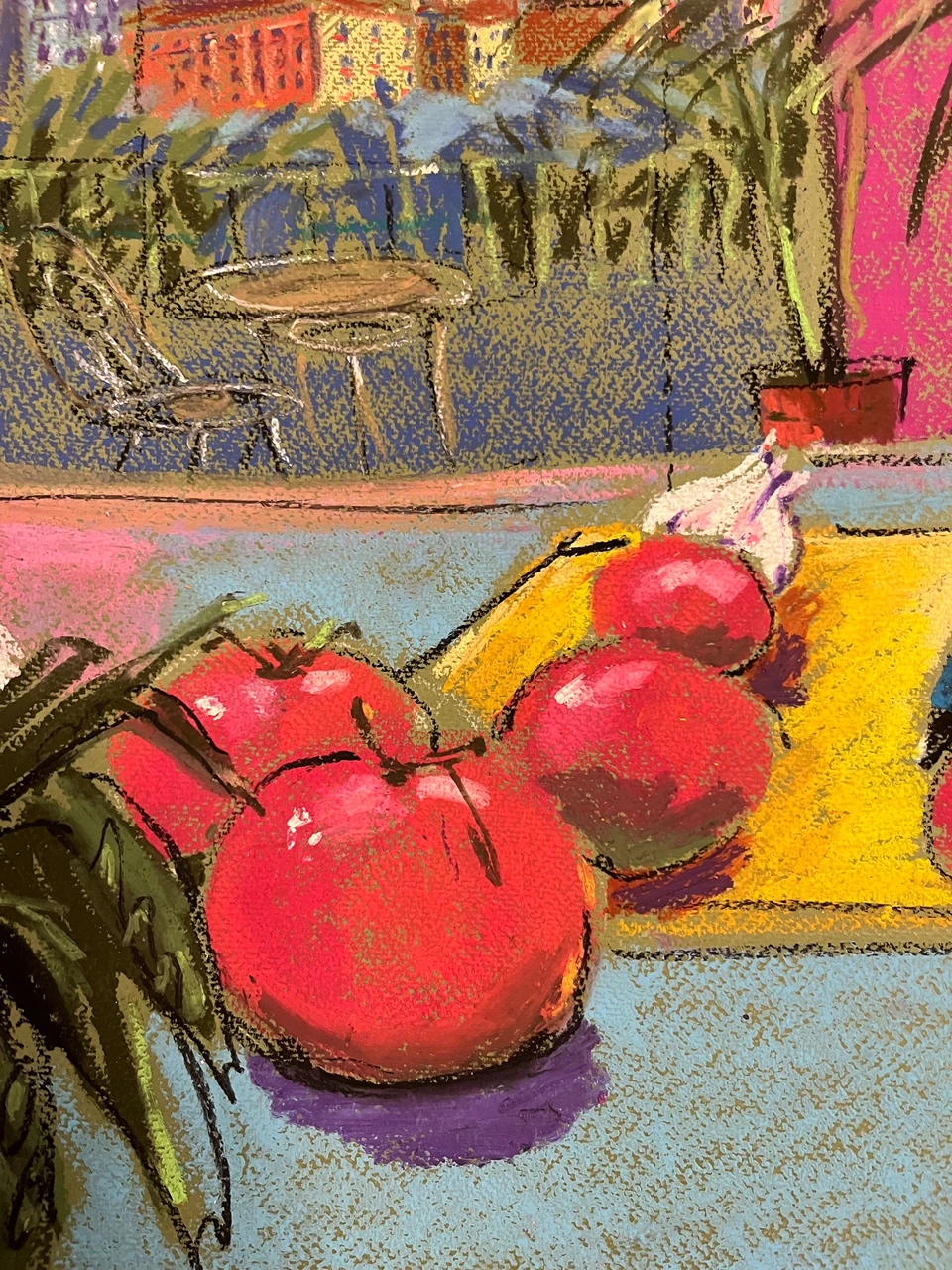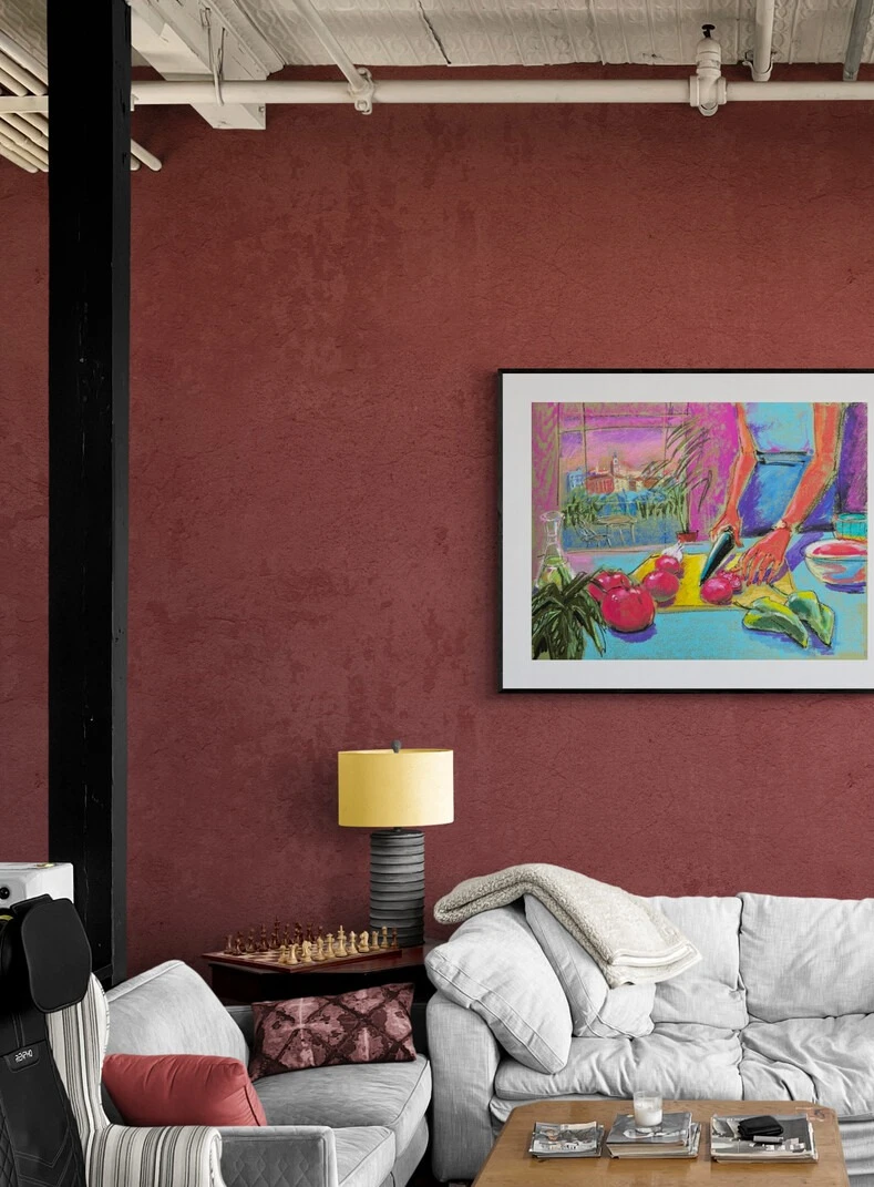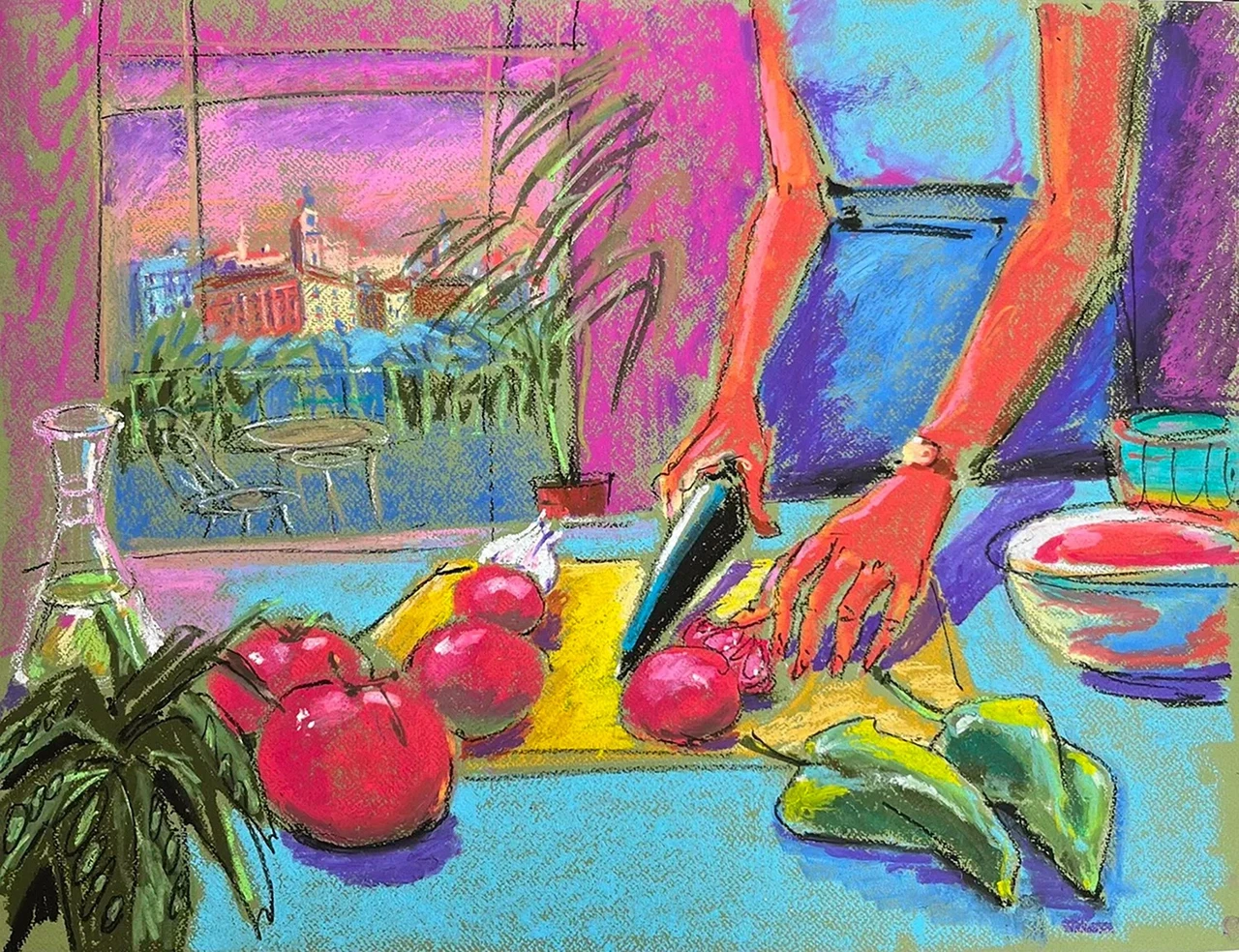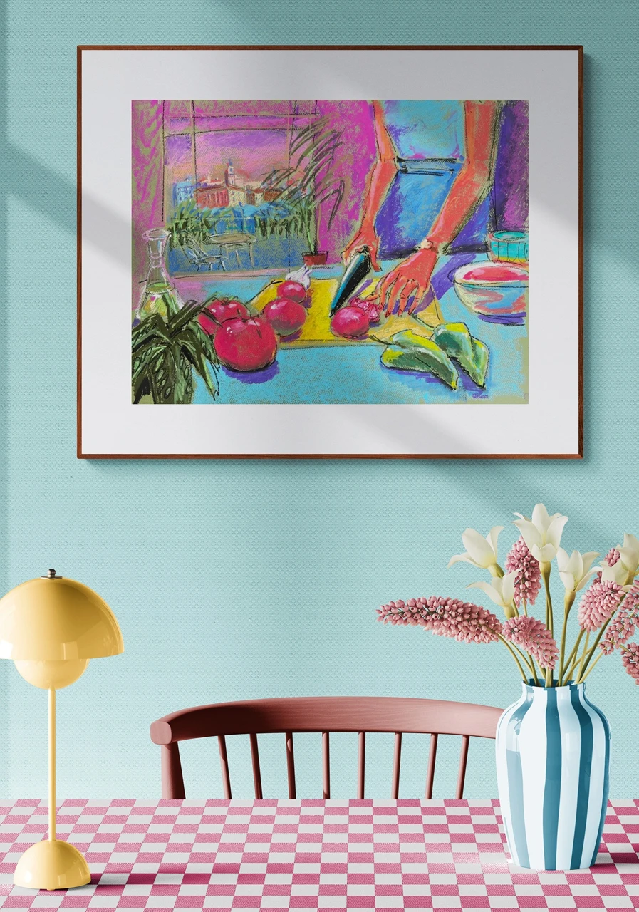 Работа из серии «Альмадовар», вдохновленная творчеством мастера испанских страстей. Овощи на грани флирта и фатальности, нож сверкает на закатном мадридском солнце. Кулинарная драма, где закат приправлен легкой иронией и запахом спелых томатов. Здесь ужин становится исповедью.