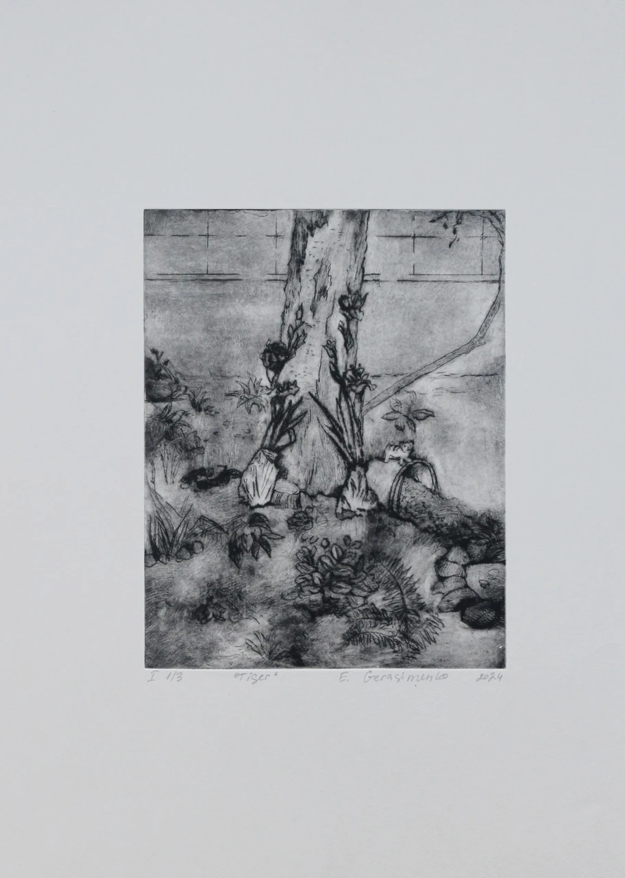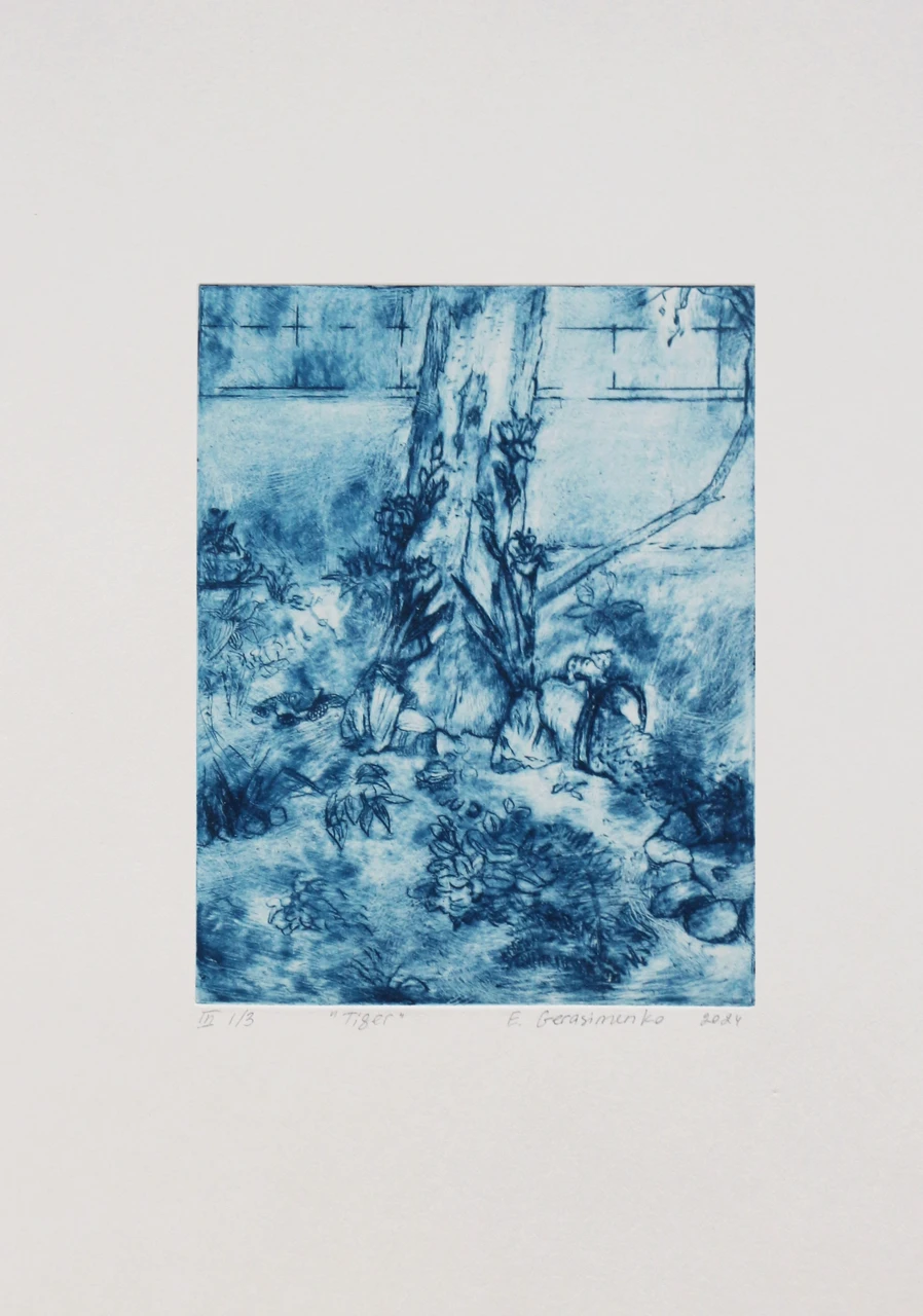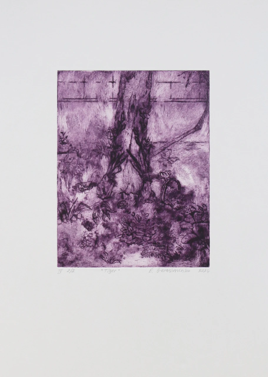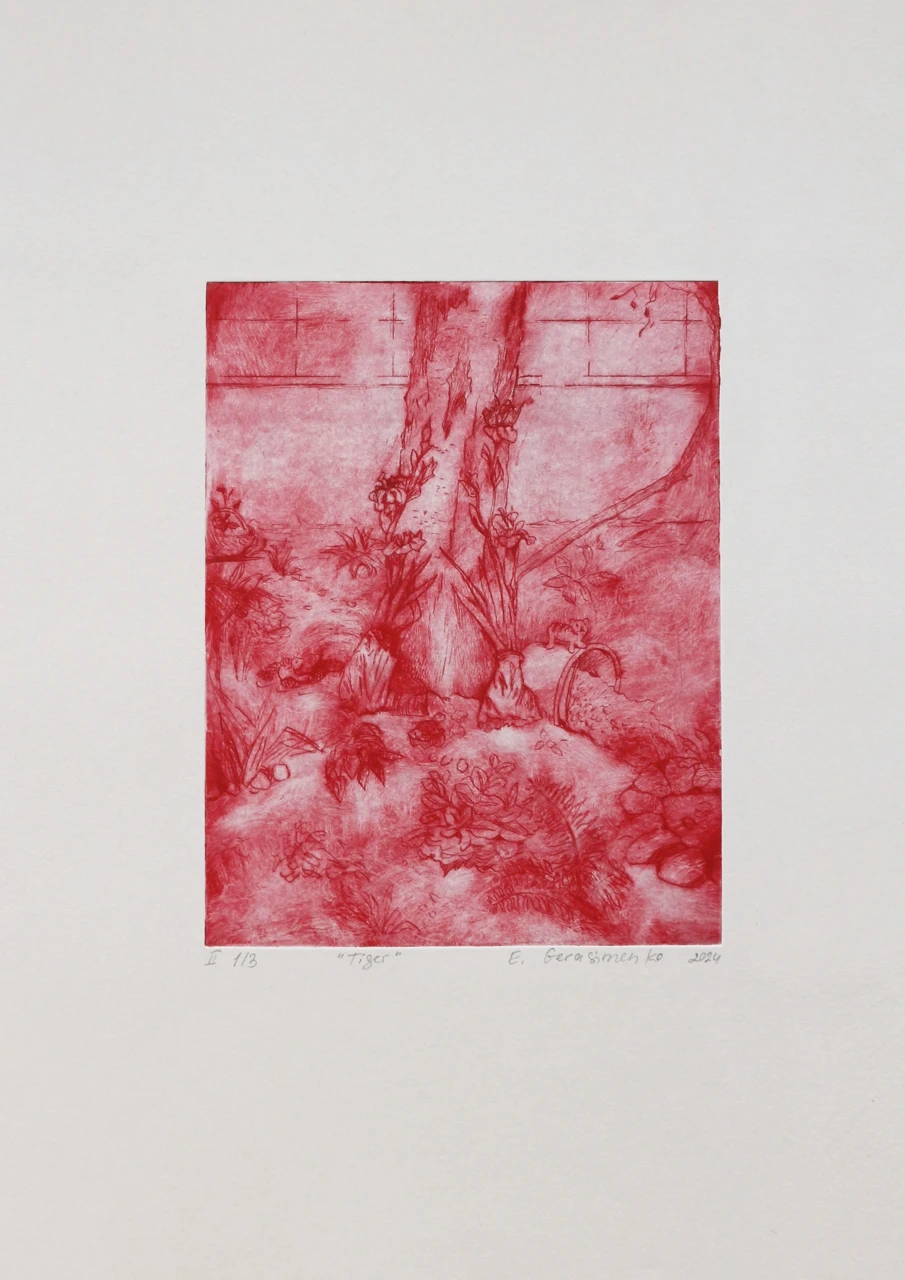 Серия «Shady backstage», выполненная в технике сухой иглы, фиксирует причудливый мир ЖКХ-арта — самодельные клумбы и инсталляции из игрушек, которые создают параллельную, одушевлённую реальность в пространстве типовой застройки.