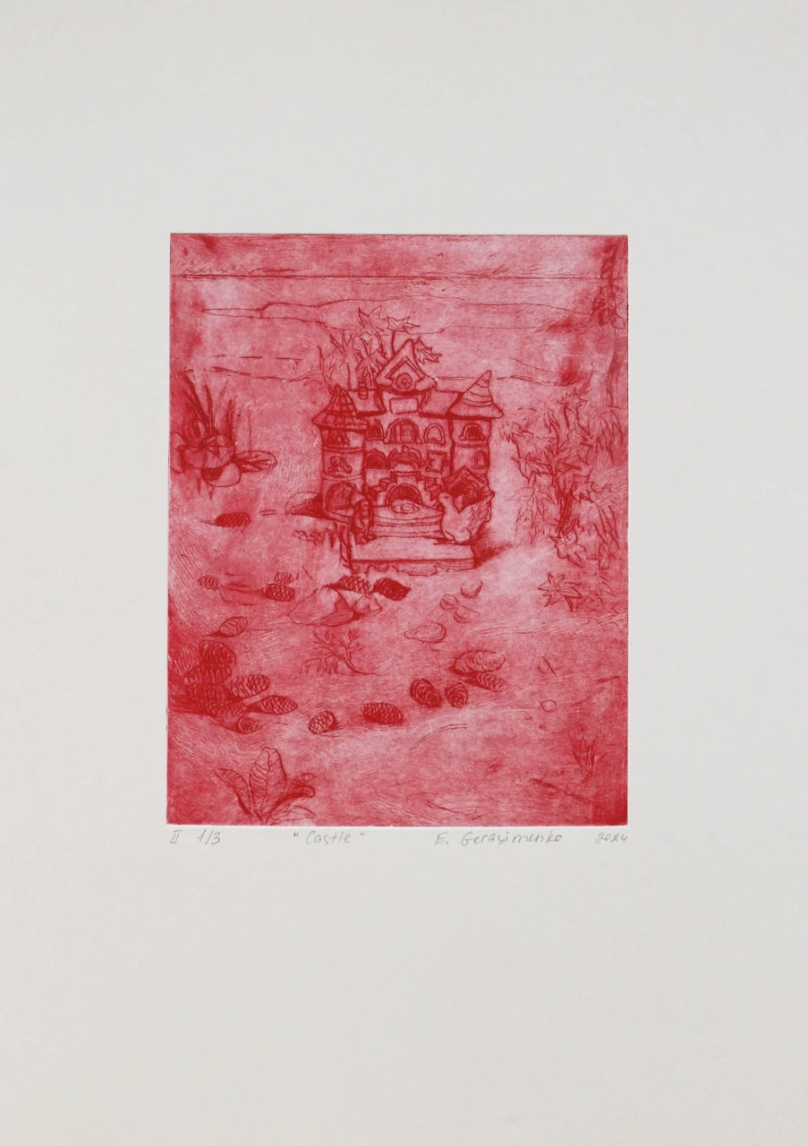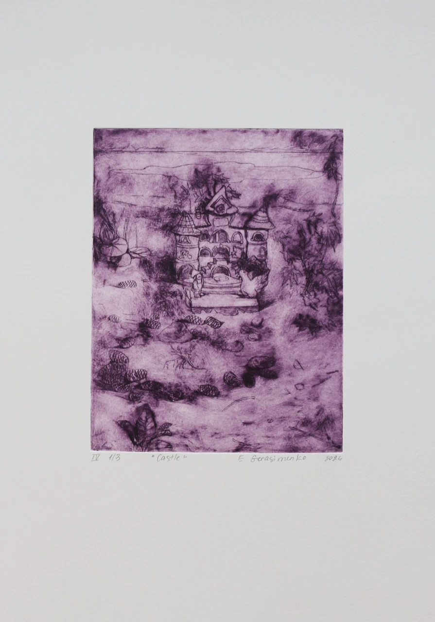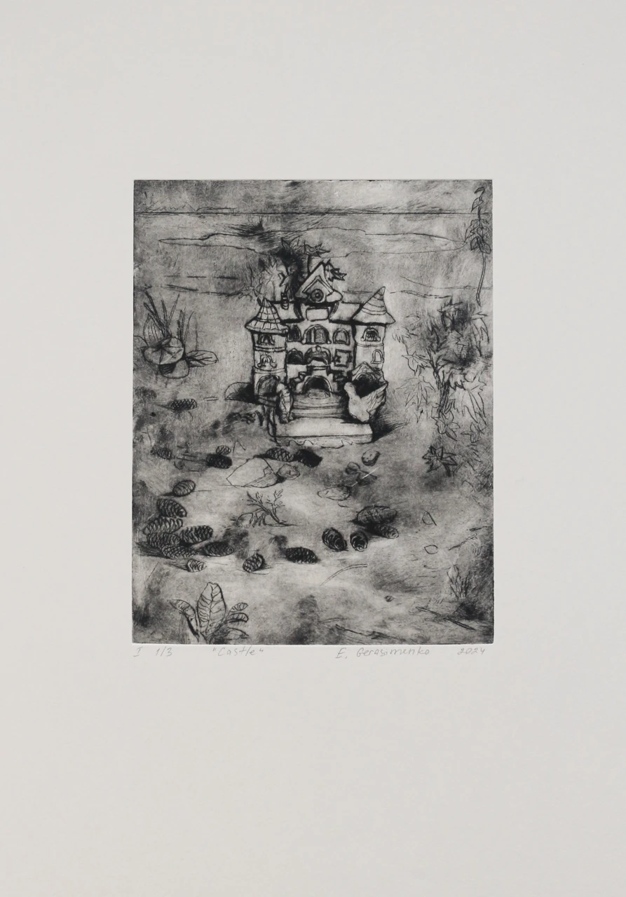 Серия «Shady backstage», выполненная в технике сухой иглы, фиксирует причудливый мир ЖКХ-арта — самодельные клумбы и инсталляции из игрушек, которые создают параллельную, одушевлённую реальность в пространстве типовой застройки. Работы созданы в Центре художественного производства «Своды»