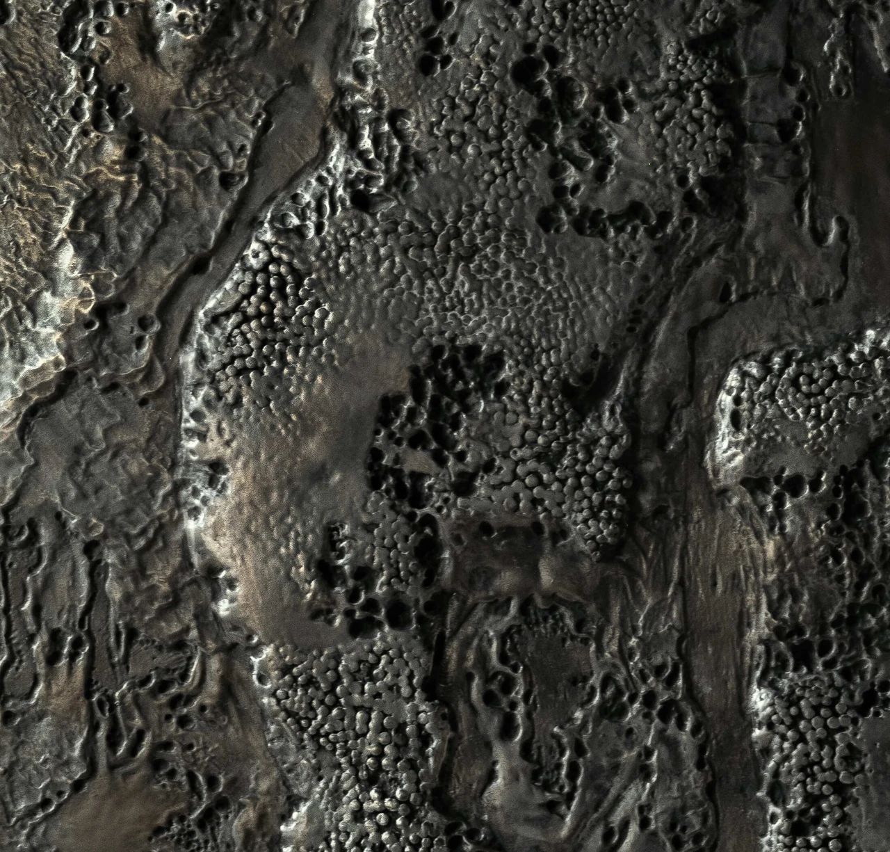 Скульптурное панно выполнено в авторской технике работы с жидким металлом. Богатый рельеф работы акцентирует внимание на материальности предмета. Здесь нет ни одной повторяющейся линии и высоты.