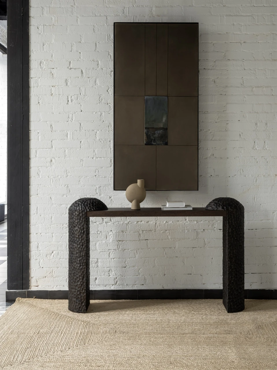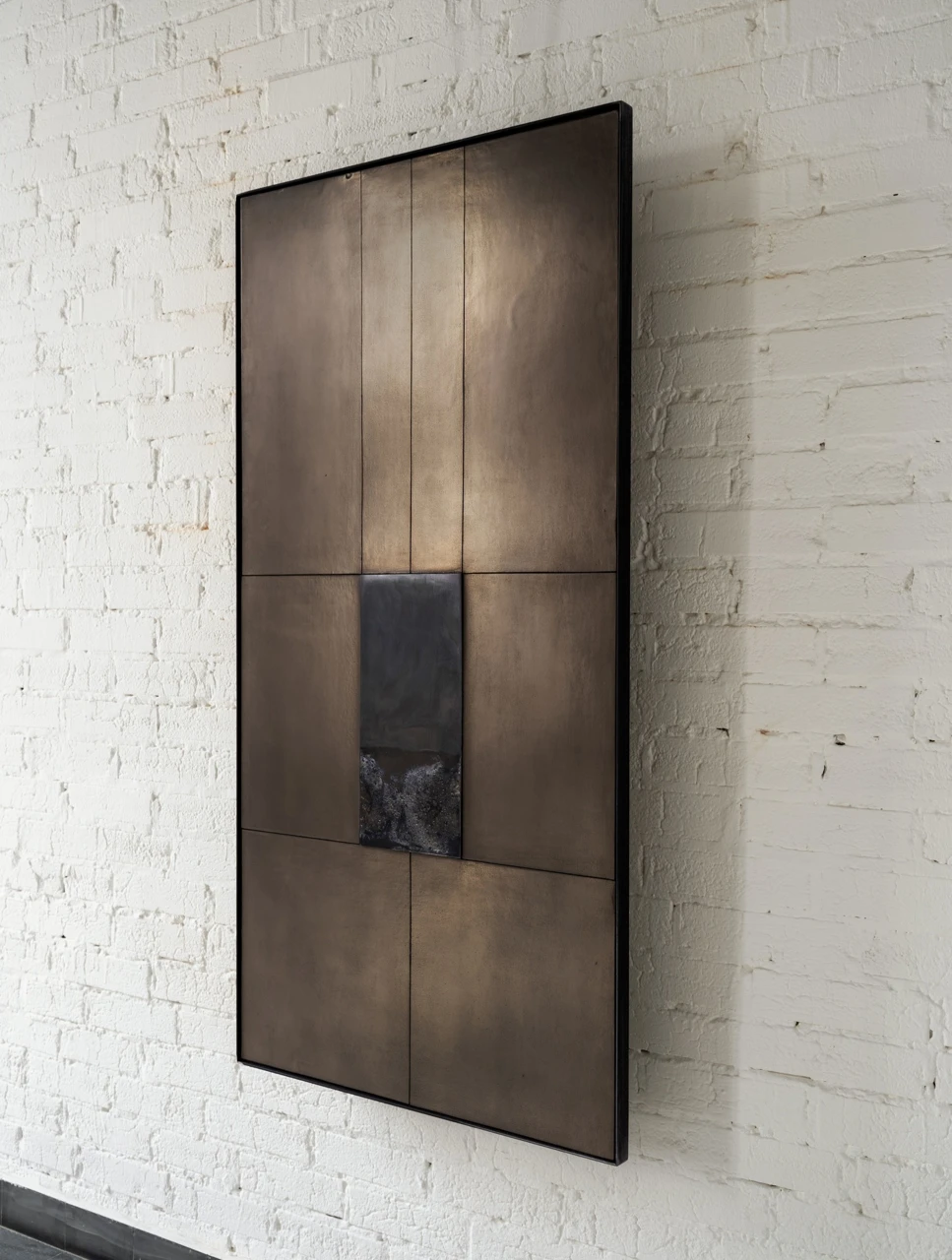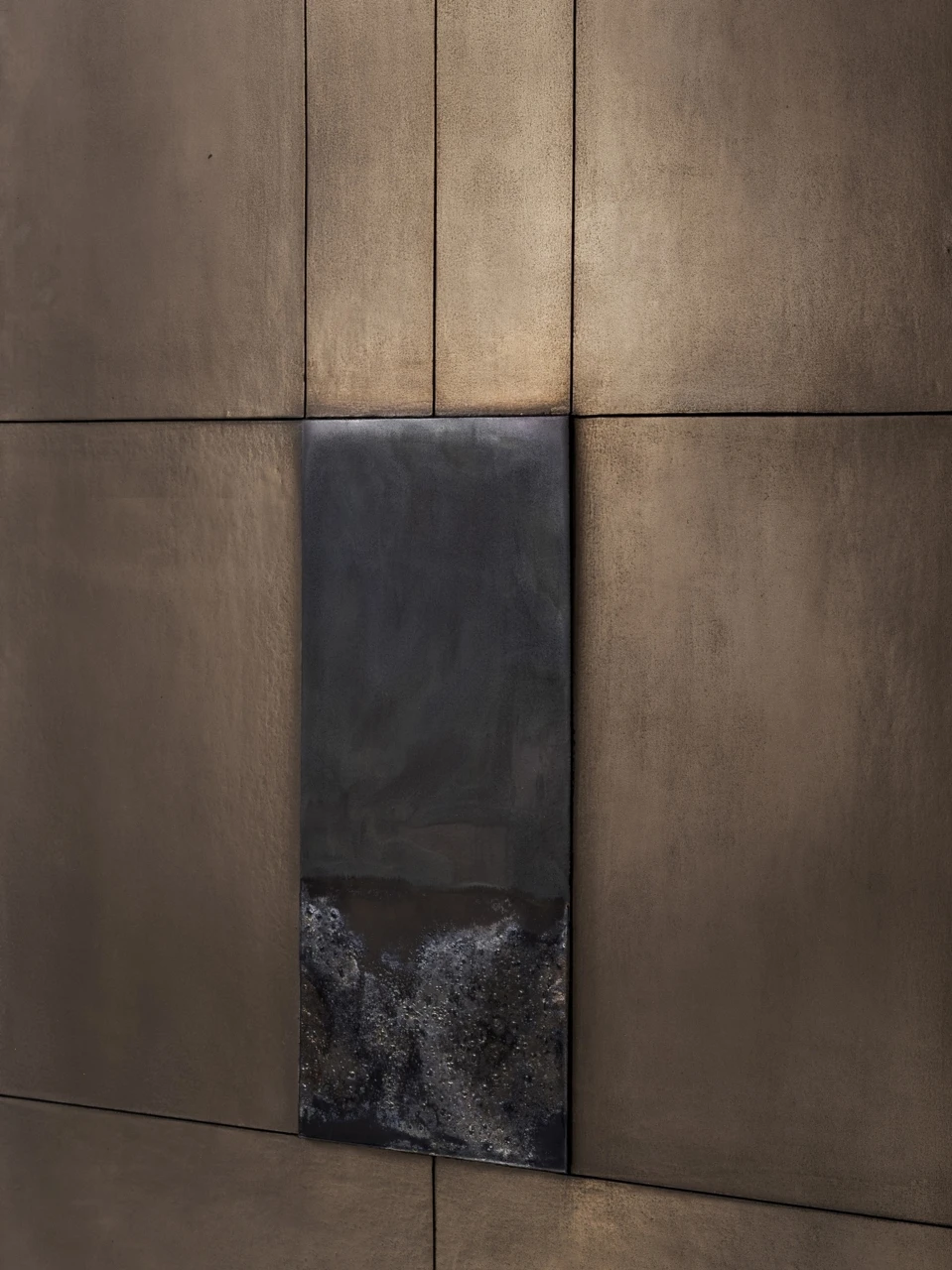 Работа «CODES I» выполнена в бронзе, глазури на центральном элементе в градиенте природных оттенков. Скульптурное панно выглядит каждый раз по-новому, в зависимости от сценария освещения, игра света добавляет ему динамику.