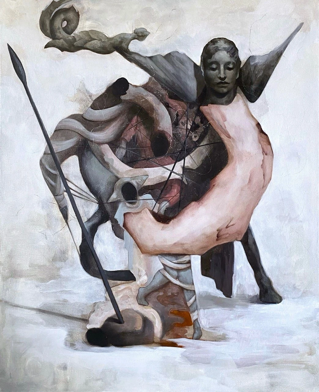 На полотне разворачивается аллегория битвы, где боги и люди сливаются в одно биоморфное существо, символизируя взаимосвязь высшего и низшего. Каждый персонаж, линия и цвет — это переосмысленный исторический нарратив, отражающий мой художественный взгляд. Я стремлюсь передать глубину литературы через визуальный символизм, придавая новым измерениям знакомые мифы. В этом соединении скрыта суть человеческого существования — бесконечный поиск гармонии между вечным и переходящим.
