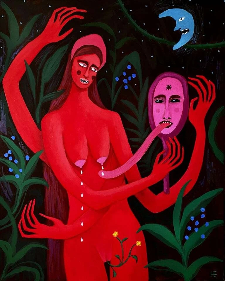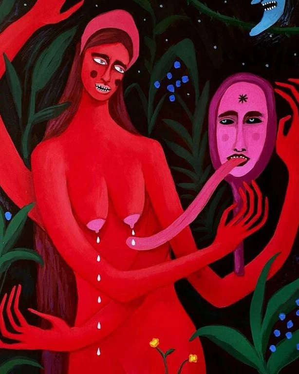 Работа «Кто на свете всех милее» — это авторская работа, выполненная маслом на холсте. Композиция погружает зрителя в мистический ночной пейзаж, где доминирует яркая красная фигура с множеством рук. Ее тело и лицо, выполненные в экспрессивной манере, контрастируют с темнотой фона и зеленью растений. Особое внимание привлекает сюрреалистический элемент: длинный язык, вытягивающийся из красной фигуры к розовой маске, которую она держит в руках. В верхней части композиции изображен синий месяц с выразительным лицом, добавляющий работе элемент сказочности и загадочности. Цветовая палитра, построенная на контрасте красного, зеленого и синего, создает напряженную, но завораживающую атмосферу. Детали, такие как капли, стекающие с груди, и цветок у основания фигуры, добавляют глубины и символизма.