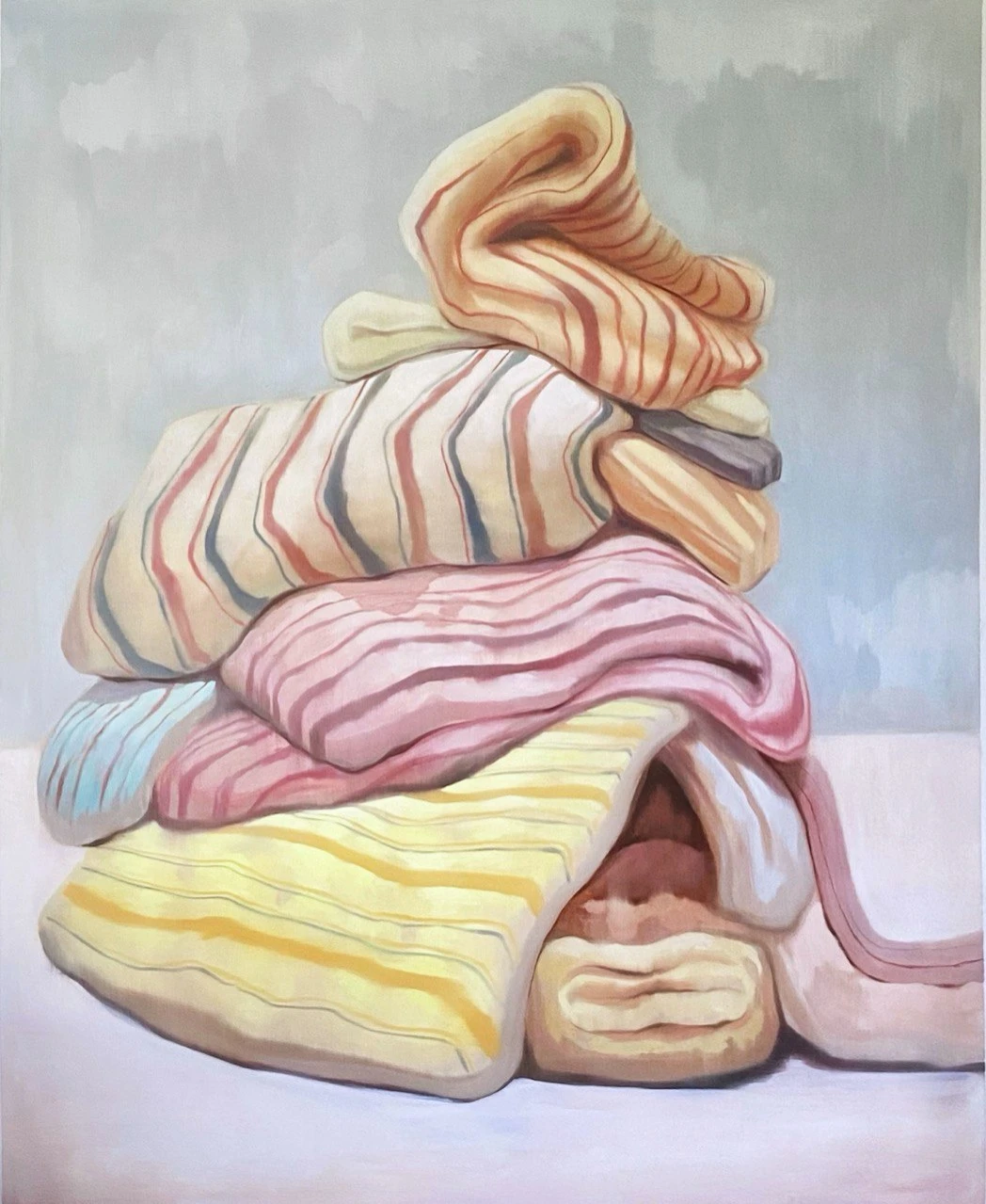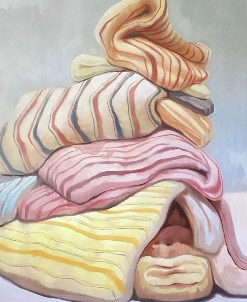 Картина «Пирамида потребностей», изображающая огромную гору из ватных матрасов, представляет собой ироничную метафору человеческих желаний и стремлений. Матрасы, нагромождённые друг на друга, символизируют материальные потребности, которые люди часто ставят во главу угла, забывая о действительно важных вещах. Беспорядочная пирамида намекает на то, что погоня за комфортом и удобствами может превратиться в бесконечную гонку, где каждая удовлетворённая потребность порождает новую. Художница показывает, как легко материальные ценности становятся самоцелью, превращая жизнь в бесконечное накопление. При этом неустойчивая конструкция из матрасов говорит о том, что истинное счастье невозможно построить только на физическом комфорте — оно требует духовного развития и гармонии. Картина заставляет задуматься о настоящих приоритетах в жизни и о том, что истинное благополучие не измеряется количеством вещей.