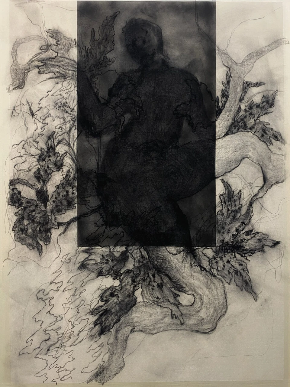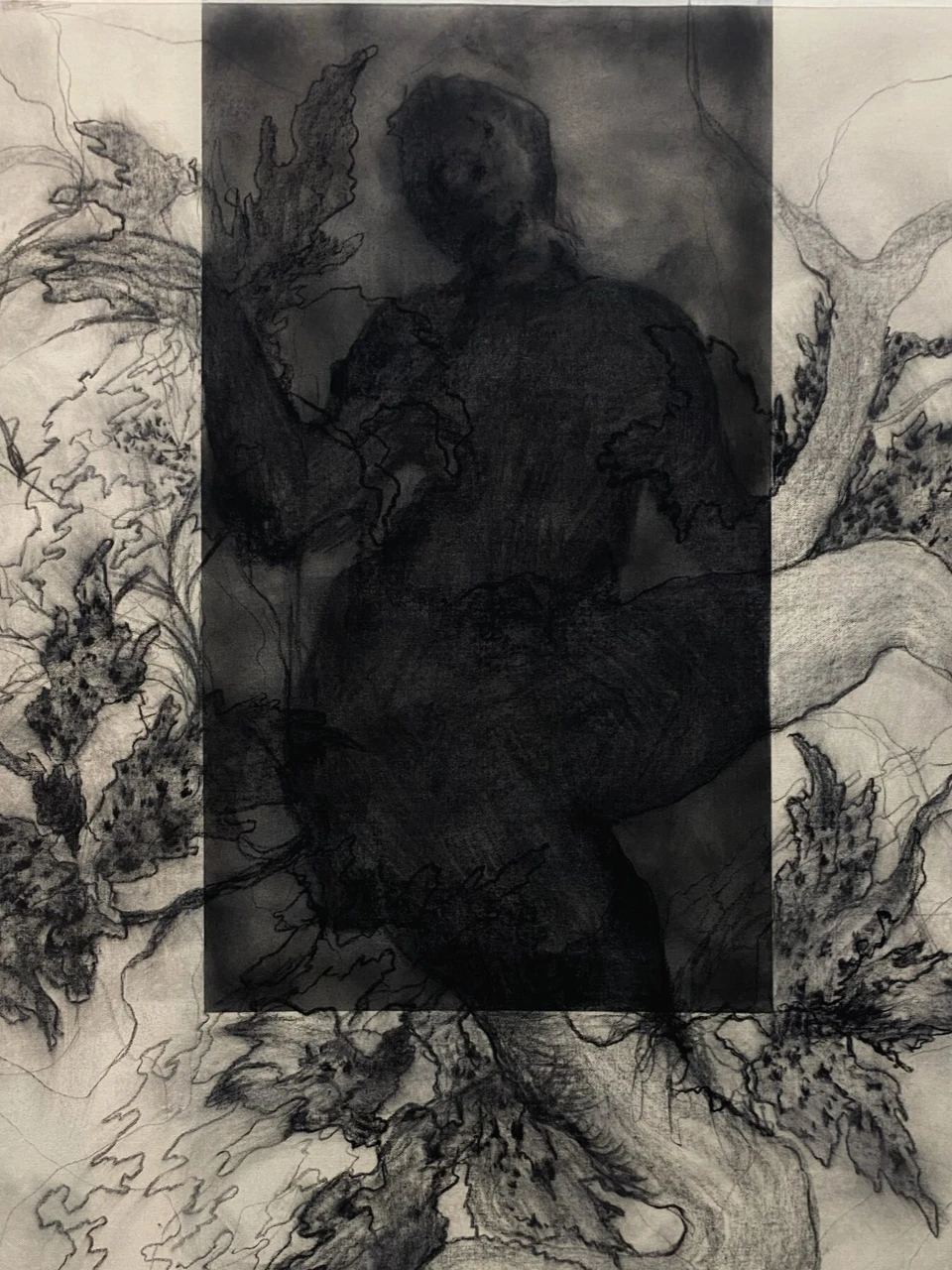 Работа «Прорастание» выполнена в технике графики с использованием угля и масла на холсте. Композиция построена на контрасте между темной, силуэтной фигурой человека, погруженной в себя, и динамичными, экспрессивными линиями, напоминающими растительные формы или стихийные потоки. Фигура человека, расположенная в центре, кажется частью природного или метафорического процесса прорастания, где ее очертания размываются и переплетаются с окружающими элементами. Визуальная составляющая работы акцентирует внимание на взаимодействии света и тени, создавая ощущение глубины и таинственности. Грубые, энергичные мазки угля передают текстуру и объем, в то время как масло придает изображению мягкость и некоторую призрачность.