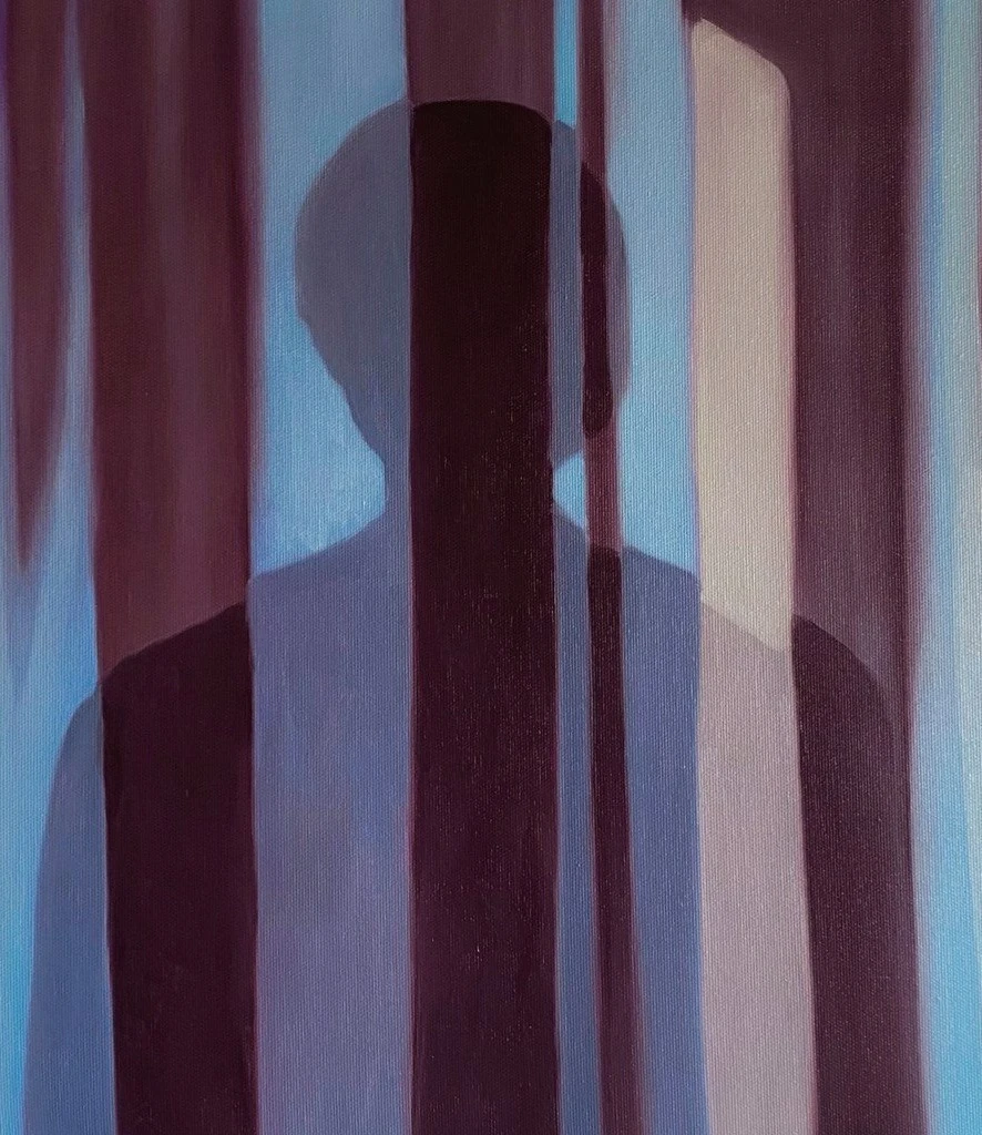 Работа «Занавес» — это авторская живописная композиция, выполненная маслом на холсте. Центральным элементом является силуэт человека, проступающий сквозь вертикальные полосы, напоминающие драпировку или занавес. Теплые оттенки бордового и холодные тона голубого и сиреневого создают ощущение глубины и загадочности, подчеркивая игру света и тени. Фигура человека растворяется в абстрактном пространстве, что придает работе многослойность и интригу.