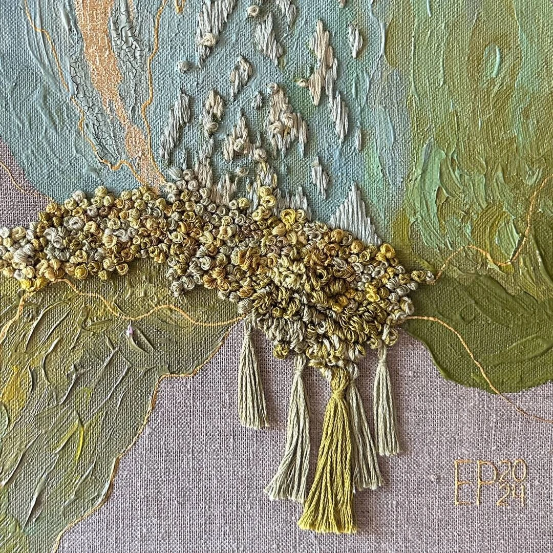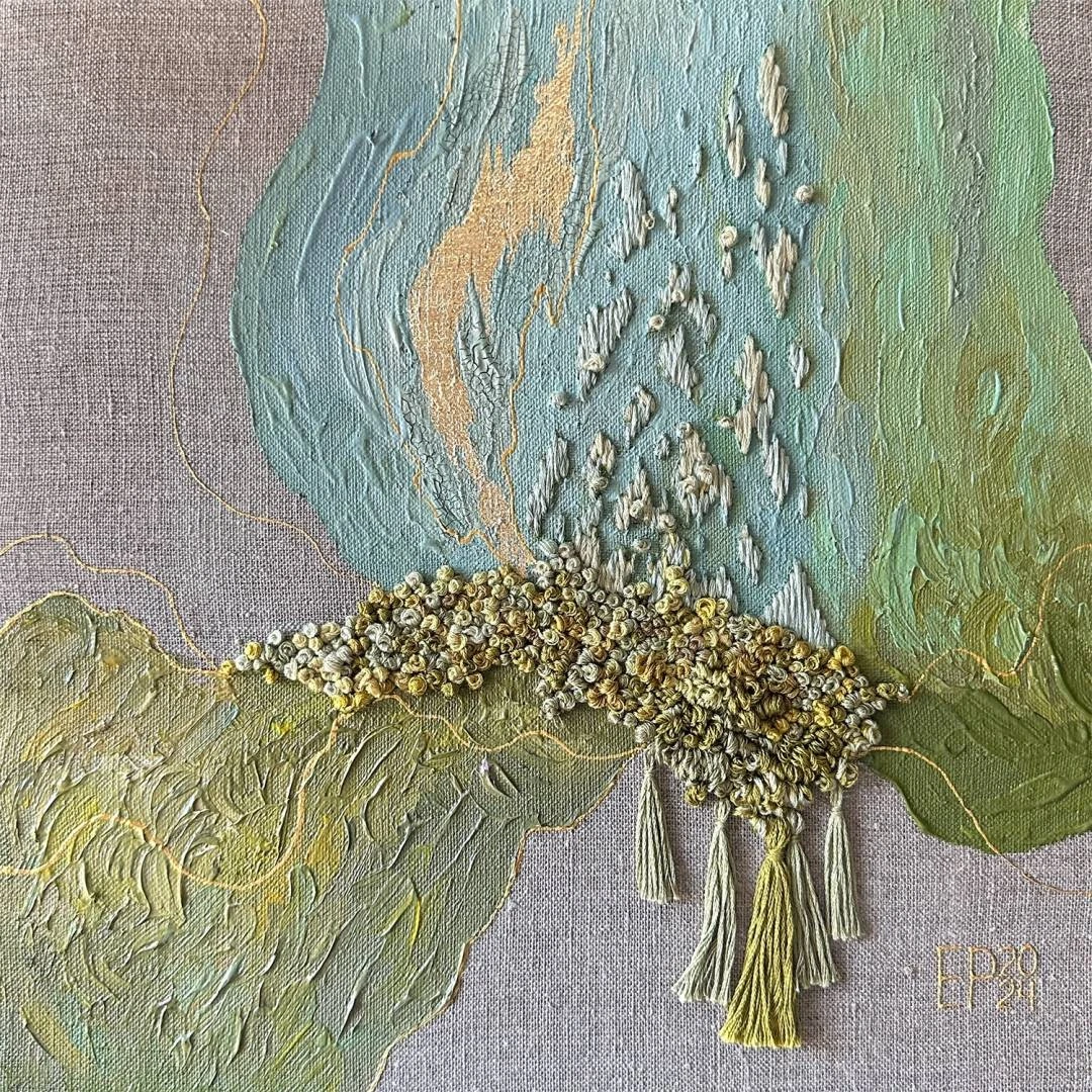 Работы серии «Оттенки и текстуры природы» отражают разные состояния окружающей среды. Панно выполнено в смешанной технике, сочетающей акриловую роспись, вышивку, позолоту поталью.