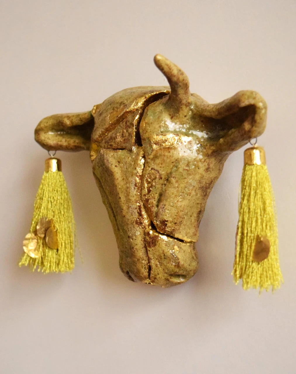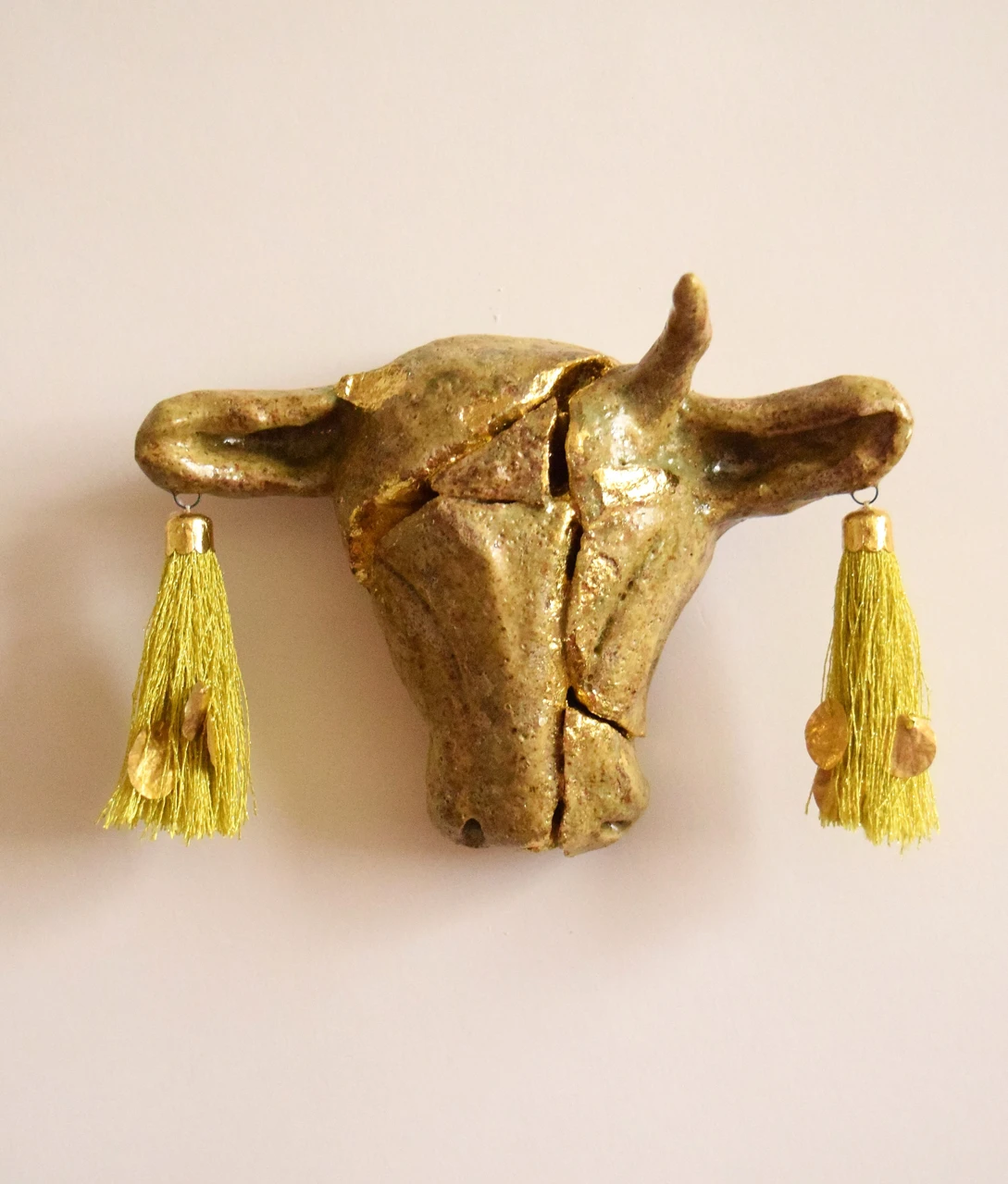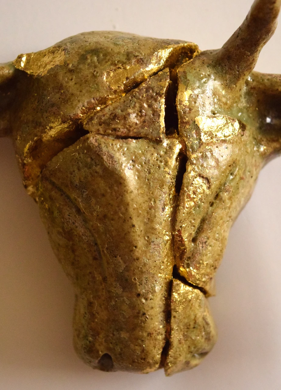 Работа серии — будто артефакт, изъятый археологами из земли. С отломанным рогом, склеенная обжигом на глазурь, образ обращается к зрителю словно из древности. Вдохновлена архитектурными элементами древних храмов Грузии, Армении, Турции. Работа посвящена теме самоценности личности сквозь разрушение и пересборку.