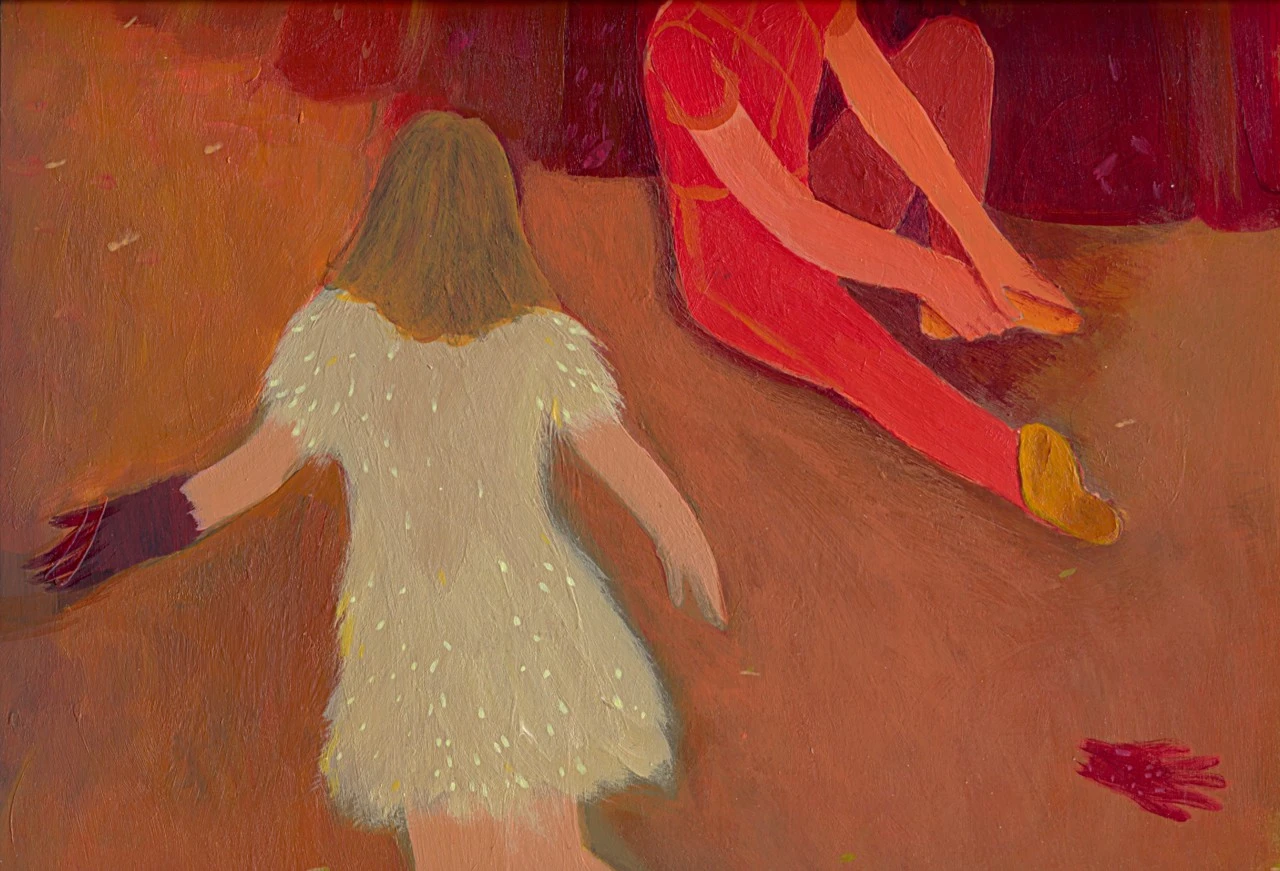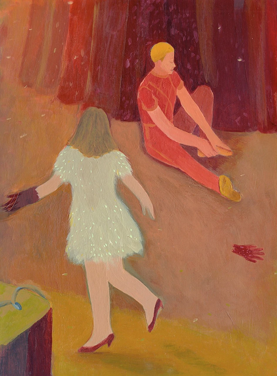 Пока сцена отдыхает, драма разыгрывается закулисами. Гимнаст готовится к триумфу, а девушка теряет перчатку. Не просто аксессуар, а символ рассеянности и очарования.