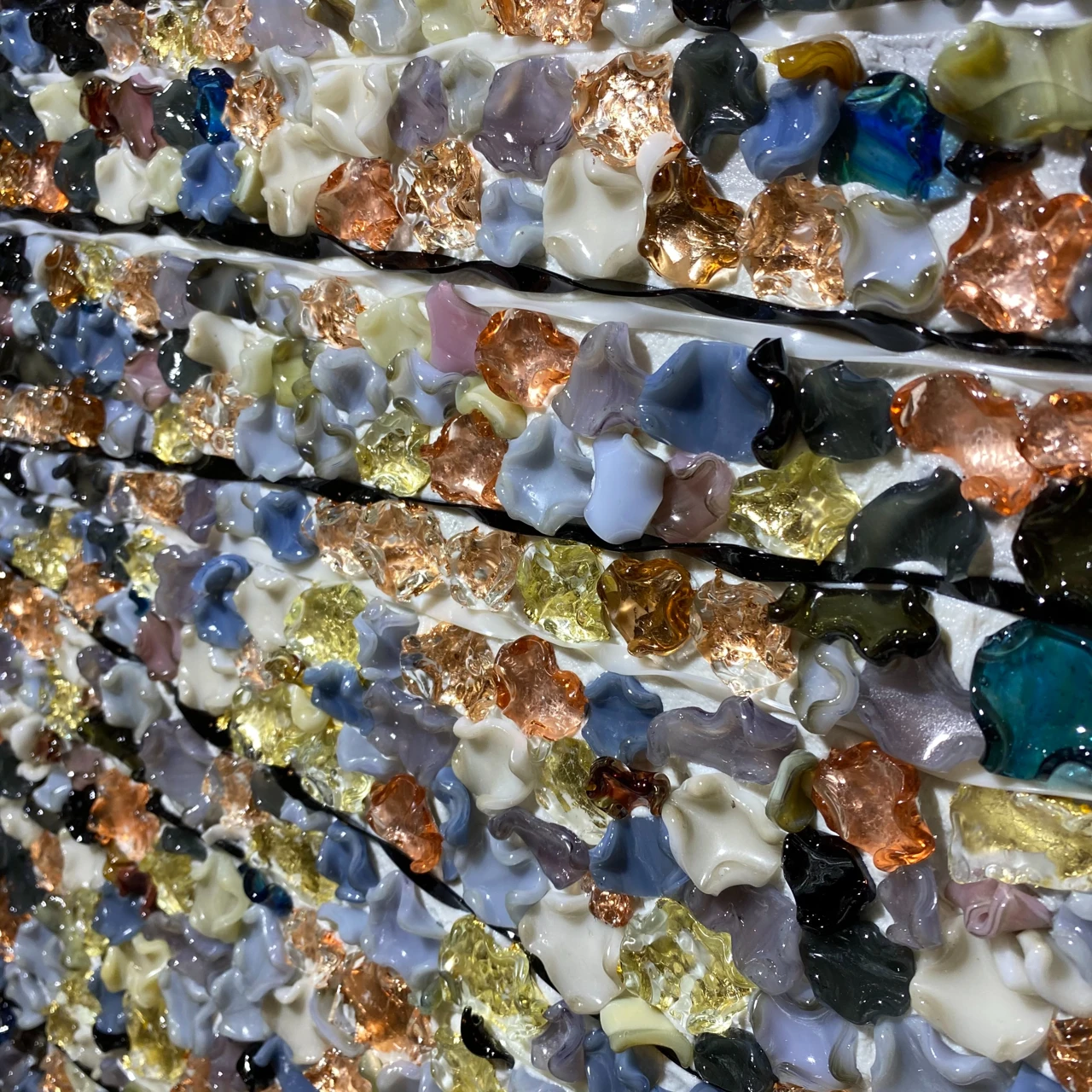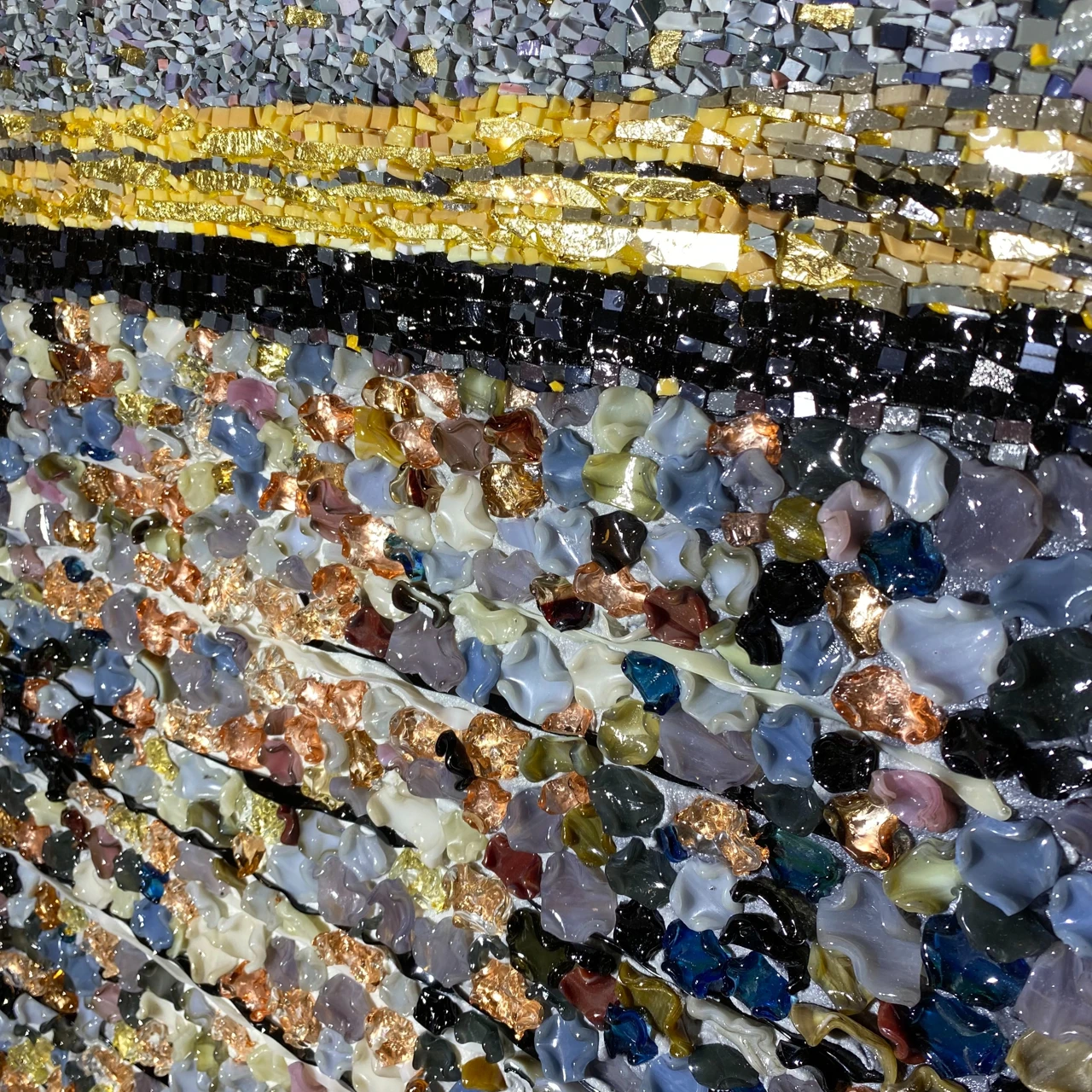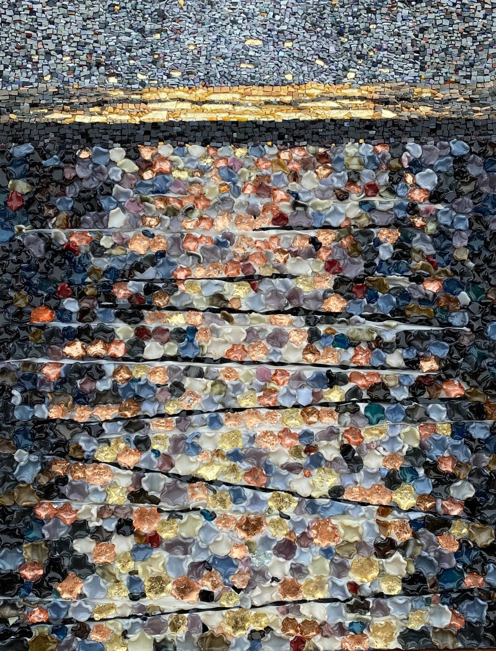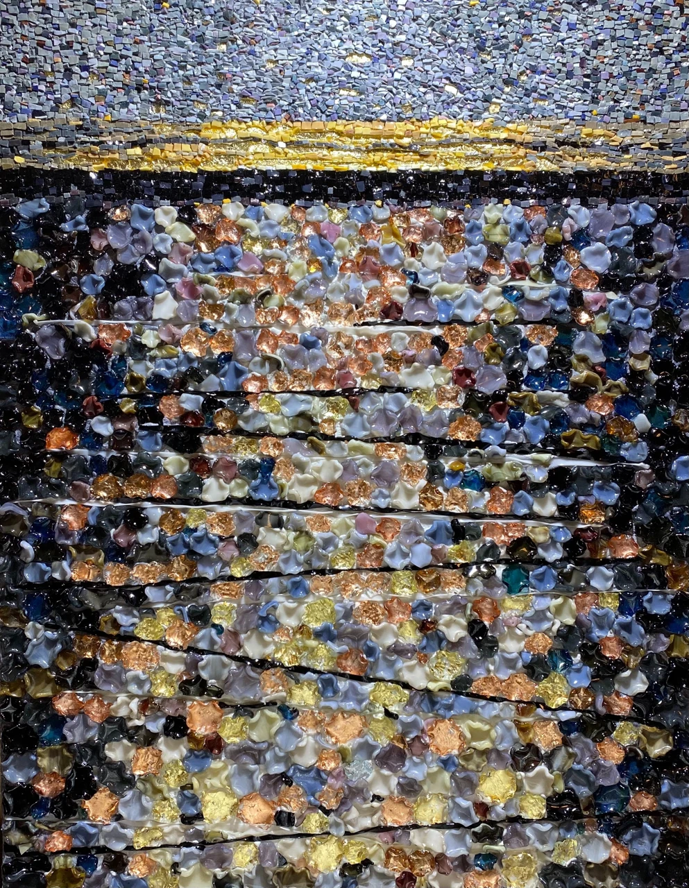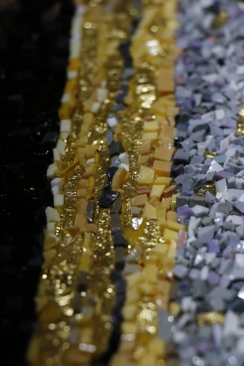 Мозаичное панно выполнено в авторской технике из стеклянных элементов, каждый из которых изготовлен вручную. Трёхмерные овальные «мазки» из стекла передают покой воды на закате.