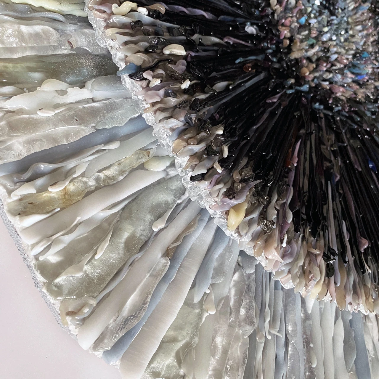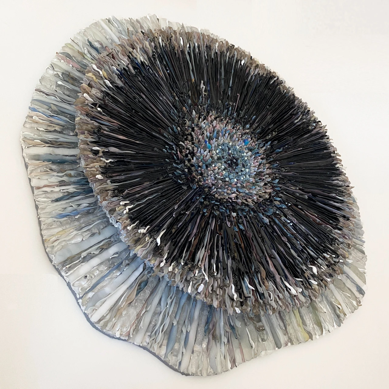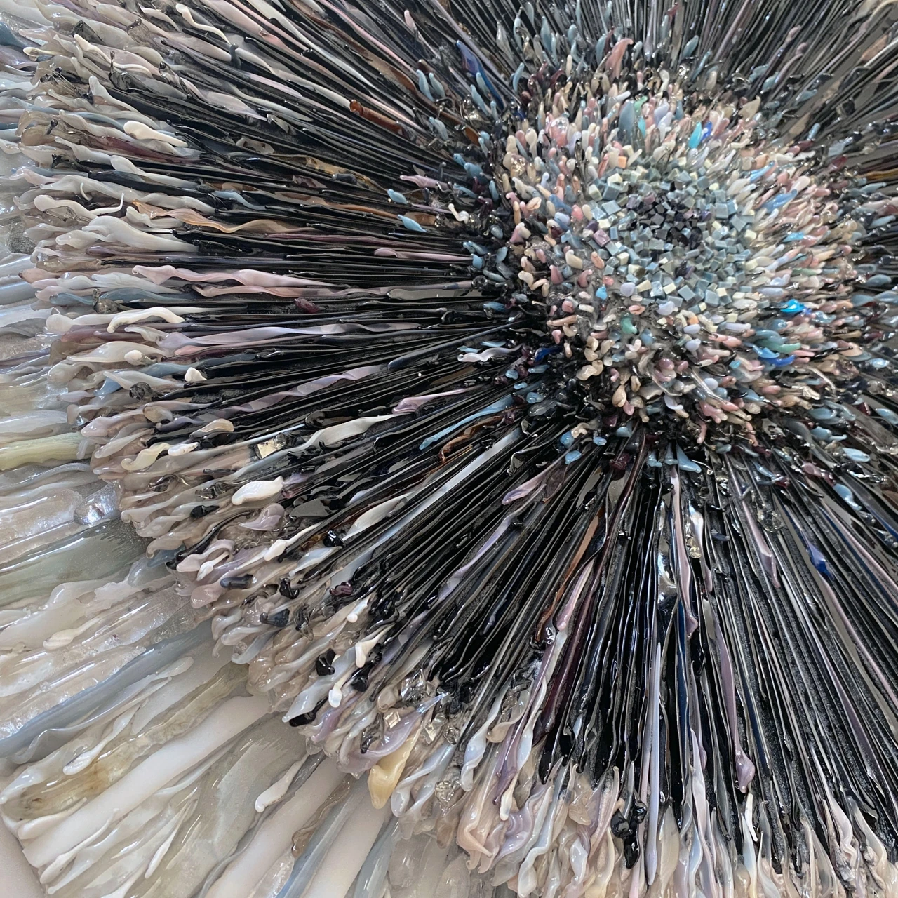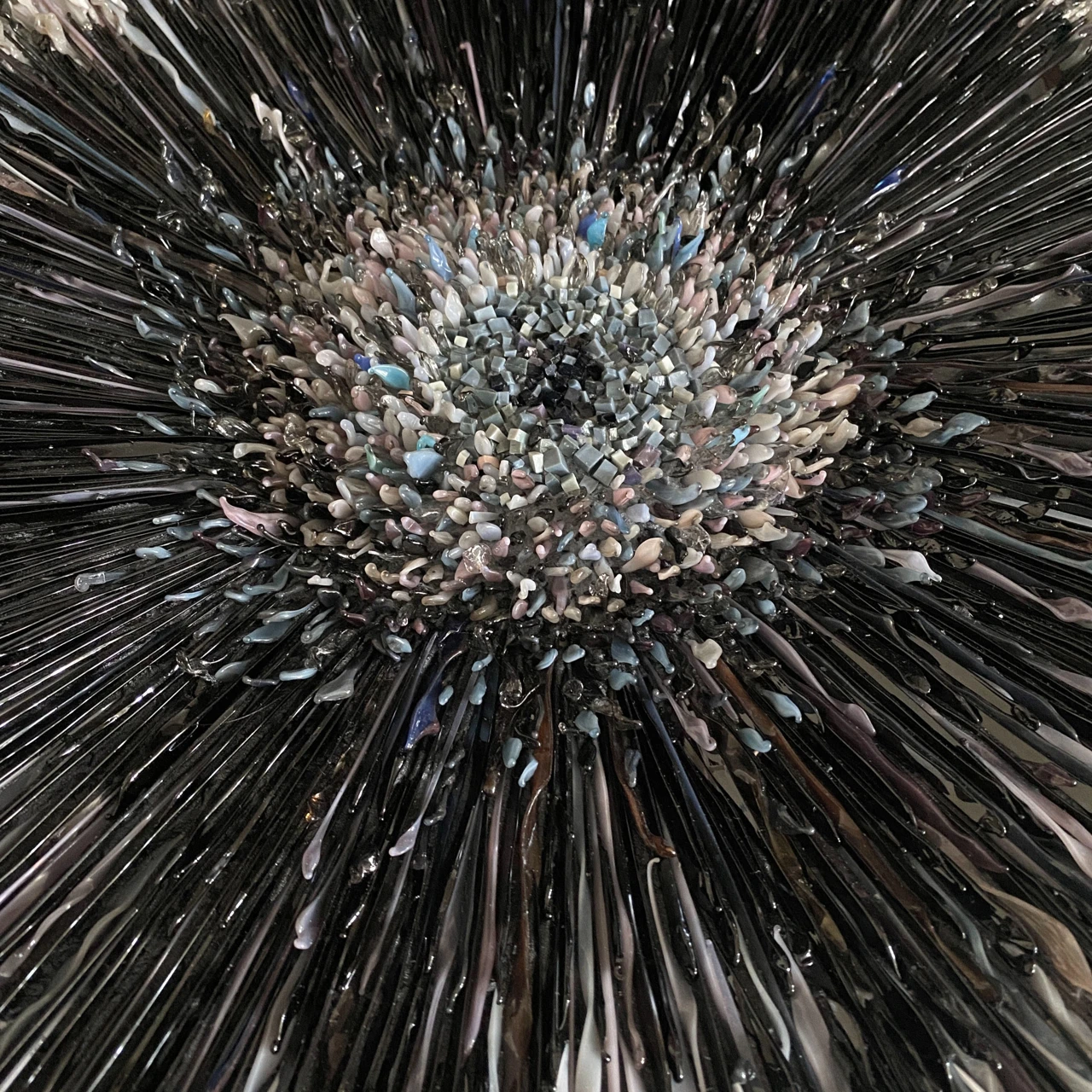 Объемное мозаичное панно выполнено в авторской технике мозаики из стеклянных элементов, каждый из которых выплавлен вручную. Панно состоит из двух слоев, светлого и темного.