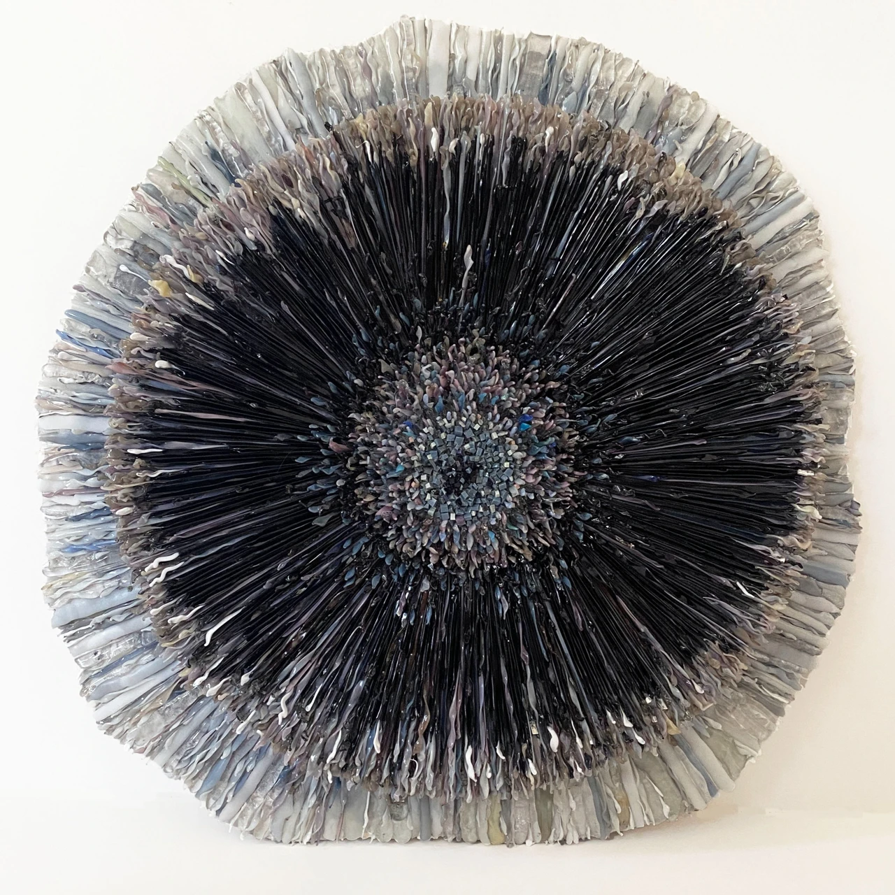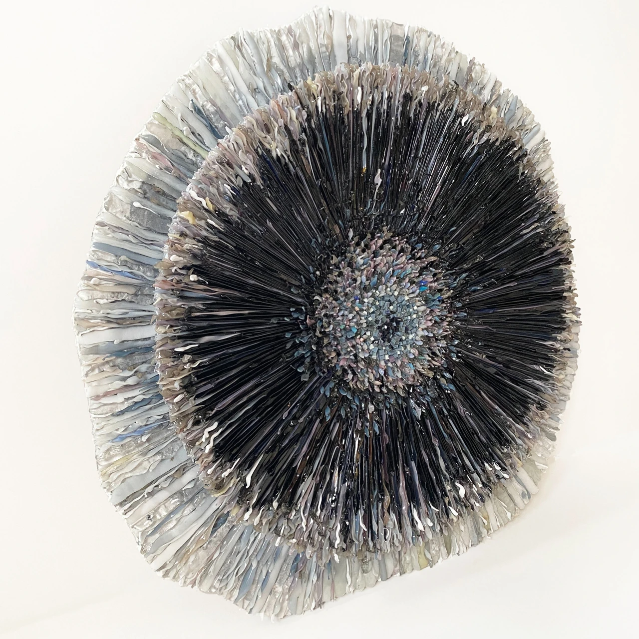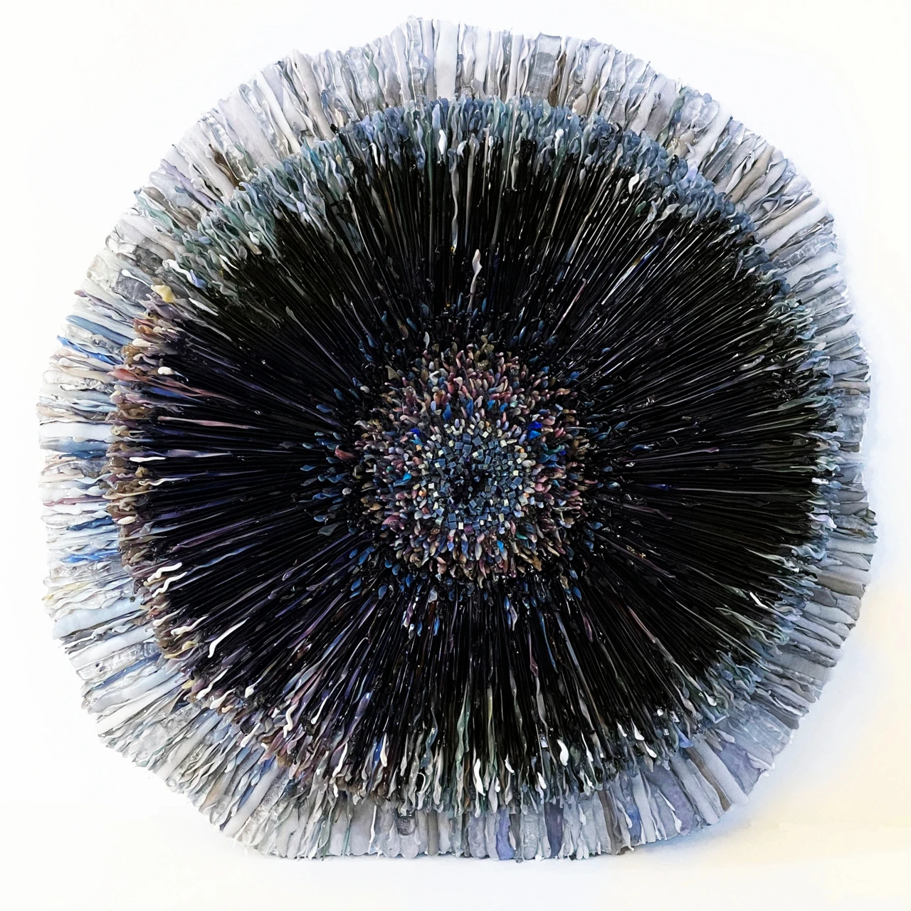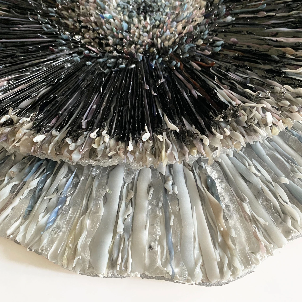 Объемное мозаичное панно выполнено в авторской технике мозаики из стеклянных элементов, каждый из которых выплавлен вручную. Панно состоит из двух слоев, светлого и темного.